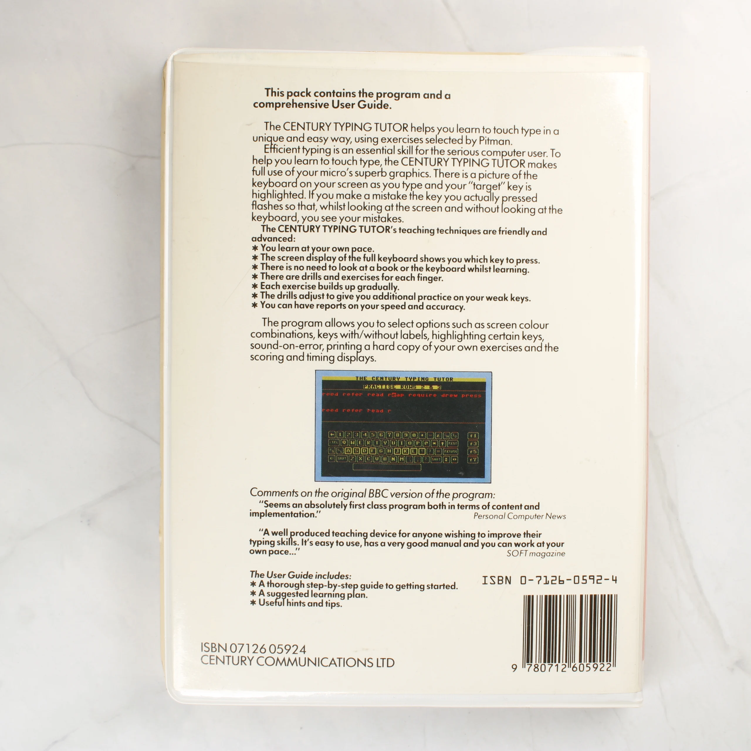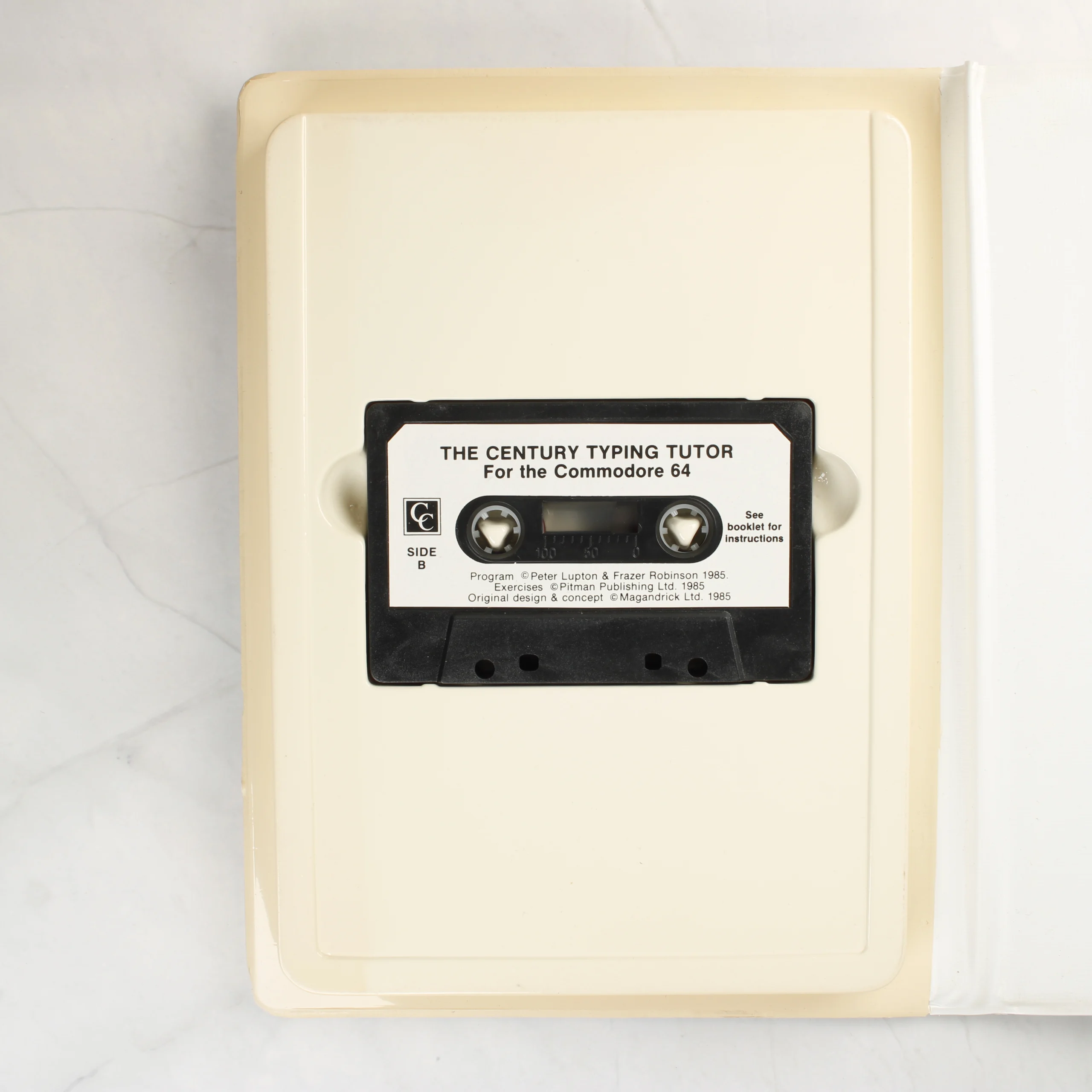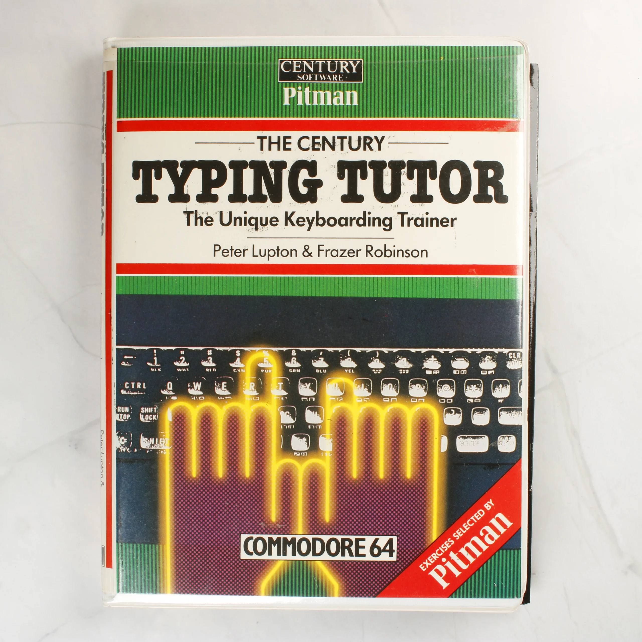 A Century Software által kiadott The Century Typing Tutor egy gépírásoktató szoftver Commodore 64 számítógéphez. A csomag egy nagyméretű, fehér műanyag tokban található, amely tartalmazza az adattároló kazettát és a felhasználói útmutatót. A borítón zöld és fehér sávok láthatóak, központi elemként egy stilizált billentyűzet és egy sárga körvonalú kézpár jelenik meg. A fekete színű kazetta fehér címkével rendelkezik, amelyen a program címe és a készítők nevei olvashatóak. A hátoldalon részletes leírás található a program funkcióiról, képernyőfotóval és ISBN azonosítóval kiegészítve. A tok és a belső rész tiszta, megkímélt állapotú, a műanyag felületeken csak minimális elszíneződés vagy használati nyom látható.