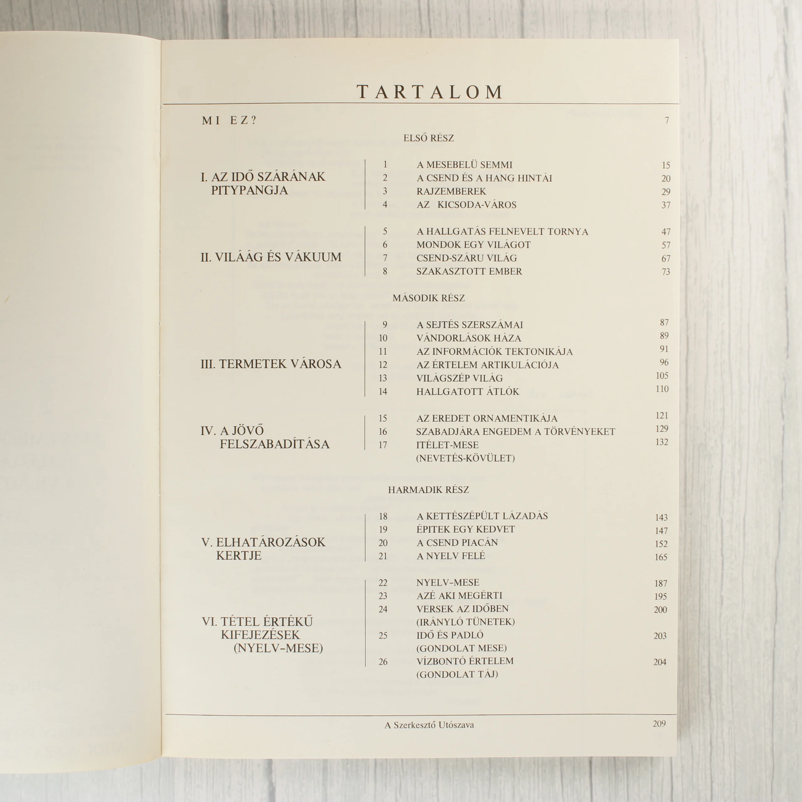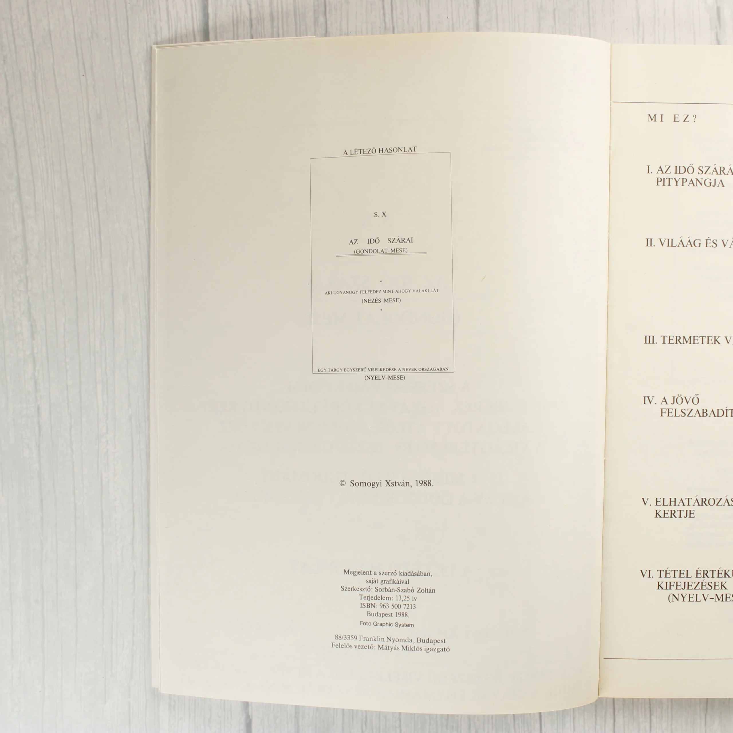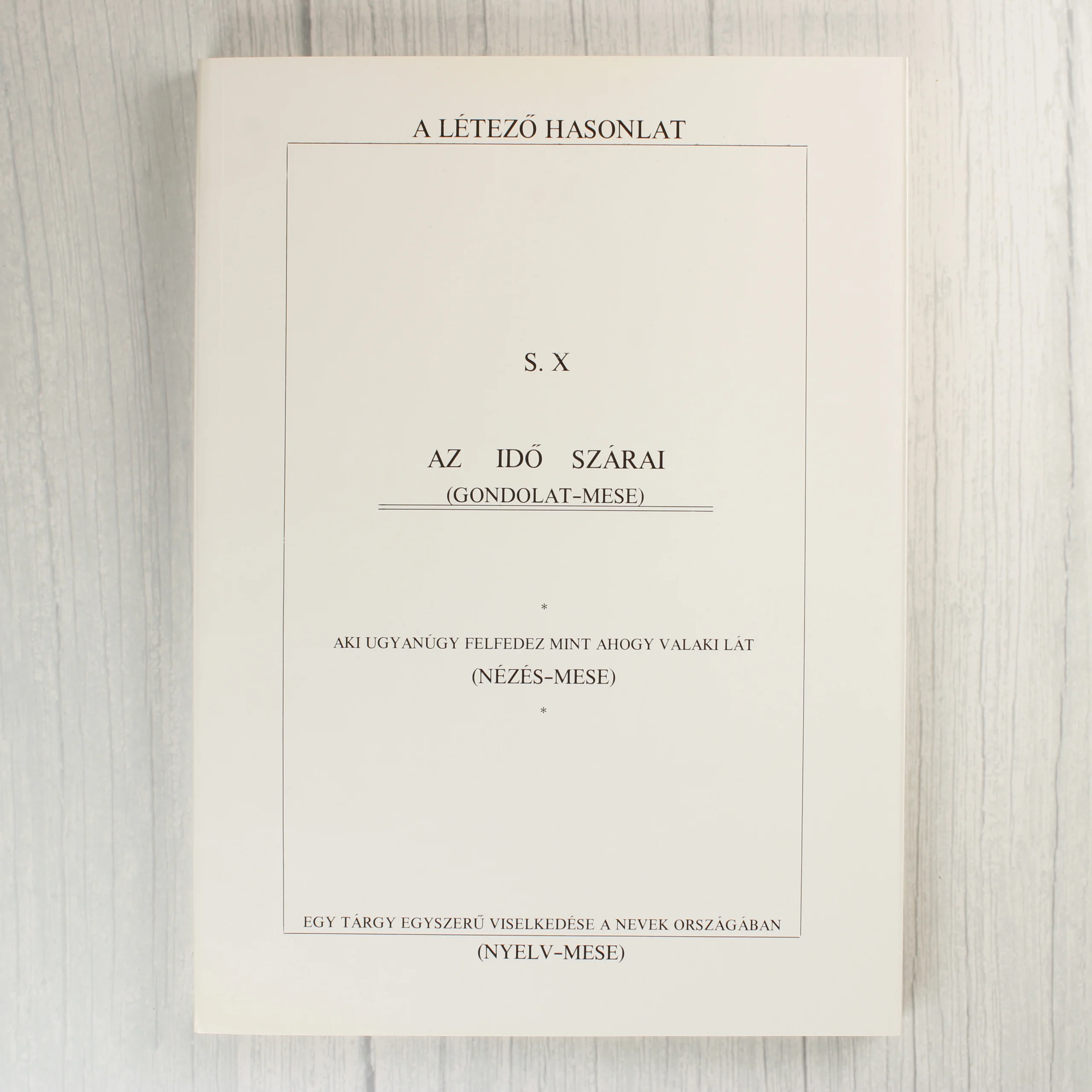Somogyi Xstván A létező hasonlat című műve, amely 1988-ban jelent meg a szerző saját kiadásában. A puhafedeles könyv borítója minimalista stílusú, krémszínű alapon fekete feliratokkal és vékony kerettel. A kötet alcímei között szerepel az Az idő szárai (gondolat-mese), az Aki ugyanúgy felfedez mint ahogy valaki lát (nézés-mese) és az Egy tárgy egyszerű viselkedése a nevek országában (nyelv-mese). A belső oldalakon a szöveg egyedi tipográfiával, tördelt sorokkal és néhol grafikai elemekkel jelenik meg. A hátoldalon további fejezetcímek olvashatók. A kiadvány ISBN száma 963 500 7213.