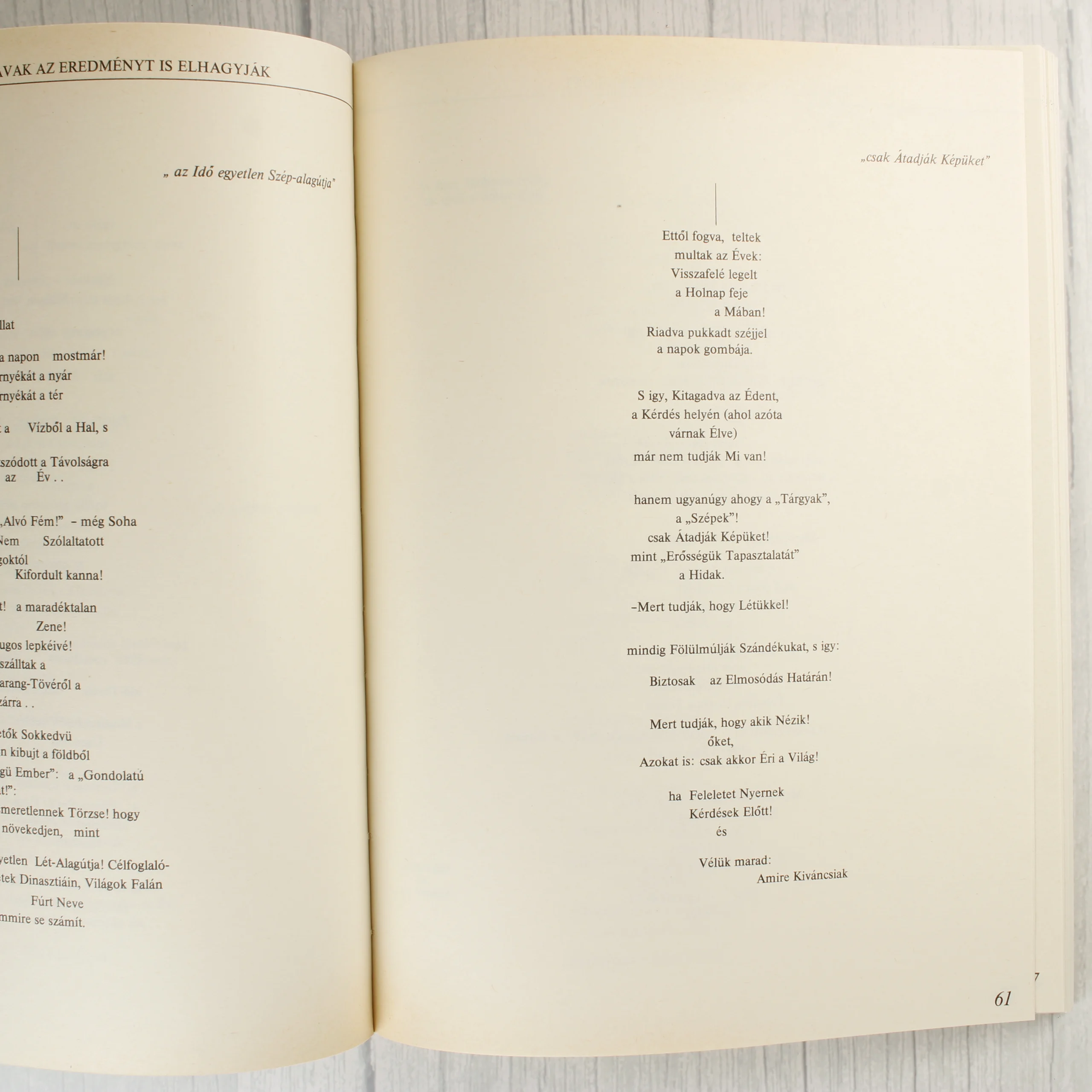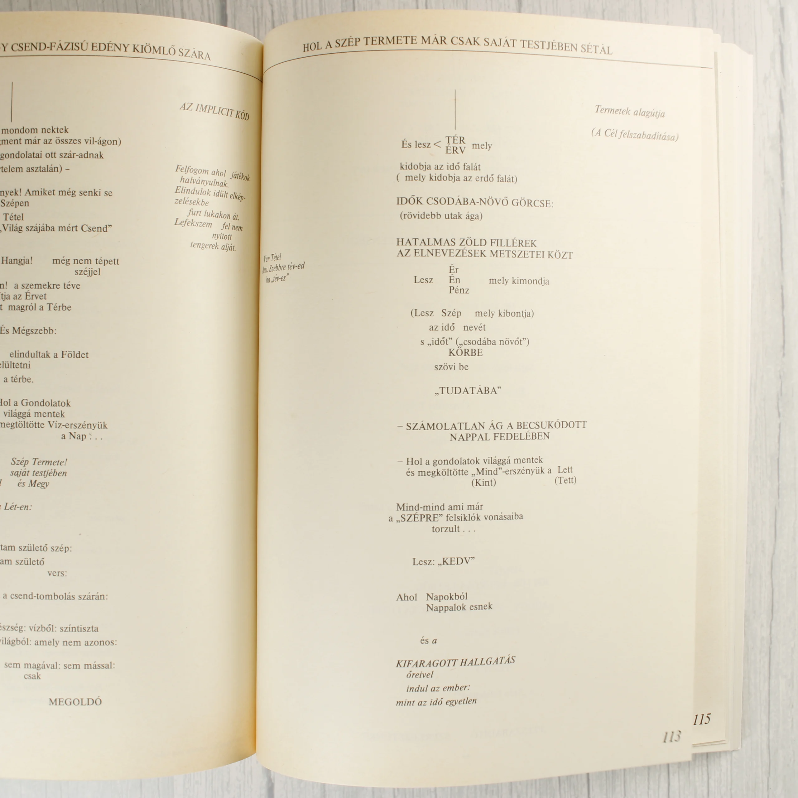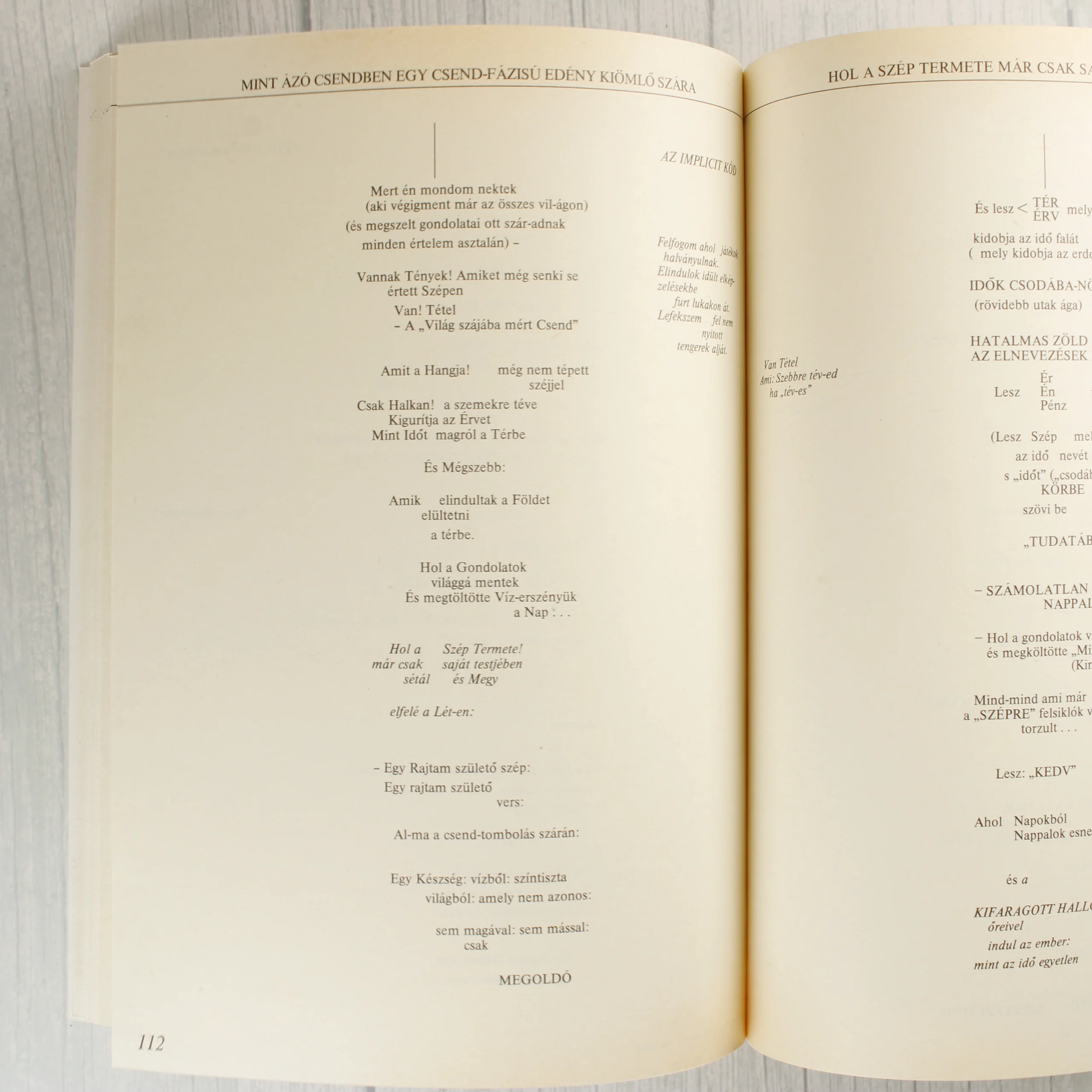 Somogyi Xstván A létező hasonlat című műve, amely 1988-ban jelent meg a szerző saját kiadásában. A puhafedeles könyv borítója minimalista stílusú, krémszínű alapon fekete feliratokkal és vékony kerettel. A kötet alcímei között szerepel az Az idő szárai (gondolat-mese), az Aki ugyanúgy felfedez mint ahogy valaki lát (nézés-mese) és az Egy tárgy egyszerű viselkedése a nevek országában (nyelv-mese). A belső oldalakon a szöveg egyedi tipográfiával, tördelt sorokkal és néhol grafikai elemekkel jelenik meg. A hátoldalon további fejezetcímek olvashatók. A kiadvány ISBN száma 963 500 7213.