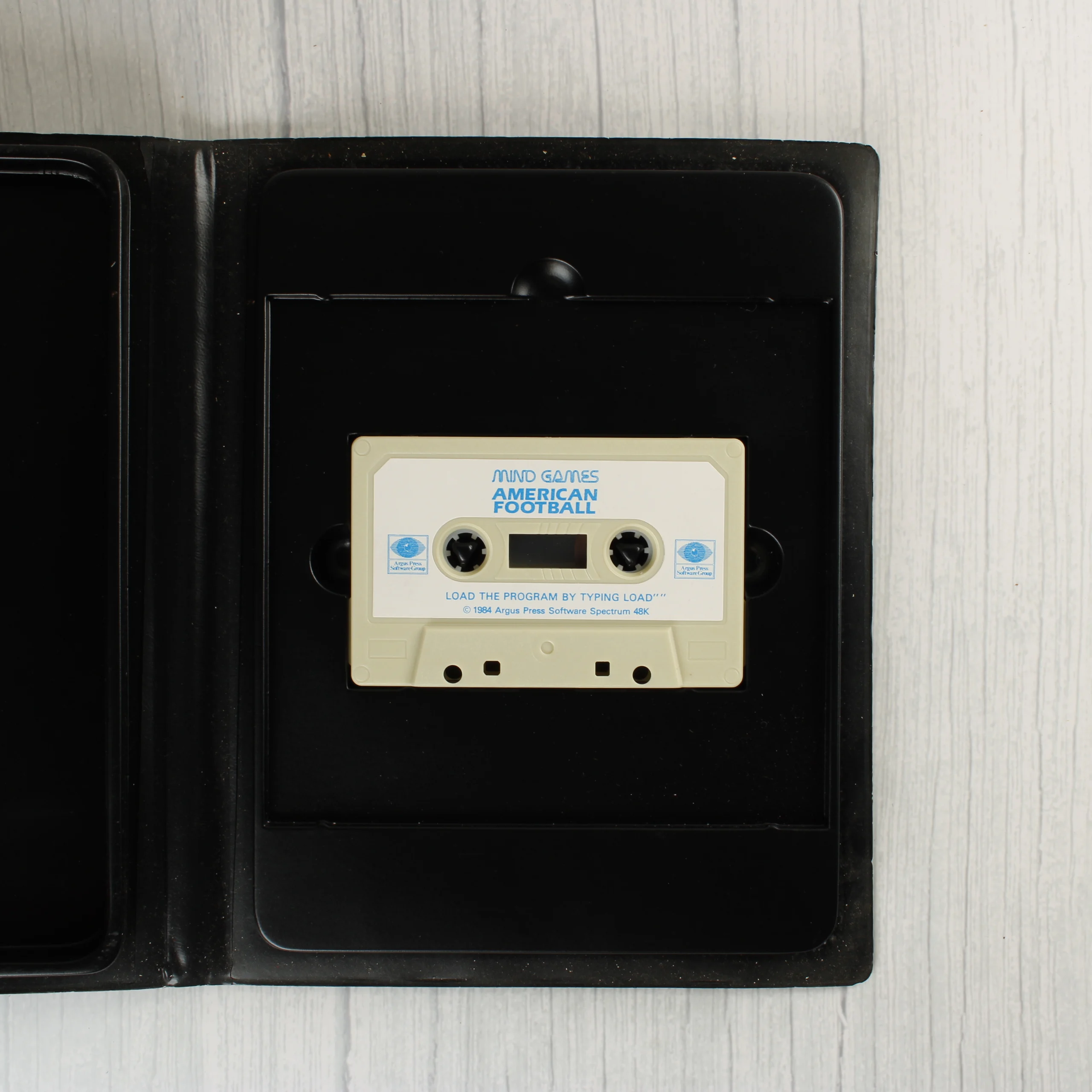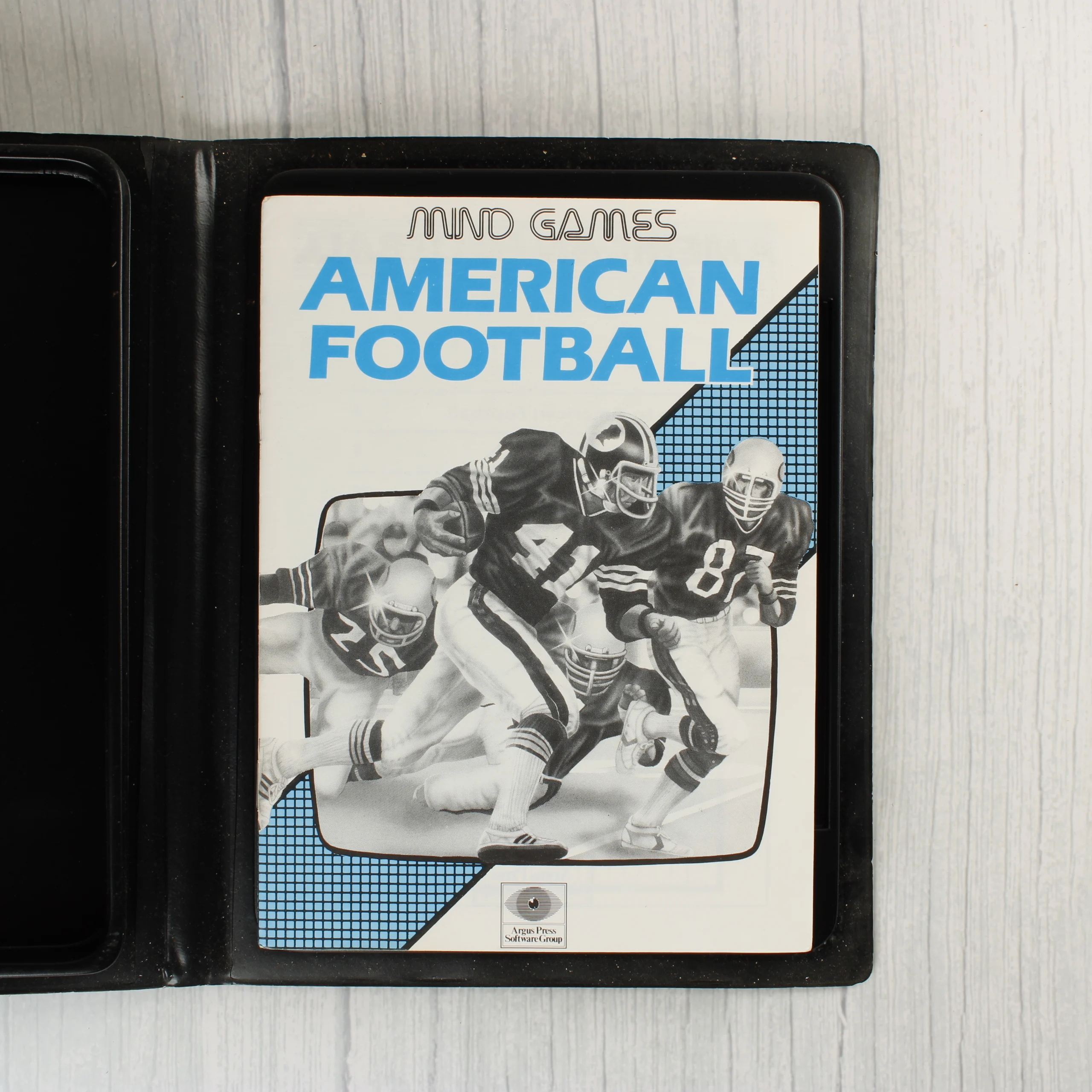 Az American Football egy ZX Spectrum 48k számítógépre megjelent stratégiai szimulációs videójáték. A csomag tartalmazza az eredeti fekete műanyag tokot, a színes borítót, egy belső használati útmutatót és a szoftvert tartalmazó magnókazettát. A borítón amerikai futballjátékosok láthatóak akció közben, piros és kék mezben. A kazetta krémszínű, kék felirattal, rajta a betöltési utasításokkal. A kiadó az Argus Press Software Group, a Mind Games sorozat részeként. A tok és a papíralapú mellékletek épek, a grafika jól kivehető, a színek megőrizték élénkségüket.