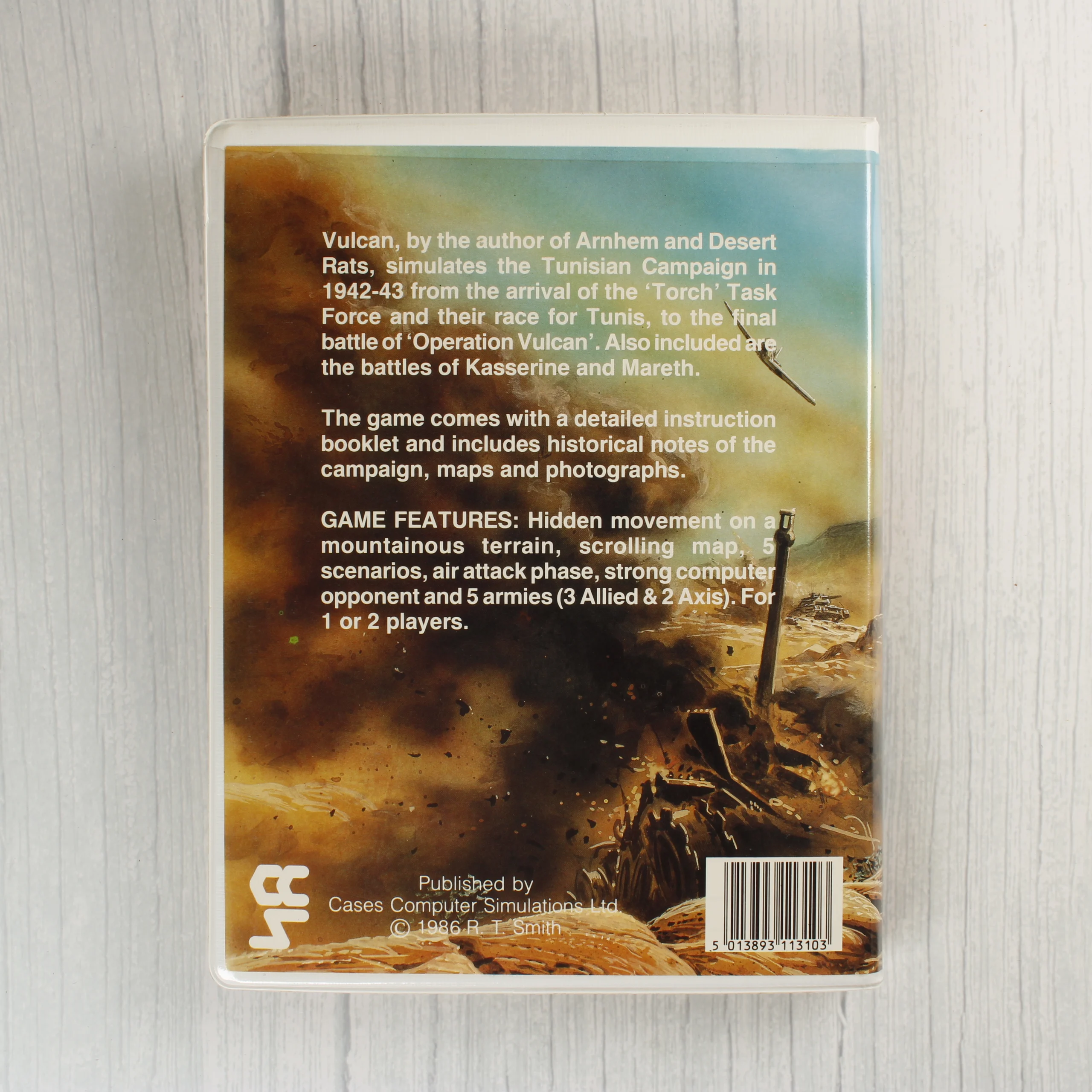 A Vulcan: The Tunisian Campaign egy 1986-os kiadású stratégiai videójáték ZX Spectrum 48K/128K számítógépekre. A csomag egy fehér színű, nagyméretű műanyag tokot tartalmaz, amelyben egy fehér színű kazetta és egy kék borítójú használati útmutató található. A borítón egy második világháborús harci jelenet látható tankokkal, repülőgéppel és katonákkal. A hátoldalon a játék leírása, jellemzői és egy vonalkód szerepel. A belső műanyag tálca sárgás árnyalatú, a kazetta pedig piros felirattal van ellátva. A kiadvány a Cases Computer Simulations Ltd. gondozásában jelent meg, a játékot R. T. Smith tervezte.