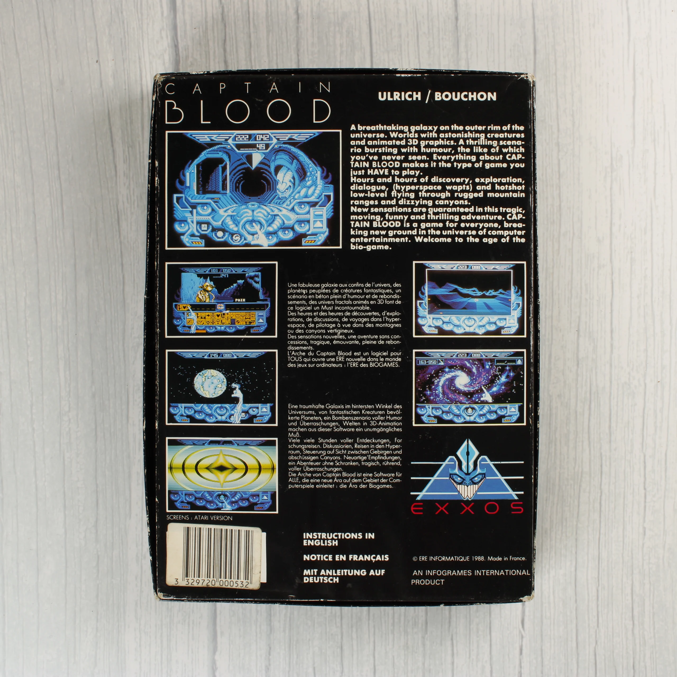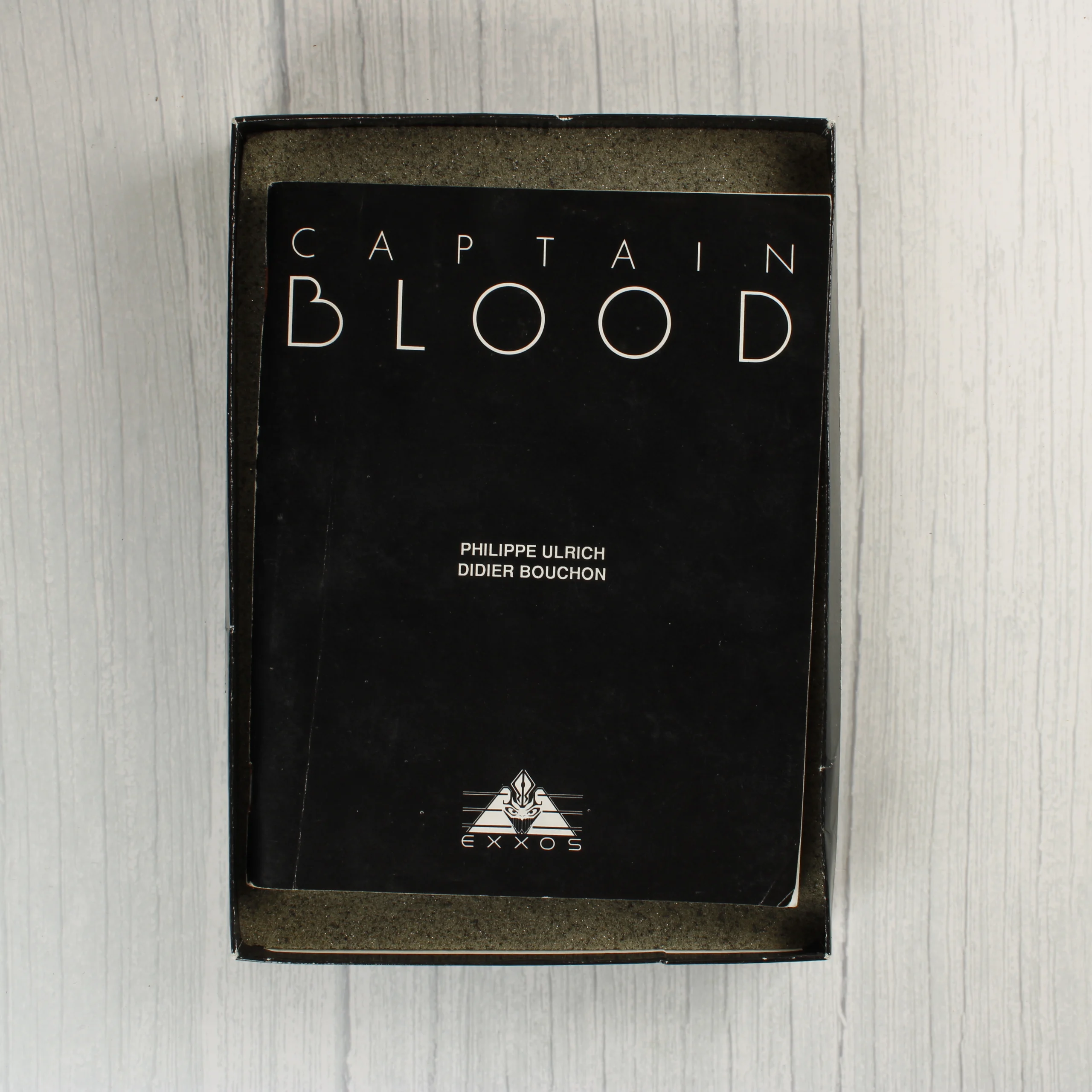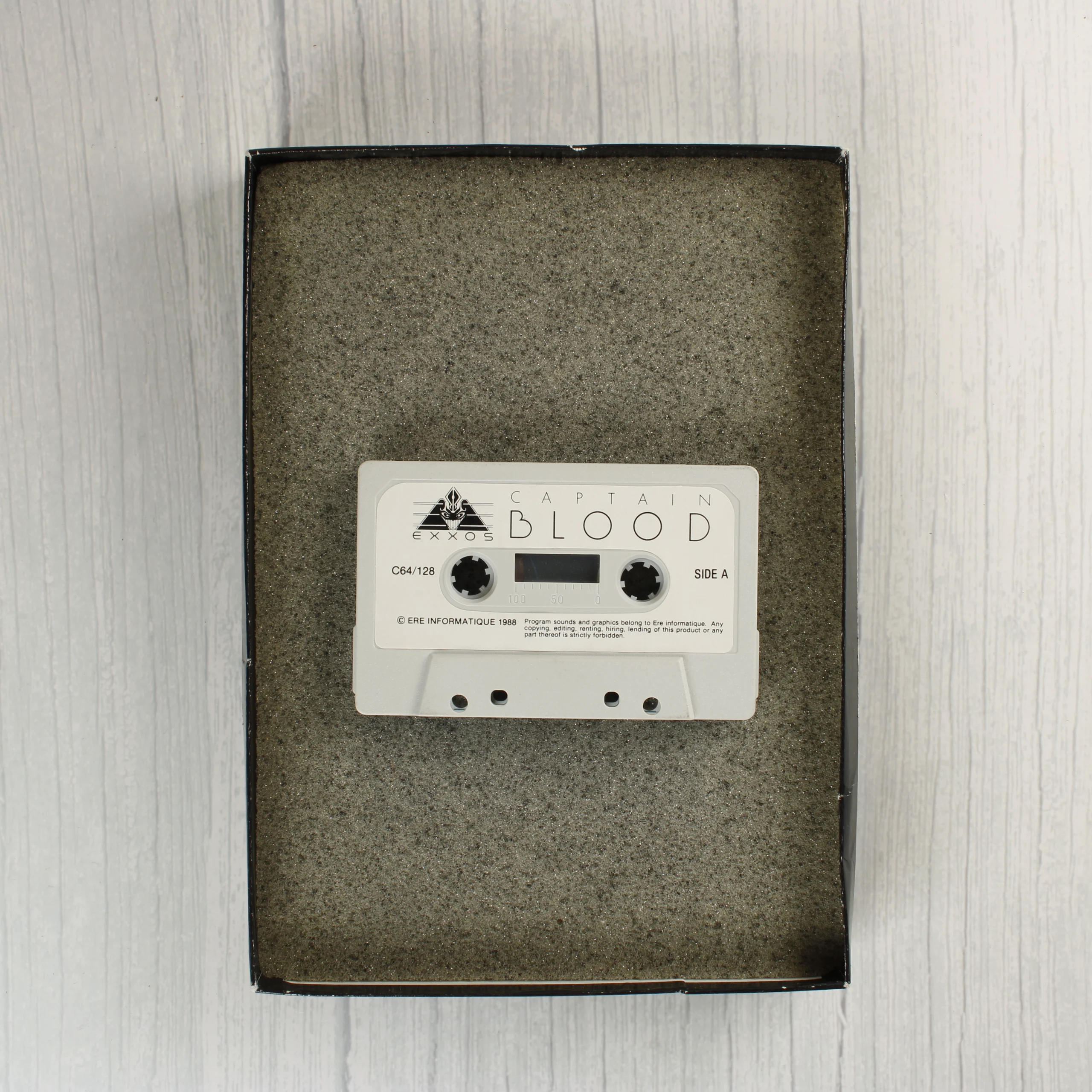 A Captain Blood című videójáték Commodore 64/128 platformra készült kiadása. A csomag egy fekete alapszínű, galaxist ábrázoló illusztrációval ellátott kartondobozt, egy fekete borítójú használati útmutatót és egy szürke színű magnókazettát tartalmaz. A doboz elején fehér betűkkel olvasható a cím, a bal alsó sarokban pedig egy kerek matrica jelzi a kompatibilitást. A hátoldalon többnyelvű leírás és képernyőmentések láthatóak a játékból. A kazetta egy szivacsos bélésben helyezkedik el a dobozon belül. A terméken egy sárga árcédula is látható.