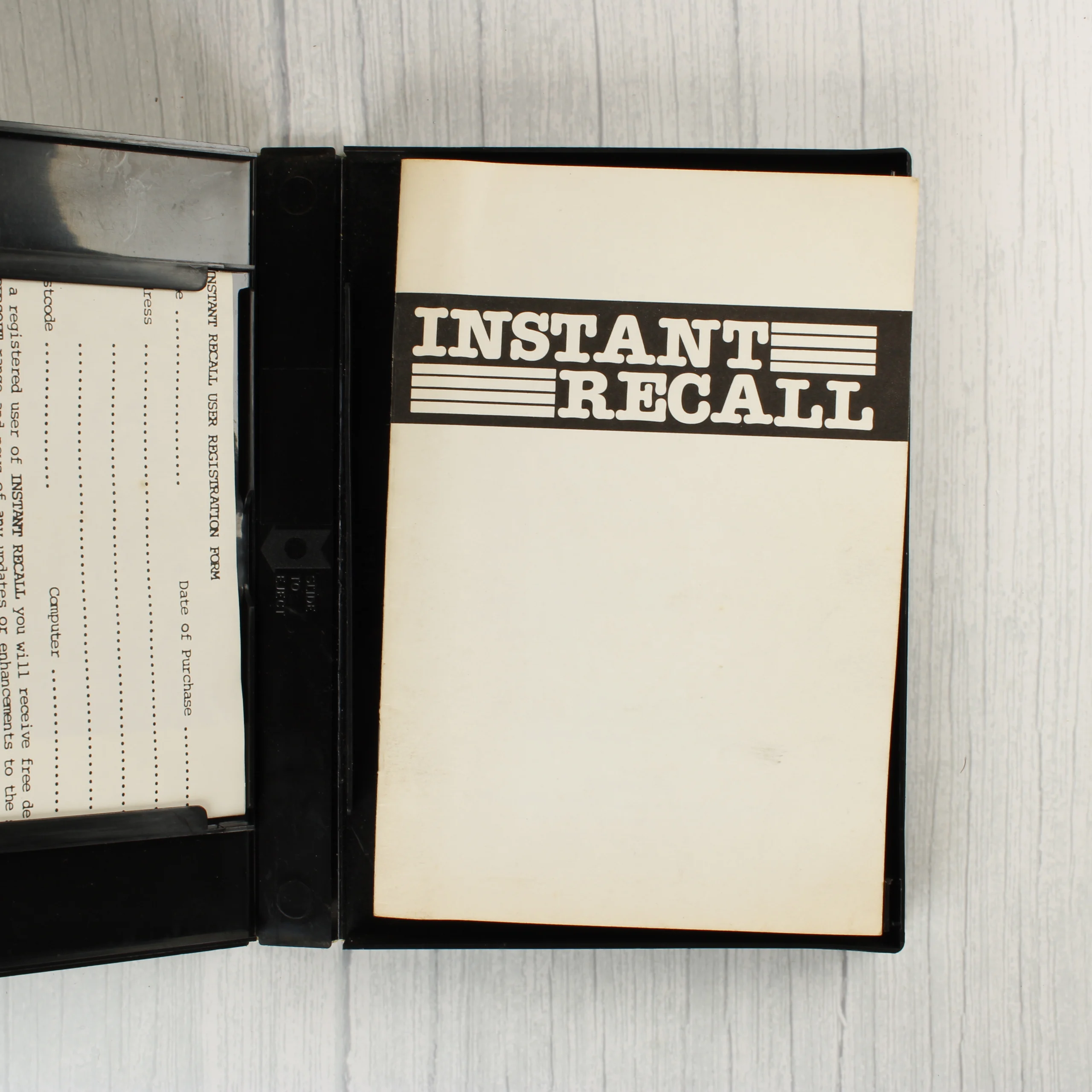 A Supersoft által kiadott Instant Recall egy elektronikus adatnyilvántartó szoftver Amstrad 464, 664 és 6128 számítógépekhez. A csomag egy fekete műanyag tokban található, amely tartalmaz egy magnetofonkazettát és egy 3 colos floppy lemezt is. A borítón egy iratszekrényt ábrázoló illusztráció látható szobanövénnyel és tűzőgéppel. A készlet részét képezi továbbá egy nyomtatott használati útmutató és egy felhasználói regisztrációs lap. A hordozókon látható feliratok szerint a szoftver 1985-ös és 1986-os szerzői jogi adatokkal rendelkezik. A tok és a papíralapú mellékletek koruknak megfelelő, megkímélt állapotban vannak, a papír enyhén sárgult.