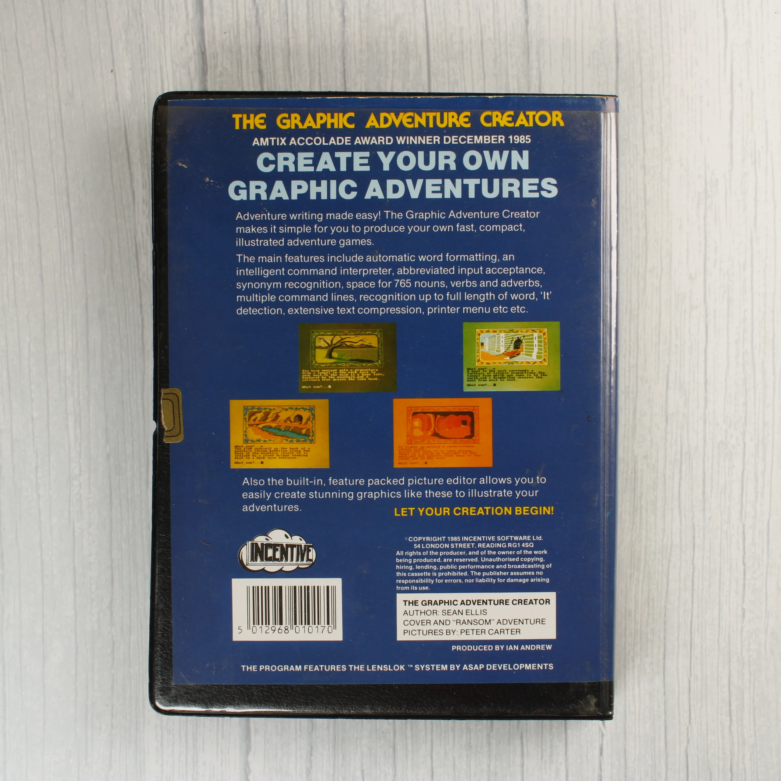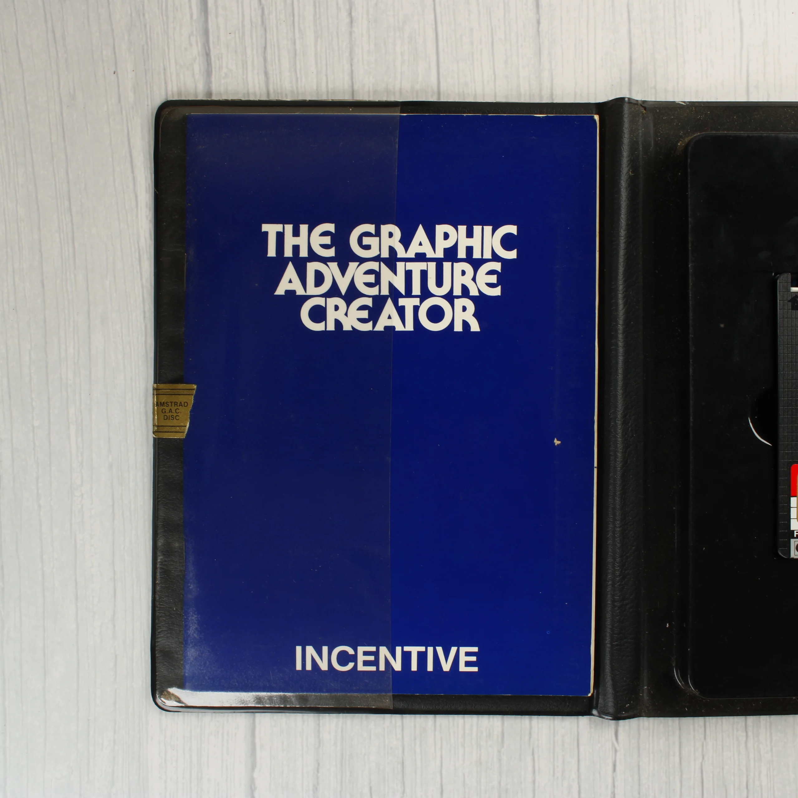 Az Incentive Software által kiadott The Graphic Adventure Creator egy Amstrad platformra készült szoftvercsomag. A fekete színű, műanyag borítású tok egy 3 colos floppy lemezt, egy kék borítójú használati útmutatót és egy kék színű Lenslok biztonsági eszközt tartalmaz. A külső borítón színes illusztráció látható, amely egy barlang előtt harcoló lovagot, egy nőt és egy szörnyeteget ábrázol. A hátoldalon a program funkciói olvashatók angol nyelven, képernyőmentésekkel kiegészítve. A floppy lemez címkéje piros és fehér színű, rajta az Amstrad G.A.C. Disc felirat szerepel. A csomagolás és a tartozékok a koruknak megfelelő állapotban vannak, a tok szélein és a borítón enyhe kopásnyomok láthatók.