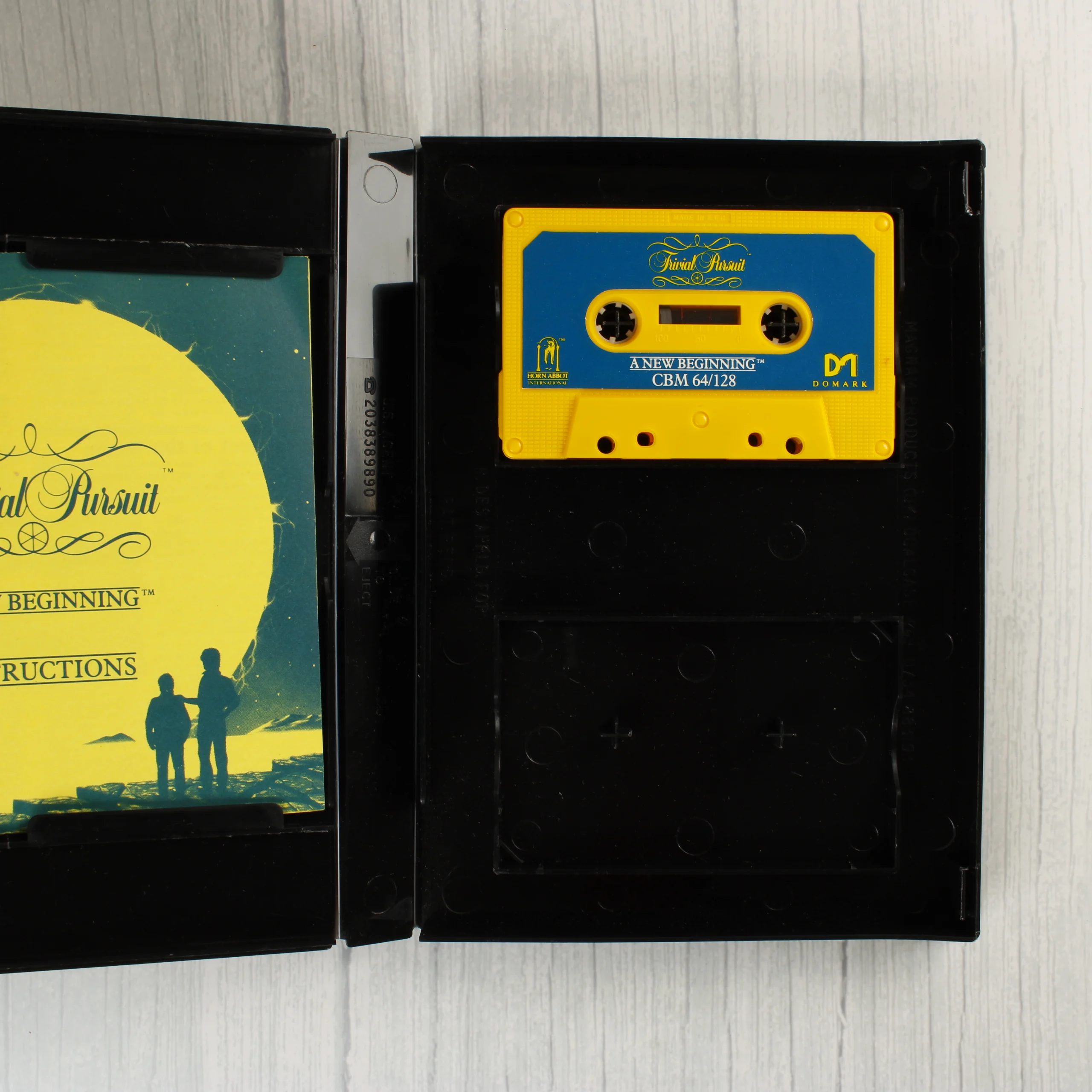 A Trivial Pursuit: A New Beginning című videójáték Commodore 64/128 platformra készült kiadása. A csomag egy fekete műanyag tokot tartalmaz, amelyben egy sárga színű, kék címkés kazetta és egy használati útmutató található. A borítón egy nagyméretű sárga nap előtt álló két alak sziluettje látható, repedezett talajon. A hátoldalon angol nyelvű leírás és három színes képernyőkép mutatja be a játékmenetet. A kiadó a Domark, a fejlesztésben az Oxford Digital Enterprises és a Horn Abbot International vett részt. A tokon régi árcédula vagy ragasztómaradvány látható a jobb felső sarokban.