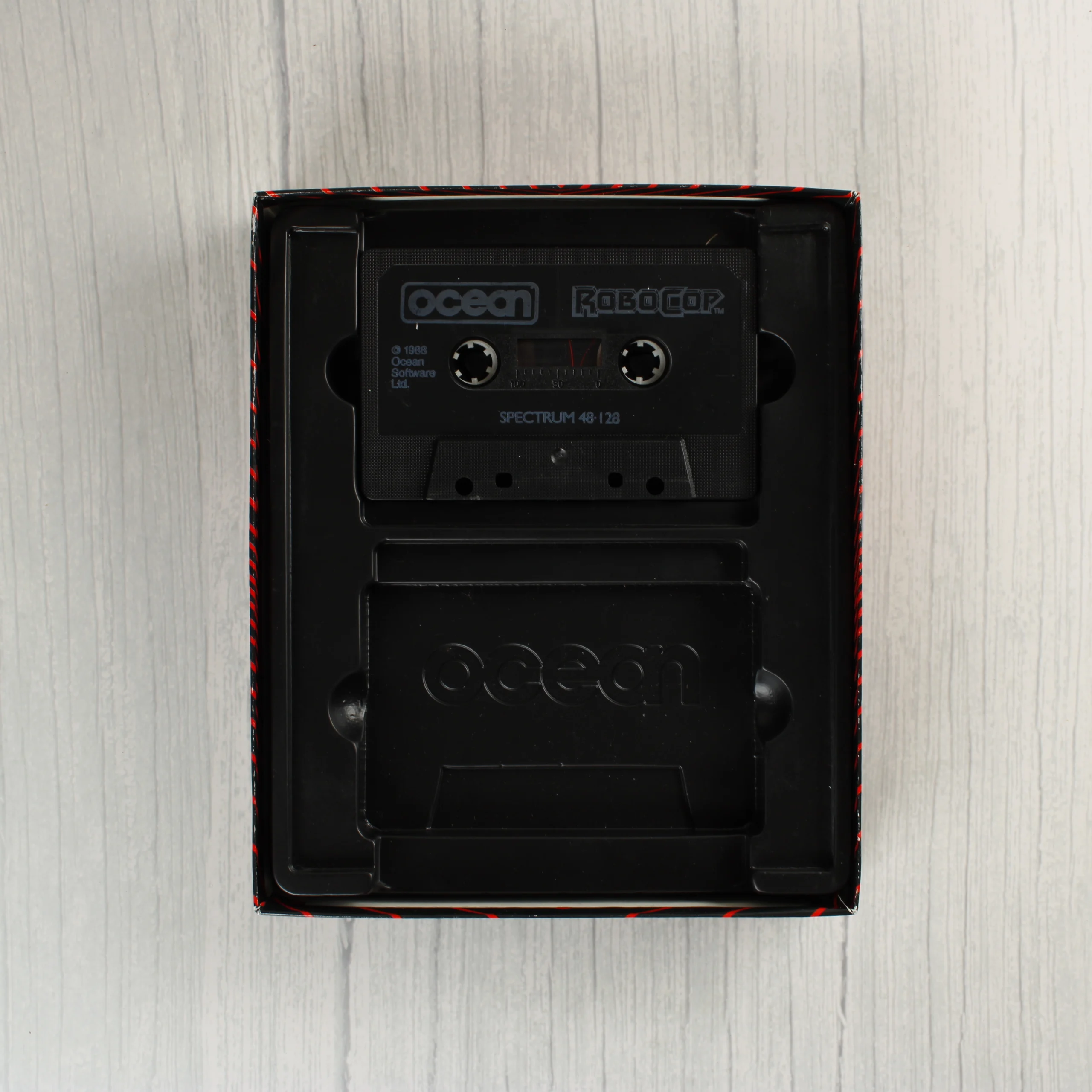 A RoboCop videójáték ZX Spectrum 48/128 platformra készült kiadása, amelyet az Ocean Software jelentetett meg 1988-ban. A csomag egy nagyméretű, színes kartondobozt tartalmaz, amelynek elején a film ikonikus jelenete látható a főhőssel és egy rendőrautóval. A doboz belsejében egy fekete műanyag tálca található, amelyben egy darab fekete színű kazetta helyezkedik el. A kazetta címkéjén fehér feliratok olvashatók. A készlet részét képezi továbbá egy összehajtogatott, színes poszter is, amely a borítókép grafikáját ábrázolja. A doboz hátoldalán több játékmenet-fotó és angol nyelvű leírás látható. A csomagoláson az éleknél és a sarkoknál kisebb kopások, valamint némi benyomódás figyelhető meg, de a grafika ép és élénk színű.