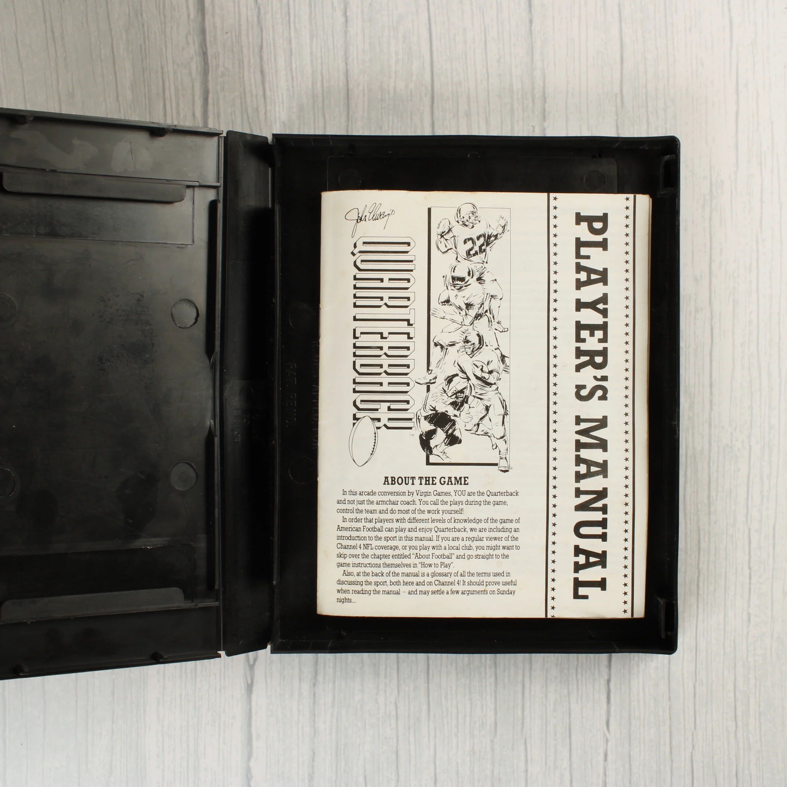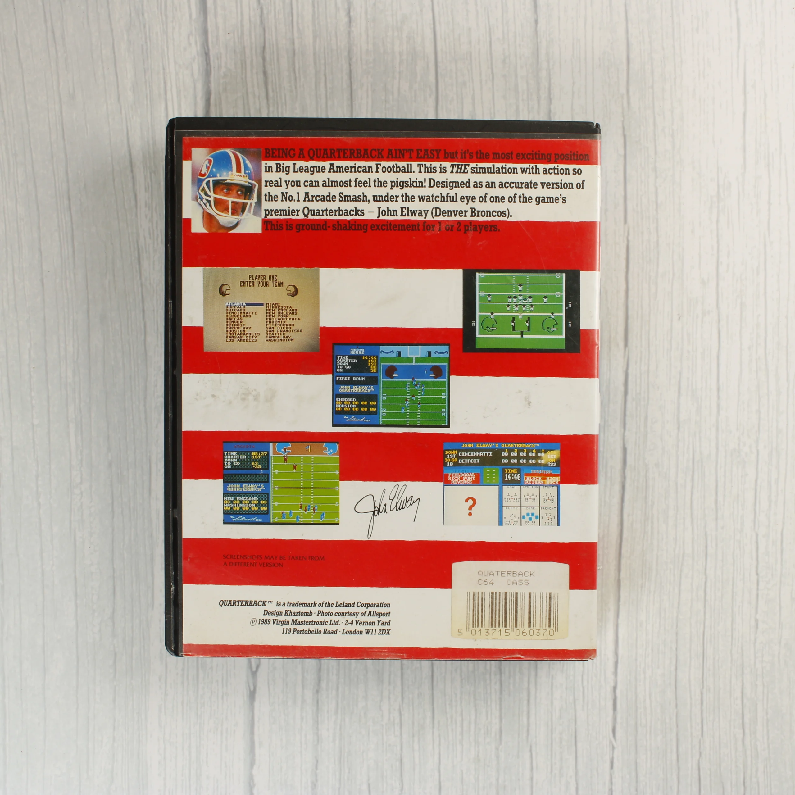 A John Elway's Quarterback egy amerikai futball szimulátor videójáték Commodore 64 platformra. A csomag tartalmazza az eredeti fekete műanyag tokot, a színes borítót, a használati útmutatót és a fehér színű mágnesszalagos kazettát. A borítón John Elway látható akció közben, az amerikai zászló motívumaival a háttérben. A hátoldalon játékmenet-fotók és angol nyelvű leírás található. A kazetta fehér műanyag házas, fekete felirattal, rajta a Virgin Games logójával és a CBM 64 jelzéssel. A belső füzet fekete-fehér illusztrációkat tartalmaz. A tok és a papíralapú mellékletek koruknak megfelelő állapotban vannak, a borítón és a füzeten enyhe sárgulás és használati nyomok láthatóak.