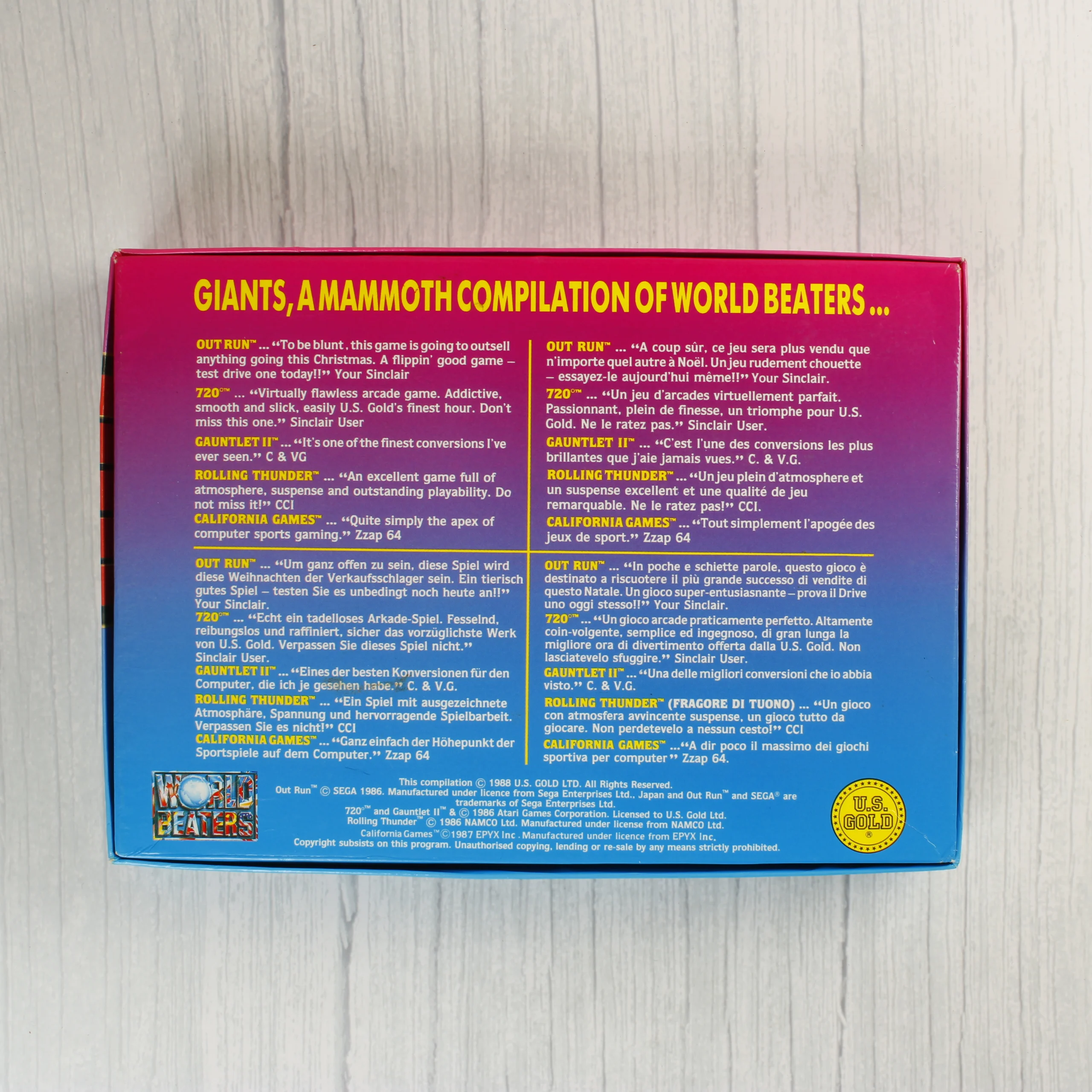 A Giants: World Beaters videójáték-válogatás Commodore 64/128 platformra. A csomag öt klasszikus játékot tartalmaz: Rolling Thunder, Gauntlet II, 720°, Out Run és California Games. A készlet három darab fekete színű, fehér címkés magnókazettát foglal magában, amelyek egy fekete műanyag tálcában helyezkednek el a színes kartondobozon belül. A doboz előlapján nagy, aranyszínű 'GIANTS' felirat látható, alatta a játékok borítóképeivel. A hátoldalon többnyelvű leírások és kritikai idézetek olvashatók. A kiadvány az U.S. Gold gondozásában jelent meg 1988-ban.