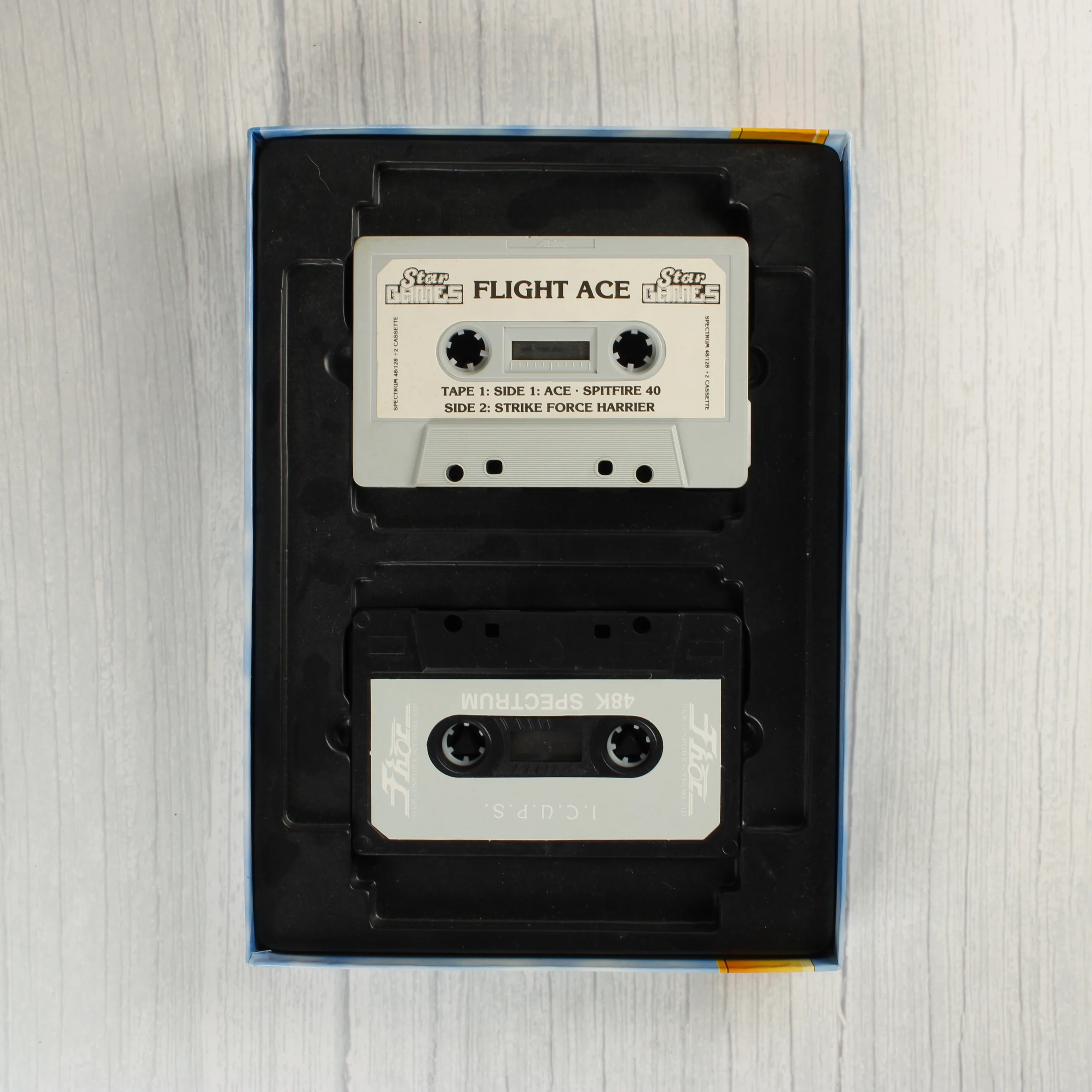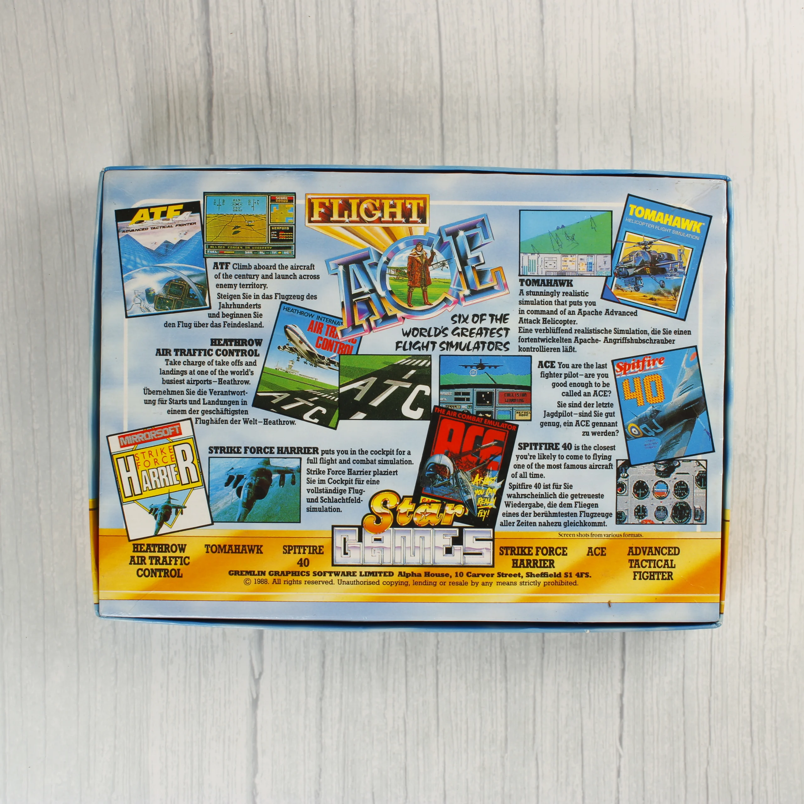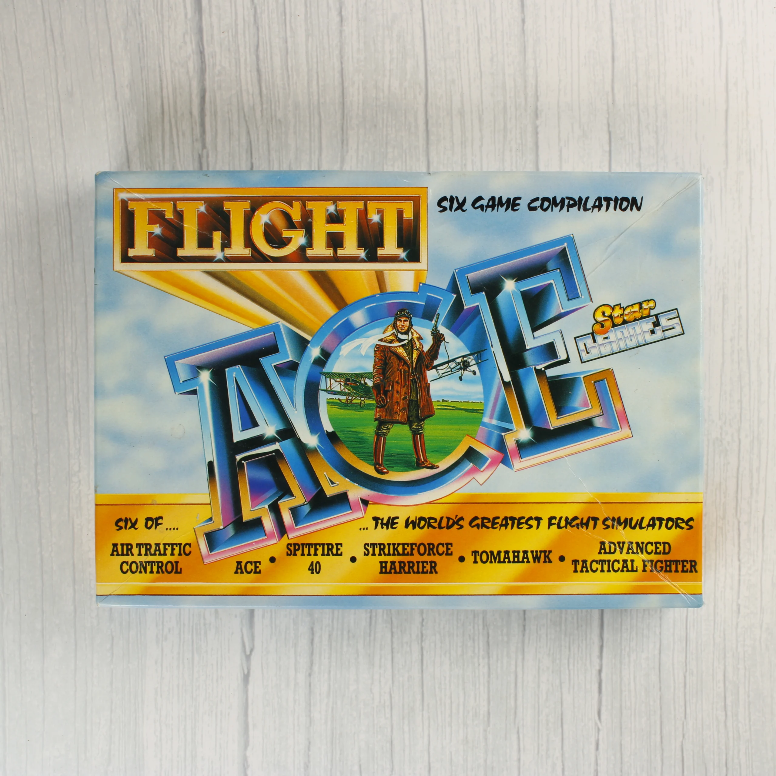 A Flight Ace című videójáték-válogatás eredeti kartondobozos kiadása ZX Spectrum platformra. A csomag hat különböző repülőgép-szimulátort tartalmaz, köztük az Air Traffic Control, Ace, Spitfire 40, Strikeforce Harrier, Tomahawk és Advanced Tactical Fighter címeket. A színes illusztrációval ellátott dobozban egy fekete műanyag tálca található, amely két magnókazettát rögzít. Az egyik kazetta világosszürke, a másik fekete színű, mindkettőn fehér alapon fekete feliratú címkék láthatóak. A doboz hátoldalán a játékokról készült képernyőmentések és rövid leírások szerepelnek angol és német nyelven. A kiadvány a Star Games gondozásában jelent meg 1988-ban.