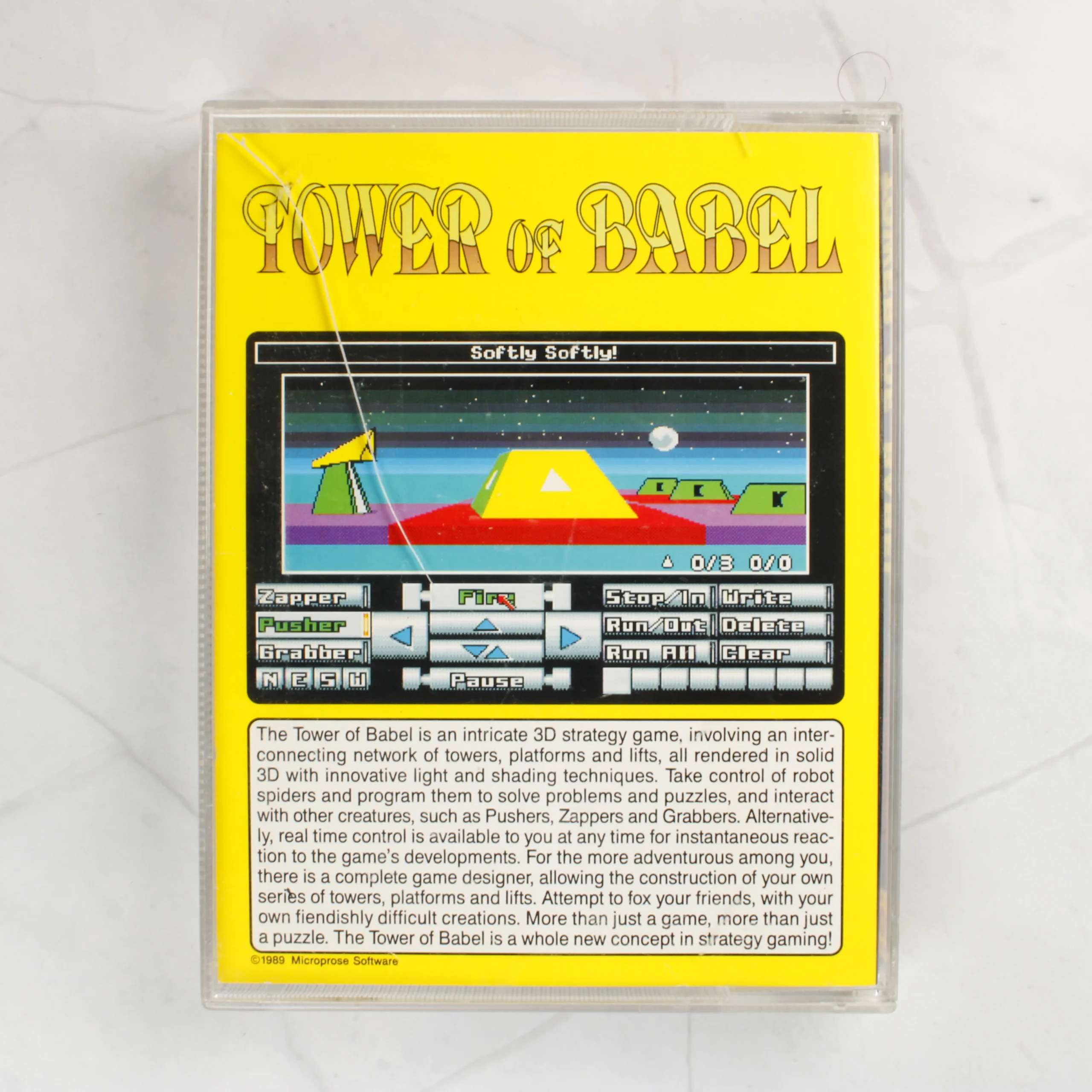 A Tower of Babel egy 3,5 colos floppy lemezen kiadott videójáték Commodore Amiga számítógépekhez. A csomag tartalmazza az eredeti átlátszó műanyag tokot, amelyben a színes borító és a hátoldali sárga információs lap található. A borítón futurisztikus, 3D-s grafika látható, míg a hátoldalon a játékmenet leírása és egy képernyőkép szerepel. A kék színű floppy lemez Astra Pack 10 felirattal és Rainbird logóval ellátott címkével rendelkezik. A kiadvány a Microprose Software gondozásában jelent meg 1989-ben.