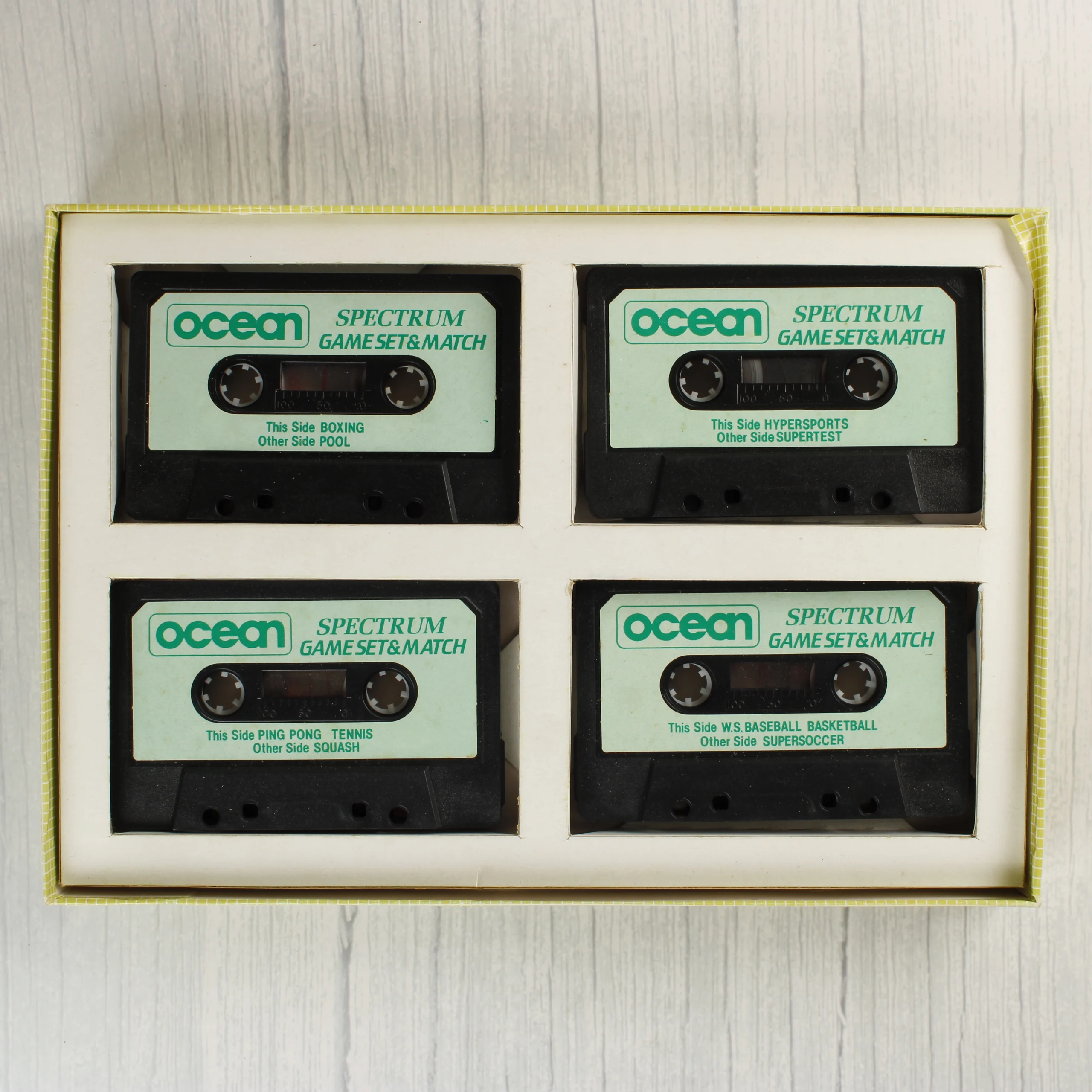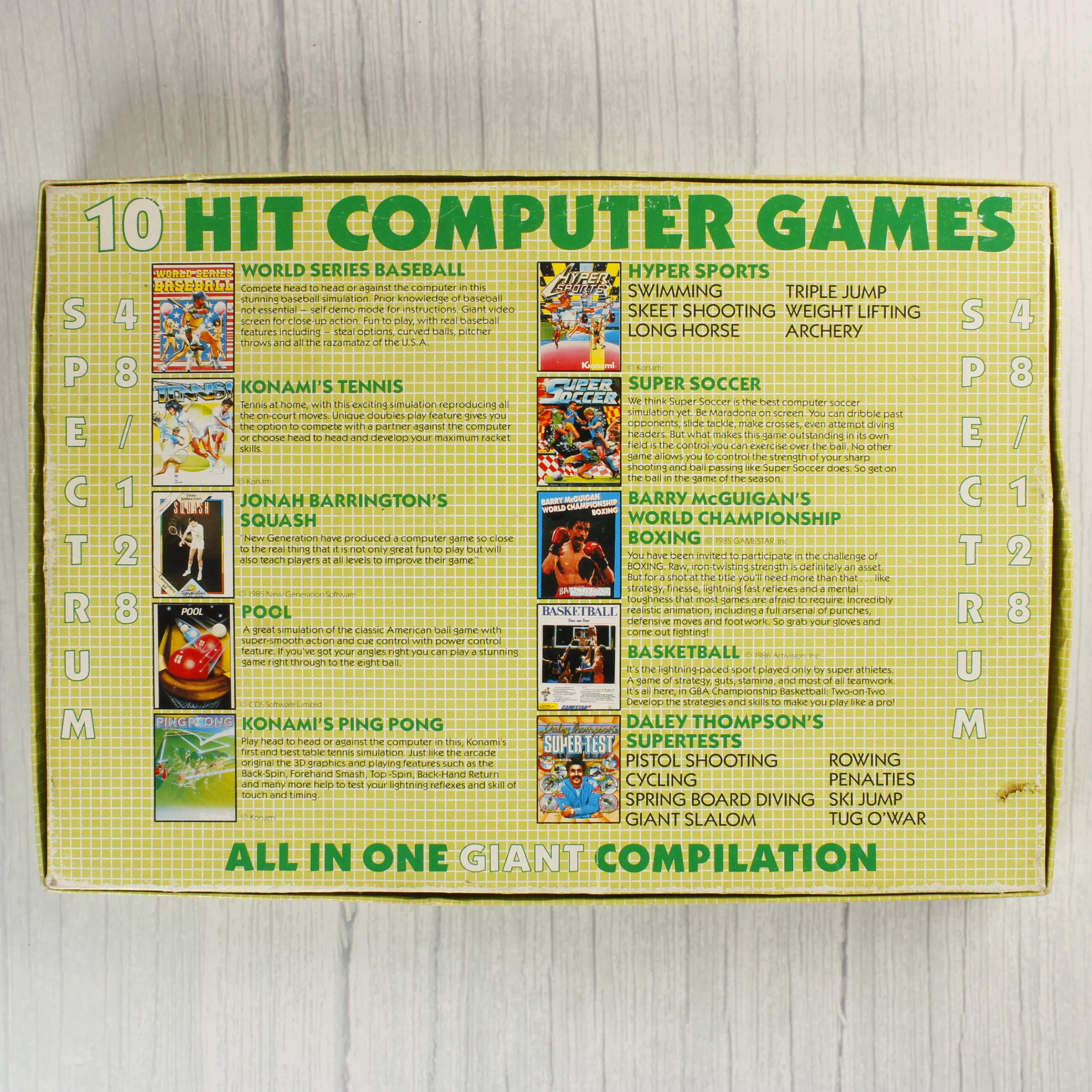 A Game, Set and Match című videójáték-válogatás eredeti kartondoboza látható a képeken. Az Ocean Software által kiadott gyűjtemény 10 sportjátékot tartalmaz, köztük olyan címeket, mint a World Series Baseball, a Konami's Tennis és a Daley Thompson's Supertests. A doboz előlapján színes, sportolókat ábrázoló grafika látható sárga négyzethálós háttérrel. A hátoldalon a csomagban található játékok listája és rövid leírása olvasható, valamint a Spectrum platformra utaló feliratok láthatók. A csomagolás anyaga karton, amelyen az éleknél és a sarkoknál kisebb kopások, benyomódások és a használatból eredő felületi karcok figyelhetők meg. A színek élénkek, a szövegek jól olvashatók maradnak.
