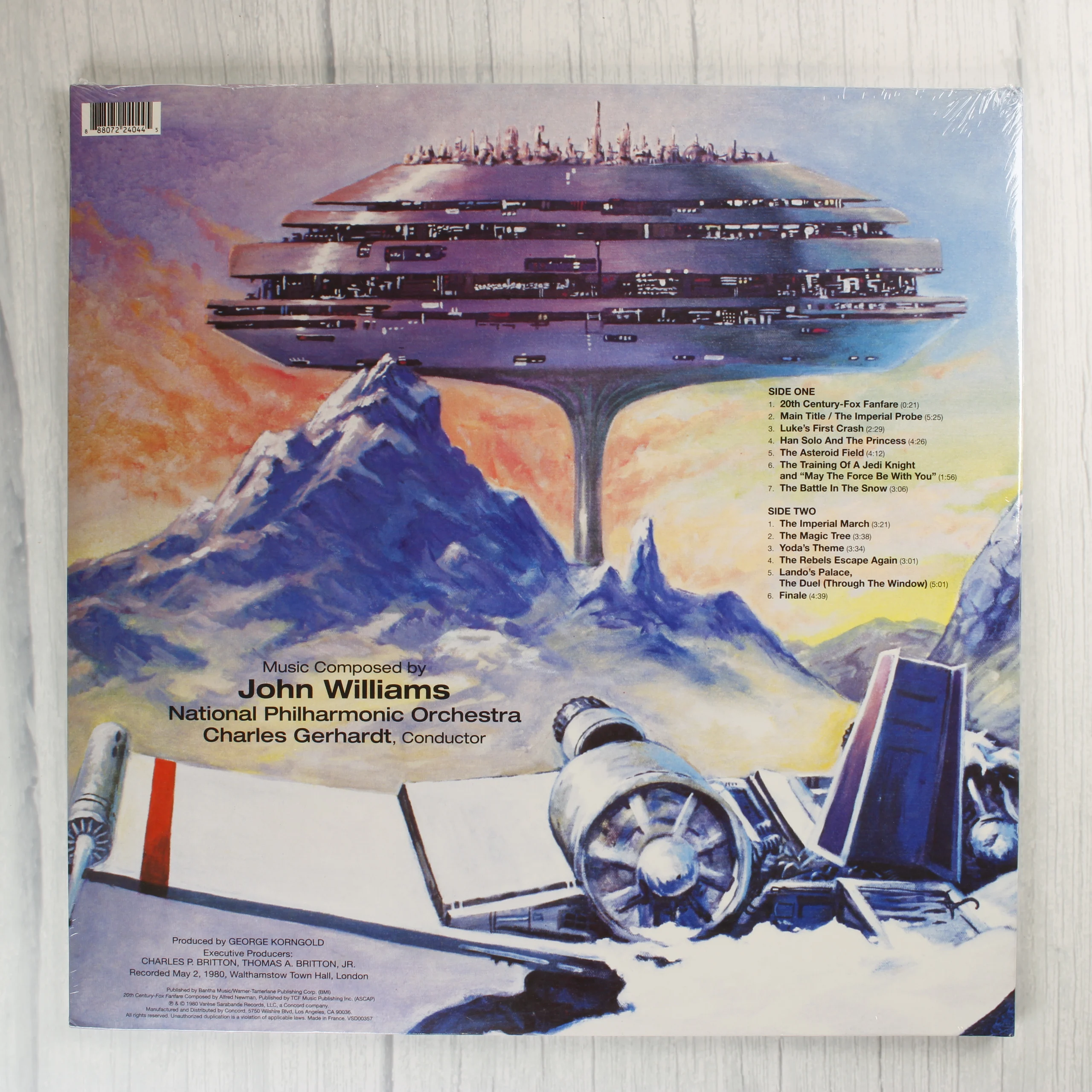 A The Empire Strikes Back című filmzene szimfonikus szvitjét tartalmazó bakelit lemez, melyet John Williams szerzett és a National Philharmonic Orchestra ad elő Charles Gerhardt vezényletével. A borító elején Luke Skywalker látható egy tauntaun hátán, havas hegyi környezetben, felette birodalmi lépegetőkkel és űrhajókkal. A bal felső sarokban egy piros matrica jelzi, hogy ez egy 180 grammos fekete vinyl nyomás, amely Ray Bradbury és Christopher Palmer jegyzeteit is tartalmazza. A hátsó borítón Felhőváros és egy lezuhant X-szárnyú vadászgép illusztrációja látható a számlista mellett. A kiadvány a Varèse Sarabande gondozásában jelent meg. A termék gyári védőfóliában van, ami megőrizte a borító épségét.