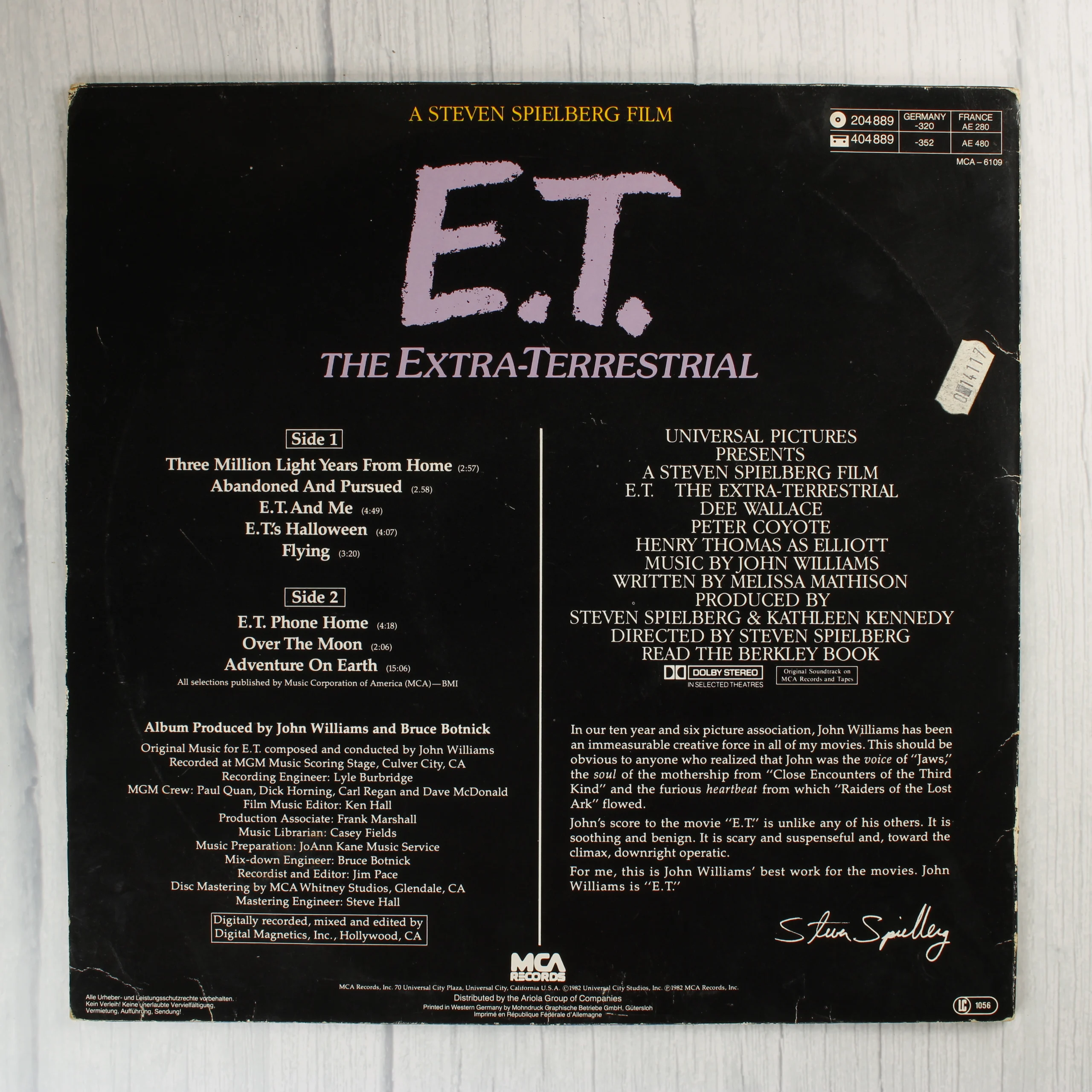 Az E.T. a földönkívüli című film eredeti filmzenei albuma bakelit lemezen. A borító elején a film ikonikus jelenete látható, ahol két ujj összeér a világűr és a Föld háttere előtt. A hátoldalon a zeneszámok listája, a közreműködők névsora, Steven Spielberg aláírása és egy rövid ajánló szöveg olvasható. A kiadvány az MCA Records gondozásában jelent meg, a zenét John Williams szerezte. A borító sötét tónusú, fényes felületű kartonból készült.