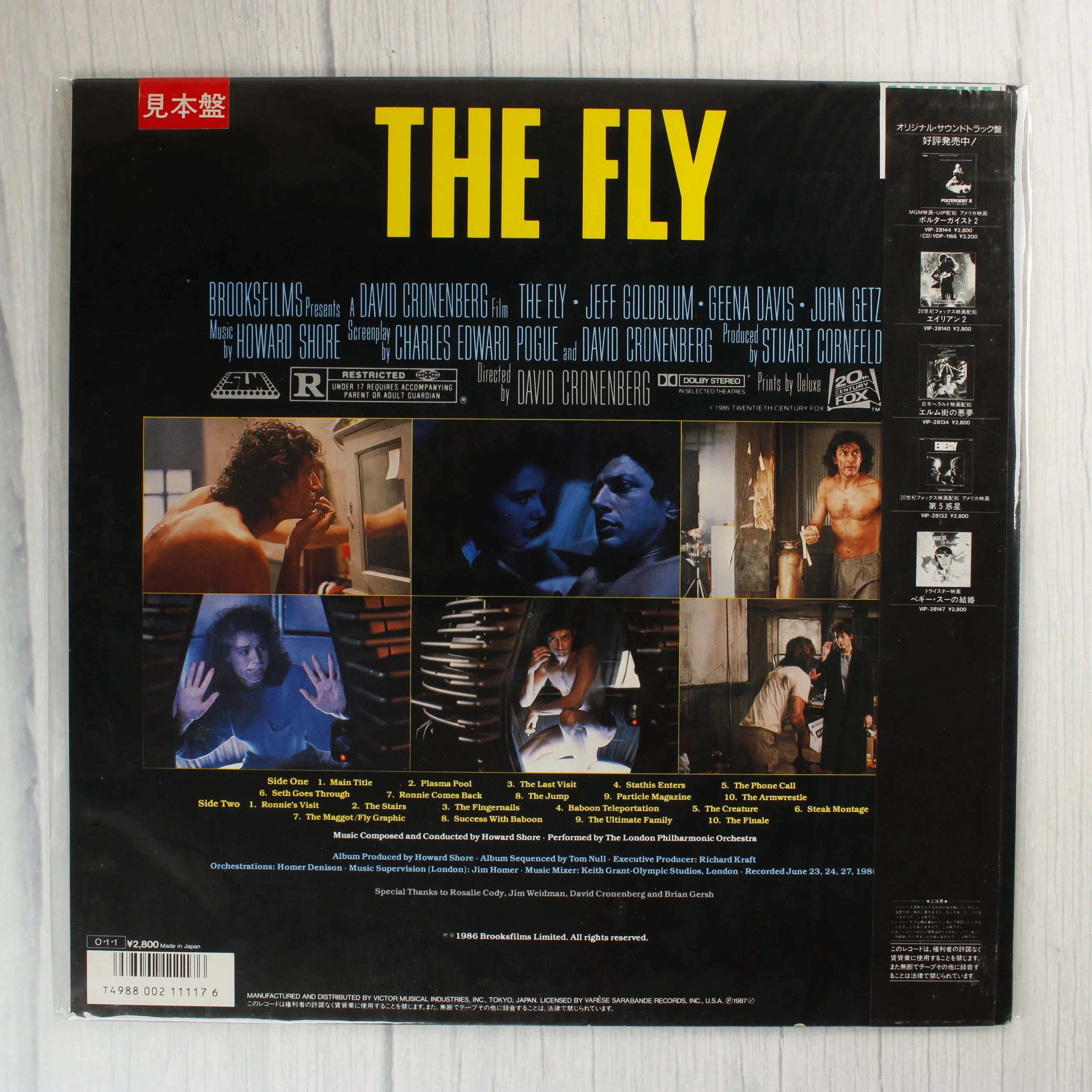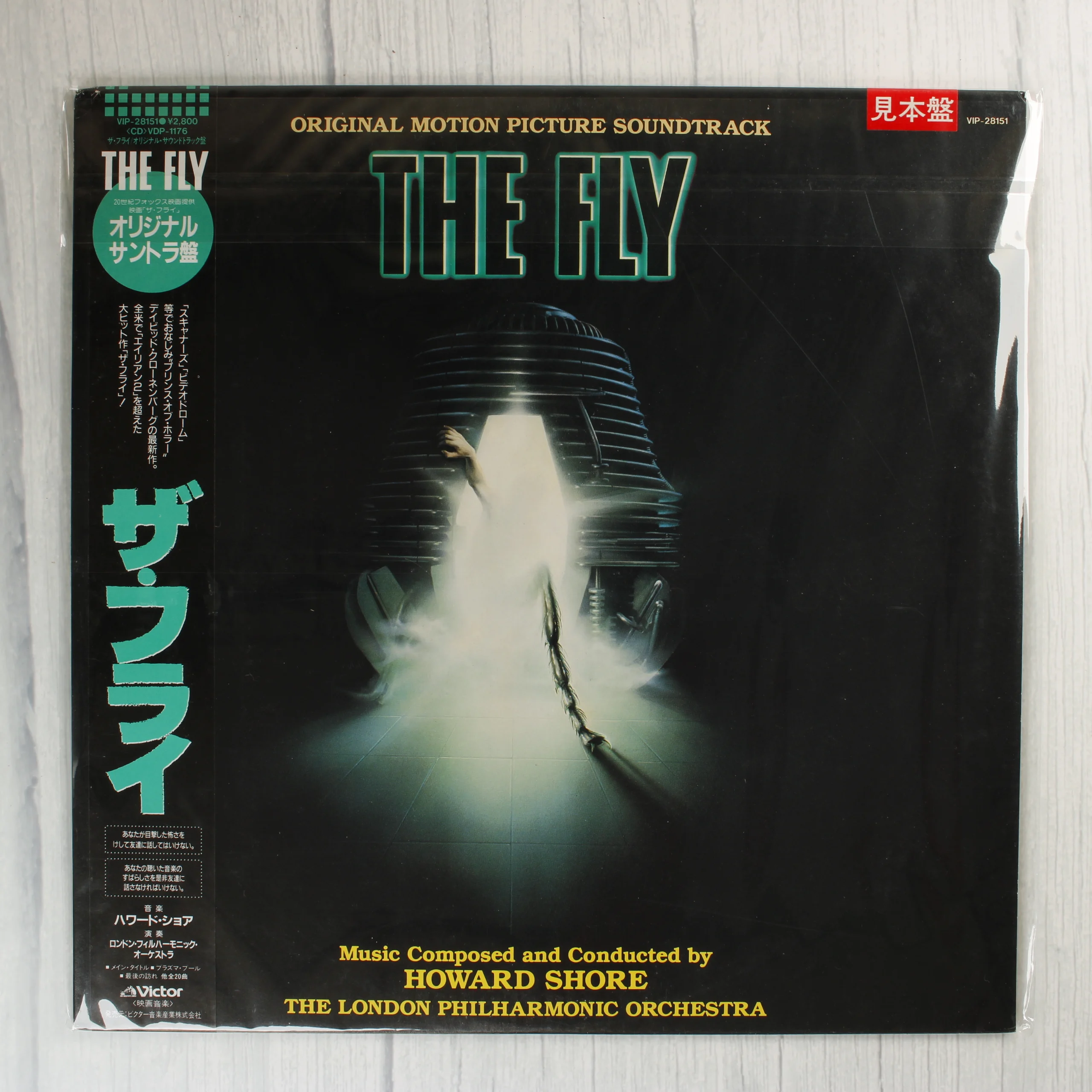 A The Fly (A légy) című 1986-os film eredeti filmzenéjét tartalmazó japán kiadású bakelit lemez. A borító fekete alapszínű, közepén a film ikonikus telepodját ábrázolja, amelyből egy emberi kéz nyúlik ki. A kiadvány tartalmazza az eredeti japán obi-sávot is, amely zöld és fekete színezetű, japán nyelvű feliratokkal. A zeneszerző Howard Shore, közreműködik a Londoni Filharmonikus Zenekar. A hátsó borítón jelenetfotók láthatók a filmből, valamint a stáblista és a dalok jegyzéke. A termék védőfóliában van, a sarkok és élek épek, a borító felülete fényes és megkímélt állapotú.