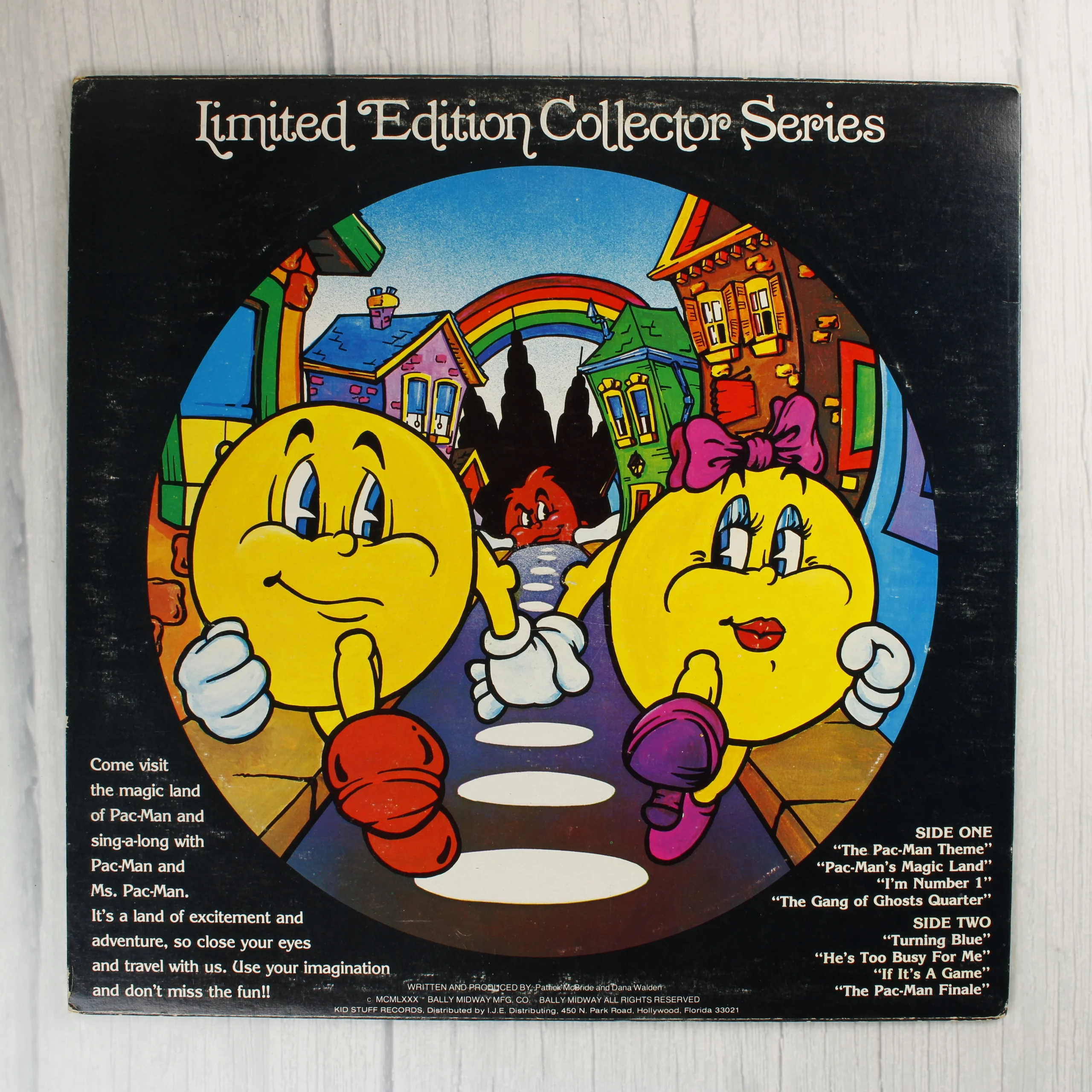 Ez a termék a The Pac-Man Album című hanglemez, amely egy különleges picture disc kiadás. A fekete kartontok elején egy kör alakú kivágás található, amelyen keresztül látható a lemezre nyomtatott színes illusztráció. A grafika Pac-Man-t, Ms. Pac-Man-t és egy kisgyermek karaktert ábrázol egy zenegép társaságában. A borítón sárga színű Limited Edition Collector Series feliratú pecsét látható, a bal felső sarokban pedig a Kid Stuff logója és a Phono Picture Disc megjelölés szerepel. A hátoldalon a dalok listája olvasható, valamint egy másik illusztráció látható a karakterekről egy színes városi környezetben. A tok élei mentén enyhe kopás és fehéredés tapasztalható, ami a korából adódó természetes használat jele.