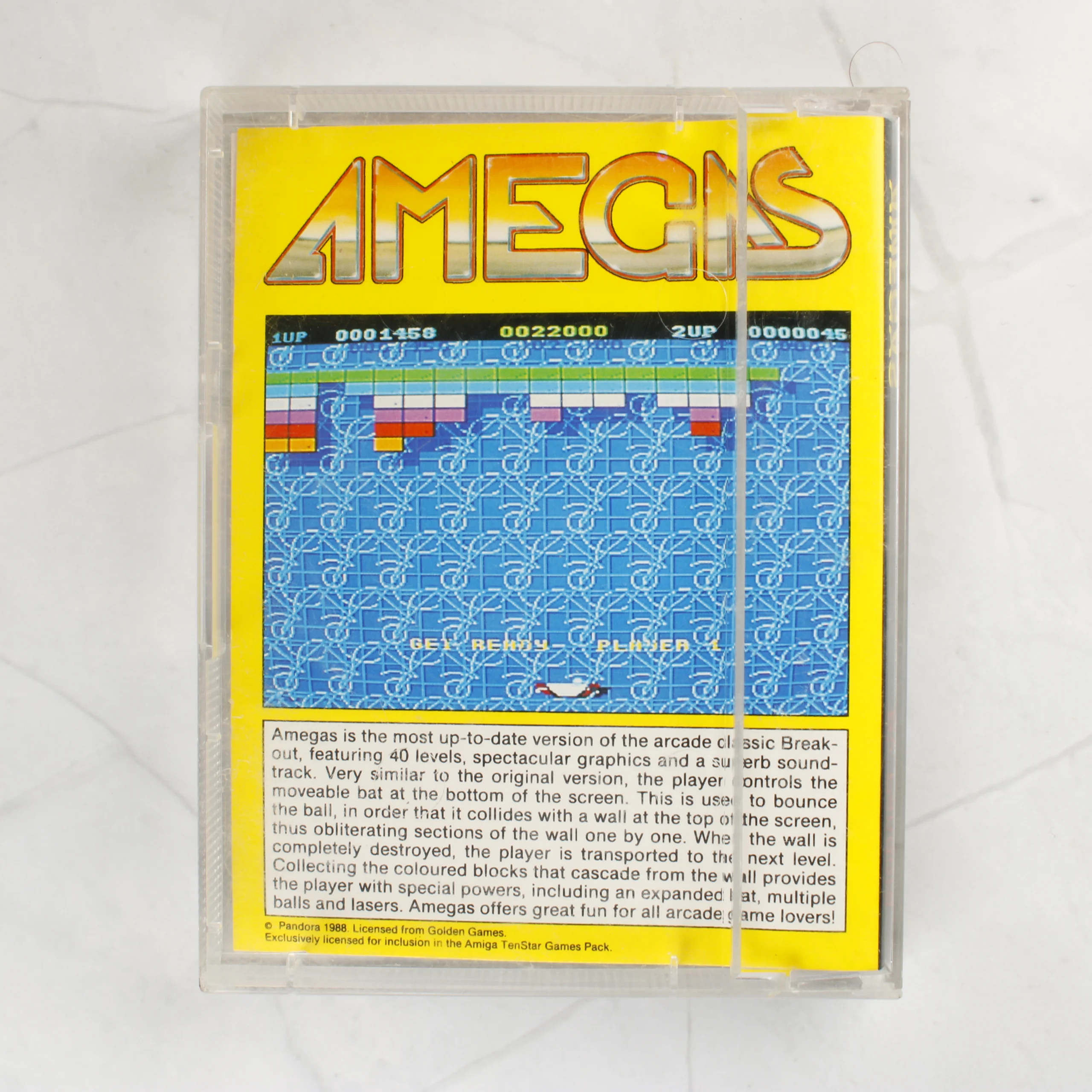 Az Amegas egy klasszikus Breakout stílusú videójáték Amiga platformra, amely egy 3,5 colos floppy lemezen található. A csomag tartalmazza az eredeti átlátszó műanyag tokot és a színes papírborítót is. A borító előlapján egy futurisztikus űrhajó látható akció közben, míg a hátoldalon a játékmenetből vett képernyőkép és angol nyelvű leírás olvasható. A kék színű floppy lemezen fehér címke található, piros és kék feliratokkal, amelyeken a játék címe és a kiadó neve szerepel. A termék a TenStar Pack 1 sorozat része, a Pandora kiadásában jelent meg 1988-ban. A fizikai hordozó és a papír alapú kiegészítők koruknak megfelelő, megkímélt állapotban vannak.