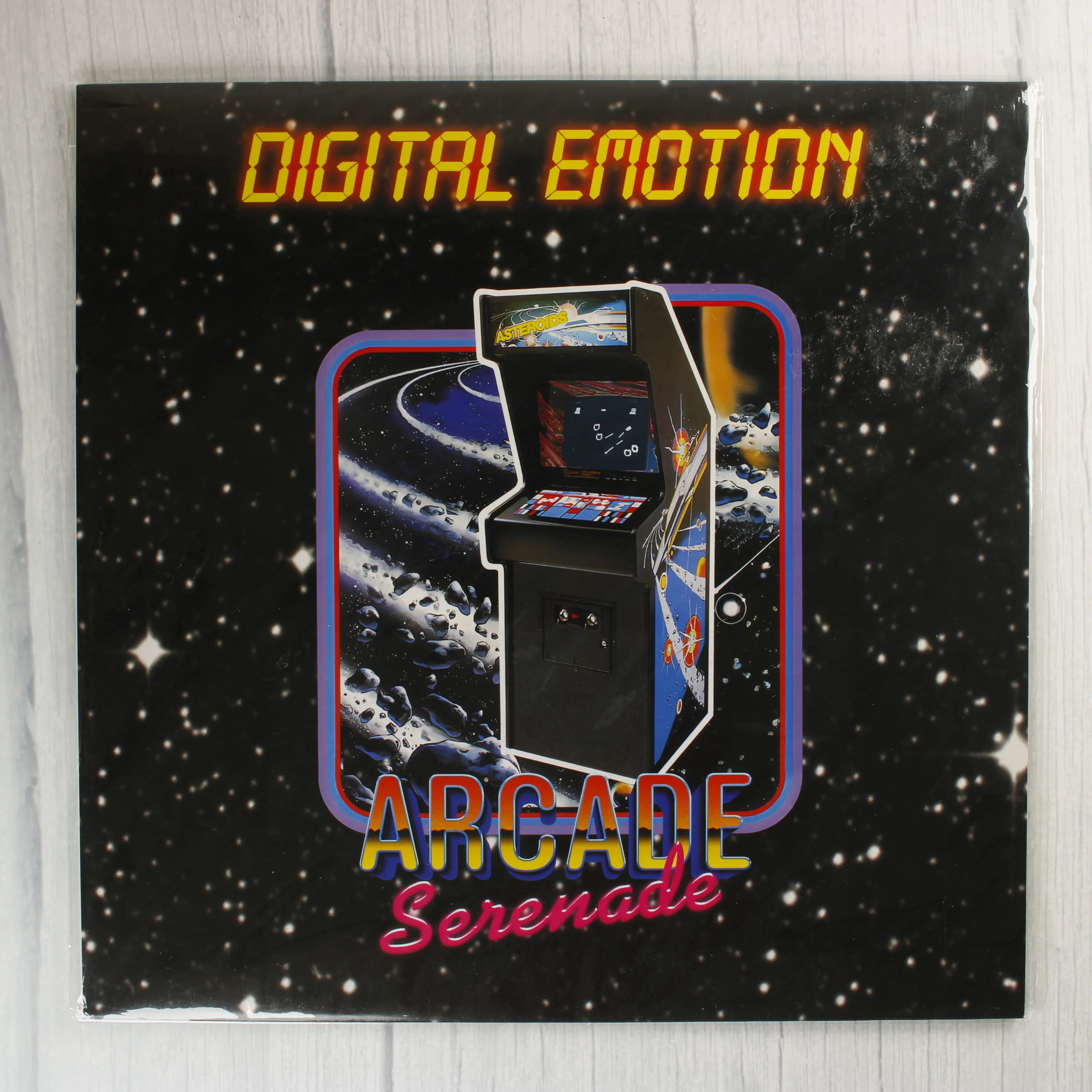 A Digital Emotion együttes Arcade Serenade című kiadványa bakelit lemezen. A borító előlapján egy Asteroids játékautomata látható csillagos világűrt ábrázoló háttér előtt, felette sárga, digitális stílusú betűkkel a zenekar neve, alul pedig a cím olvasható. A hátoldalon számos klasszikus videójáték, például a Pac-Man, Donkey Kong és Space Invaders grafikái jelennek meg, valamint egy futurisztikus ruhába öltözött női alak egy másik játékautomata mellett. A lemezborító átlátszó védőfóliában van, amelyen némi fényvisszaverődés látható. A grafika színes, retró stílusú, az 1980-as évek játéktermi világát idézi.