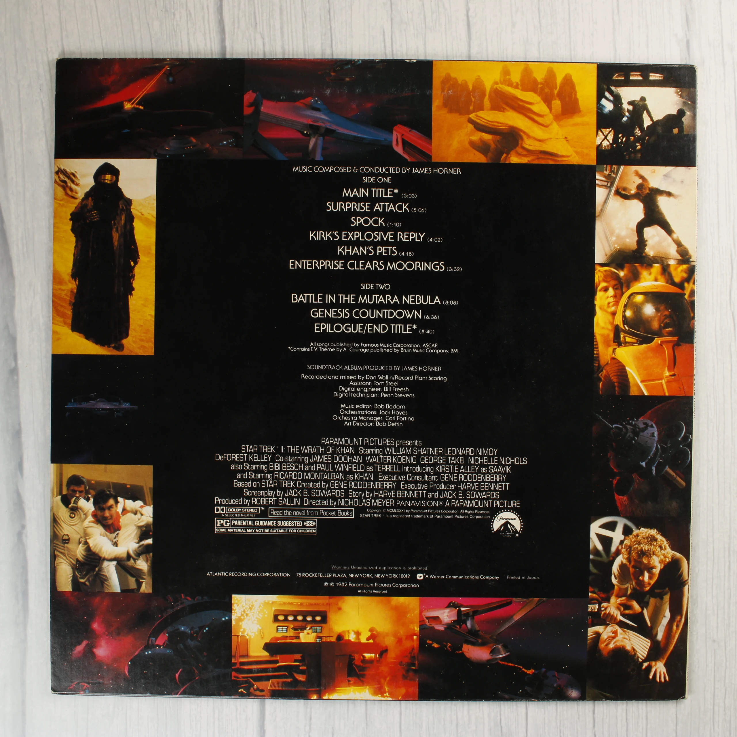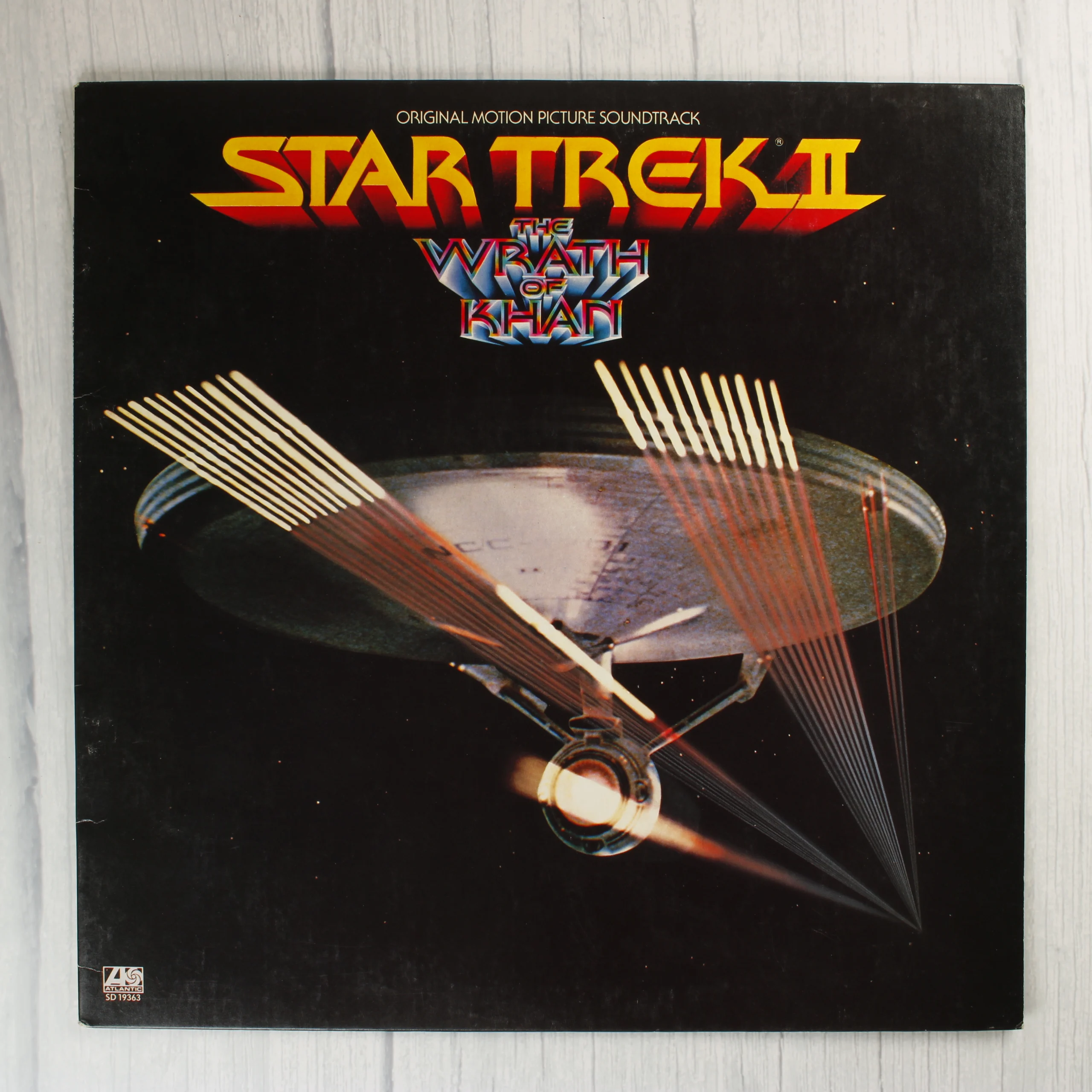 A Star Trek II: The Wrath of Khan eredeti filmzenéjét tartalmazó bakelit lemez borítója. Az előlapon a sötét űrben haladó USS Enterprise csillaghajó látható, felette a film jellegzetes sárga és vörös logójával. A bal alsó sarokban az Atlantic Records logója és az SD 19363 katalógusszám olvasható. A hátoldalon a zeneszámok listája szerepel két oldalra bontva, James Horner zeneszerző nevével. A fekete központi szöveges részt a filmből vett színes jelenetfotók keretezik. A borító alsó részén a Paramount Pictures és az Atlantic Recording Corporation adatai, valamint a gyártási információk láthatóak. A papírborító élei mentén enyhe kopás és használati nyomok fedezhetők fel, de a grafika és a szöveg jól olvasható marad.