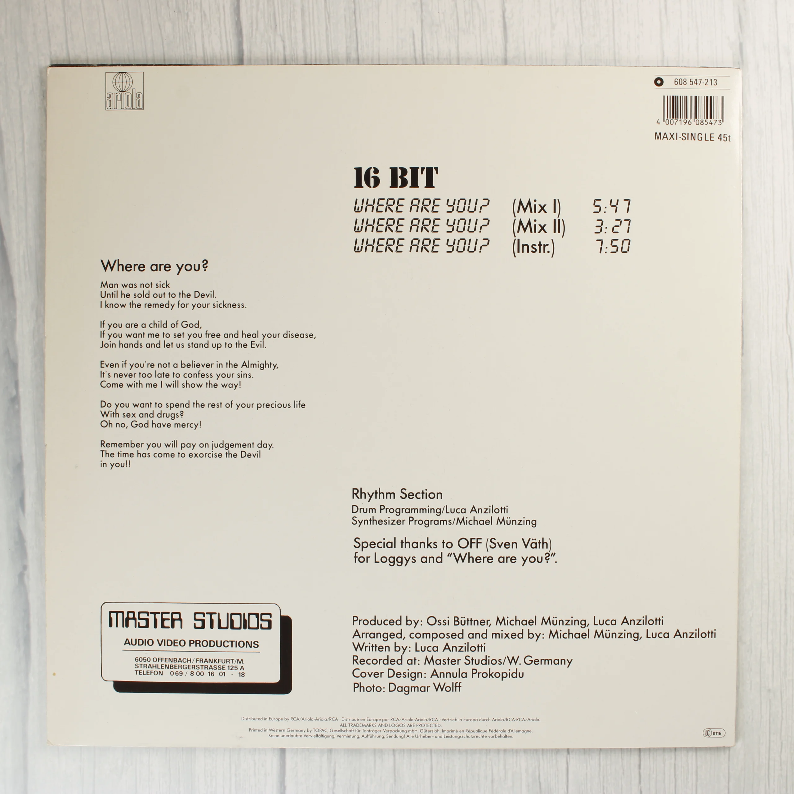 A 16 Bit együttes Where Are You? című maxi-single kiadványa bakelit lemezen. A borító előlapján egy fekete-fehér fotó látható, amelyen egy sötét ruhás alak mutat a néző felé egy temetői környezetben, sírkövek és páfrányok között. A hátsó borító fehér alapszínű, tartalmazza a dalok listáját, a dalszöveget, a közreműködők névsorát, valamint a Master Studios és az Ariola logóit. A kiadvány 45-ös fordulatszámú maxi-single formátumú. A papírborító élei és sarkai enyhén kopottak, de a grafika és a szöveges részek jól olvashatóak és épek.