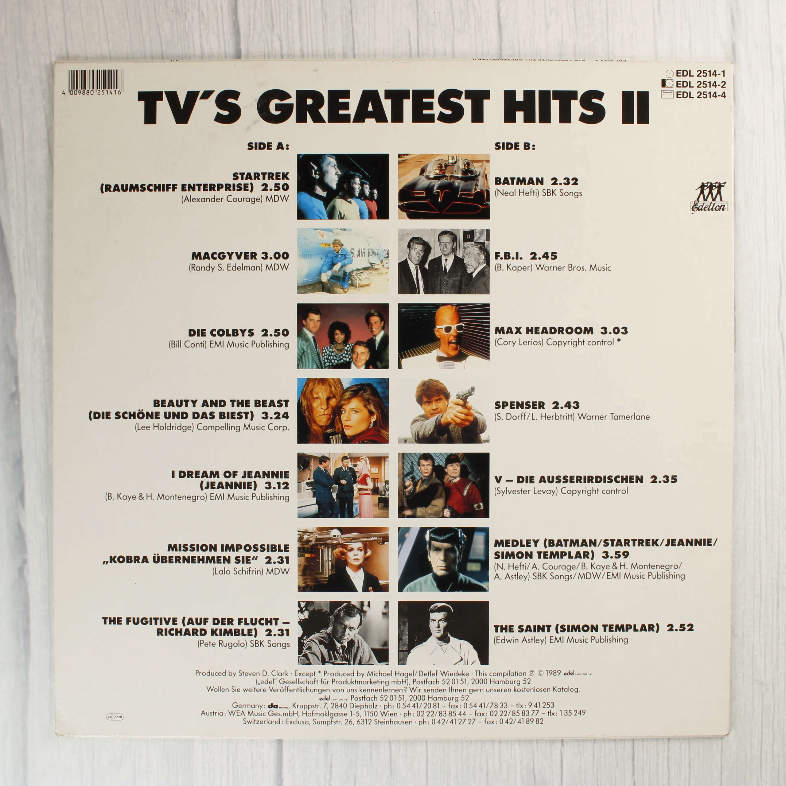 A SAT.1 Presents: TV's Greatest Hits II című válogatásalbum bakelit lemezes kiadása. A borító előlapján népszerű televíziós sorozatok szereplői és jelenetei láthatók, többek között A szépség és a szörnyeteg, a Star Trek és a Batman karaktereivel. A hátoldalon a részletes számlista olvasható, amely olyan klasszikus főcímdalokat tartalmaz, mint a MacGyver, a Mission Impossible és a The Saint. A kiadványt az Edelton jelentette meg 1989-ben. A borító fehér alapszínű, fekete tipográfiával és színes fotókkal illusztrált. A lemezborító sarkai és élei enyhén kopottak, de a grafika és a szöveges információk jól olvashatók maradnak.