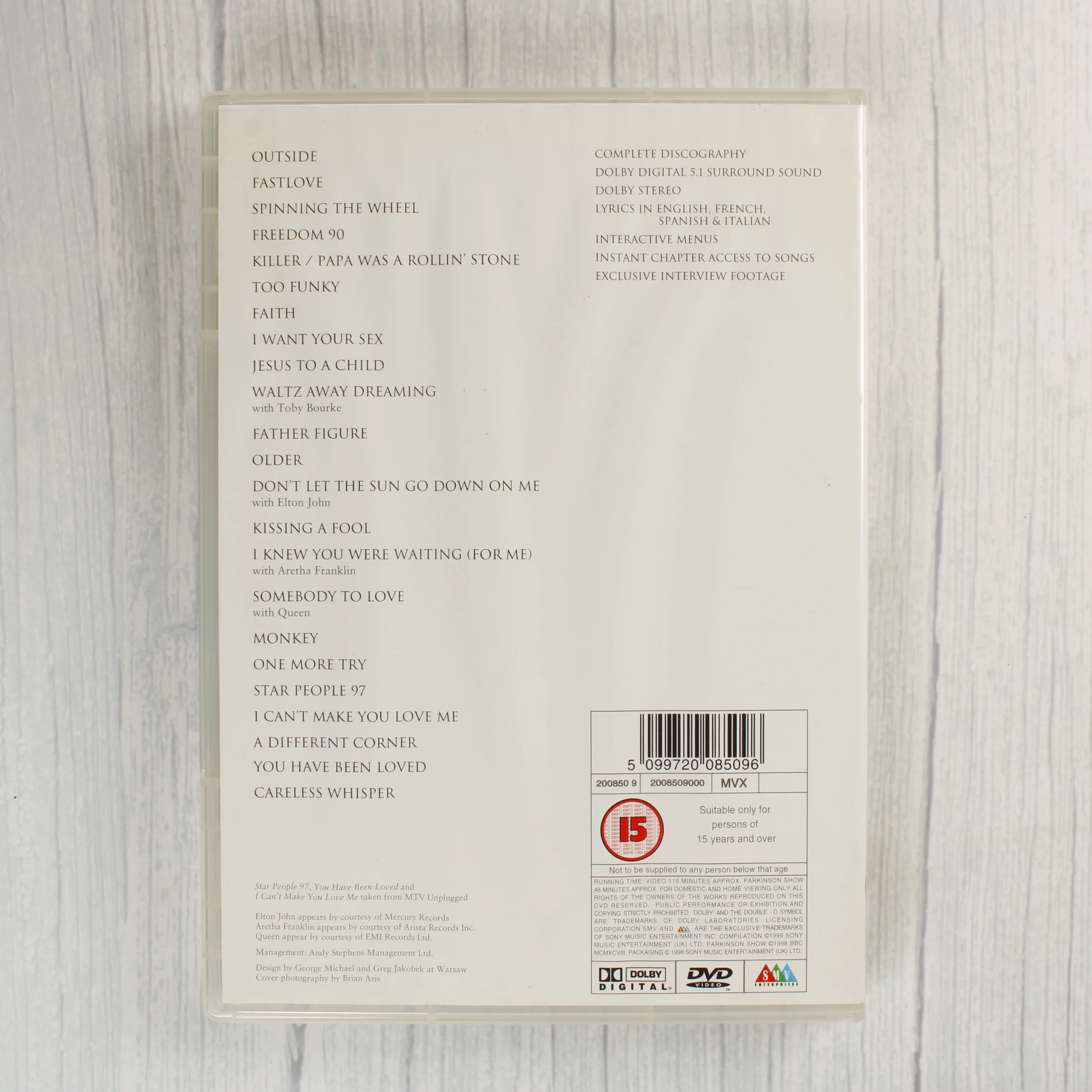 George Michael Ladies & Gentlemen: The Best of George Michael című válogatáslemeze DVD formátumban. A kiadvány egy fehér színű, áttetsző műanyag tokban található, amelynek előlapján az előadó portréja látható. A hátoldalon a dalok listája olvasható, többek között olyan slágerekkel, mint az Outside, a Fastlove és a Careless Whisper. A lemez felületén fekete-fehér grafika szerepel, amely az énekest ábrázolja. A tok és a lemez is jó állapotúnak tűnik, a borítón és a hordozón nem látható jelentős sérülés vagy karcolás. A kiadvány Dolby Digital 5.1 térhangzást és interaktív menüket tartalmaz.