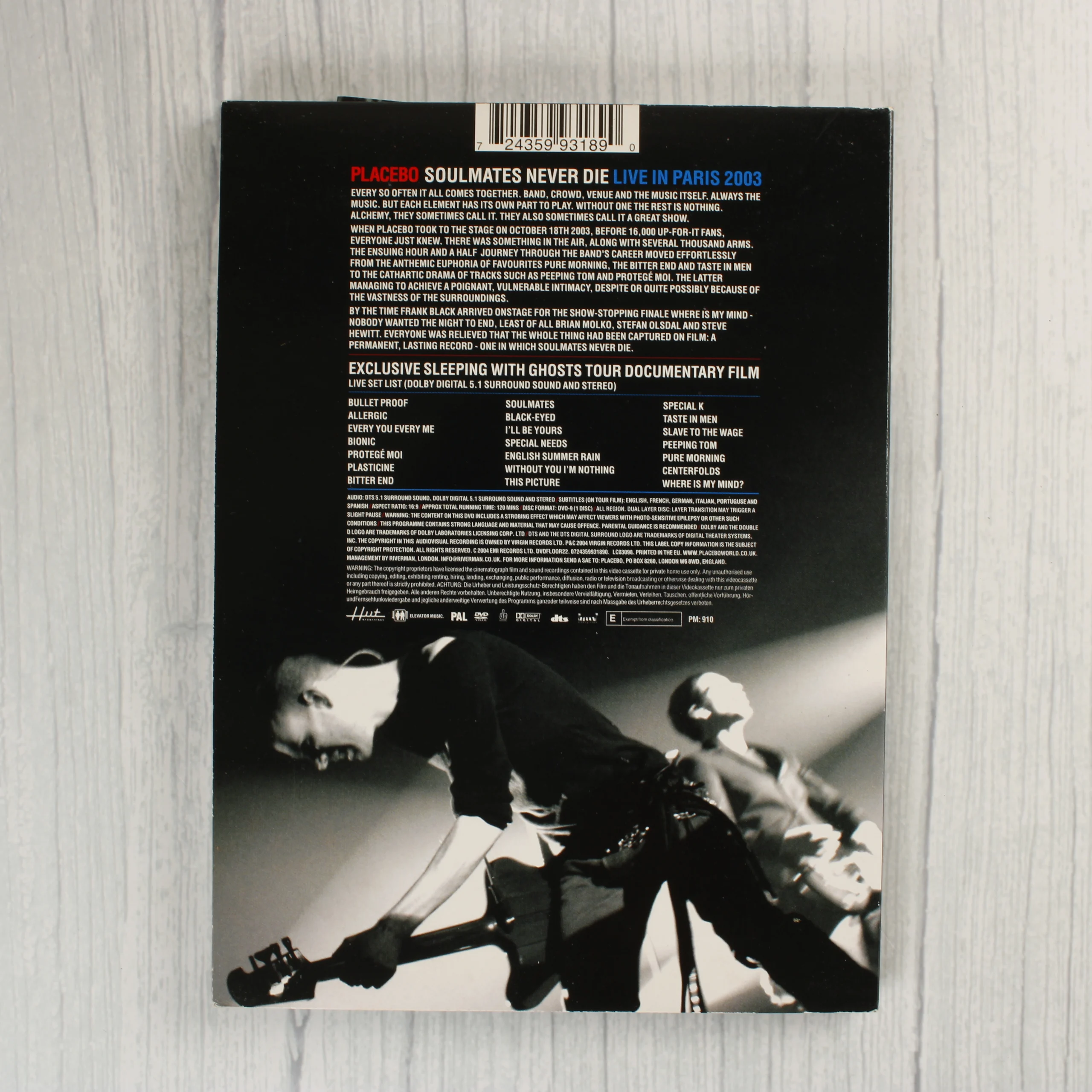 Placebo: Soulmates Never Die - Live in Paris 2003 koncertfilm DVD kiadvány karton védőtokkal és dokumentumfilmmel.