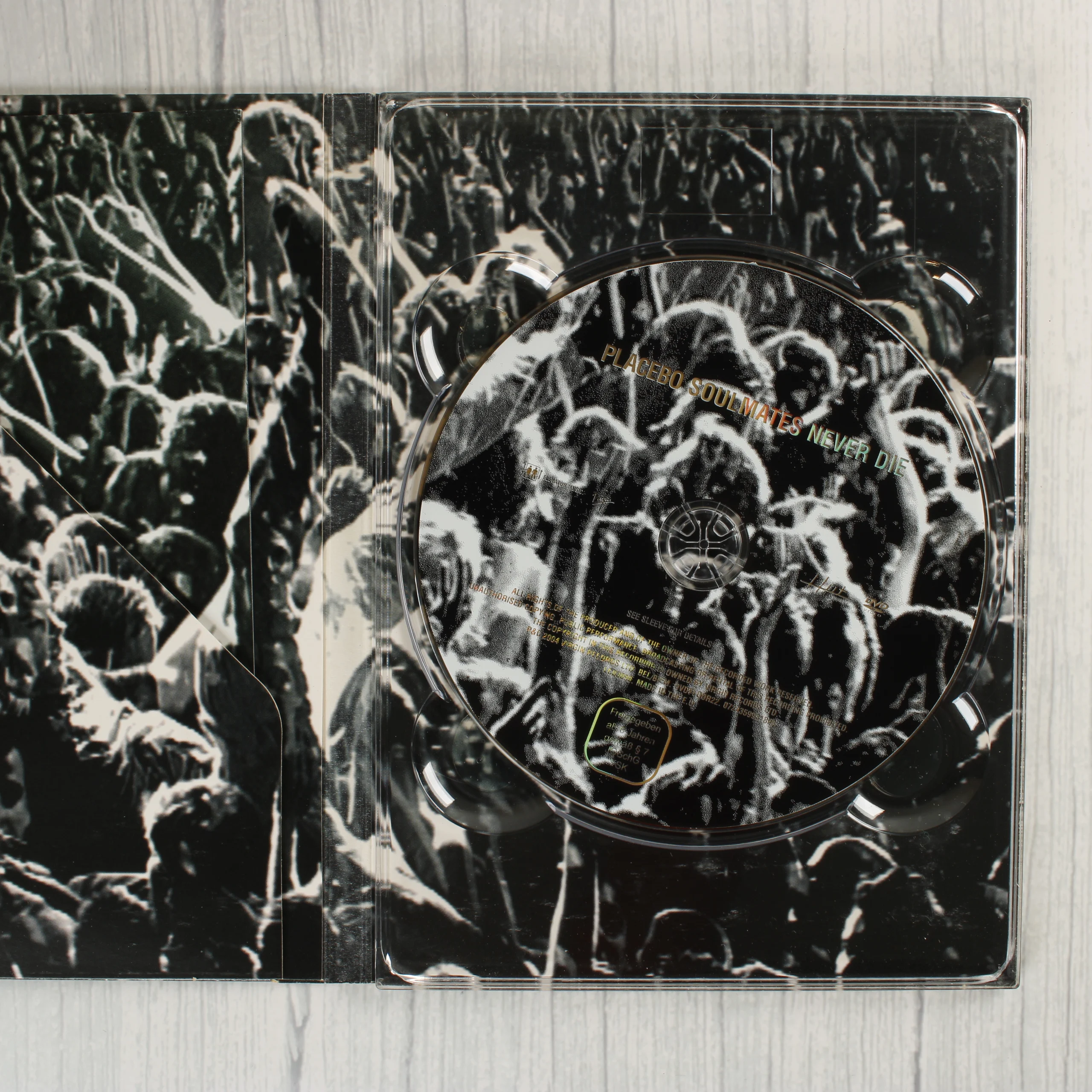 A Placebo együttes Soulmates Never Die: Live in Paris 2003 című koncertfilmje DVD formátumban. A kiadvány egy fekete-fehér koncertfotókkal díszített karton védőtokot és egy átlátszó műanyag tokot tartalmaz. A borítón a zenekar tagjai láthatóak fellépés közben, a címfelirat piros és kék színekkel emelkedik ki. A hátoldalon a részletes számlista, a Sleeping with Ghosts turnéról készült dokumentumfilm leírása és a technikai adatok szerepelnek. A lemez felülete szintén a koncert hangulatát idéző grafikával van ellátva. A csomagolás és a hordozó láthatóan megkímélt állapotban van, a széleken minimális kopás tapasztalható.