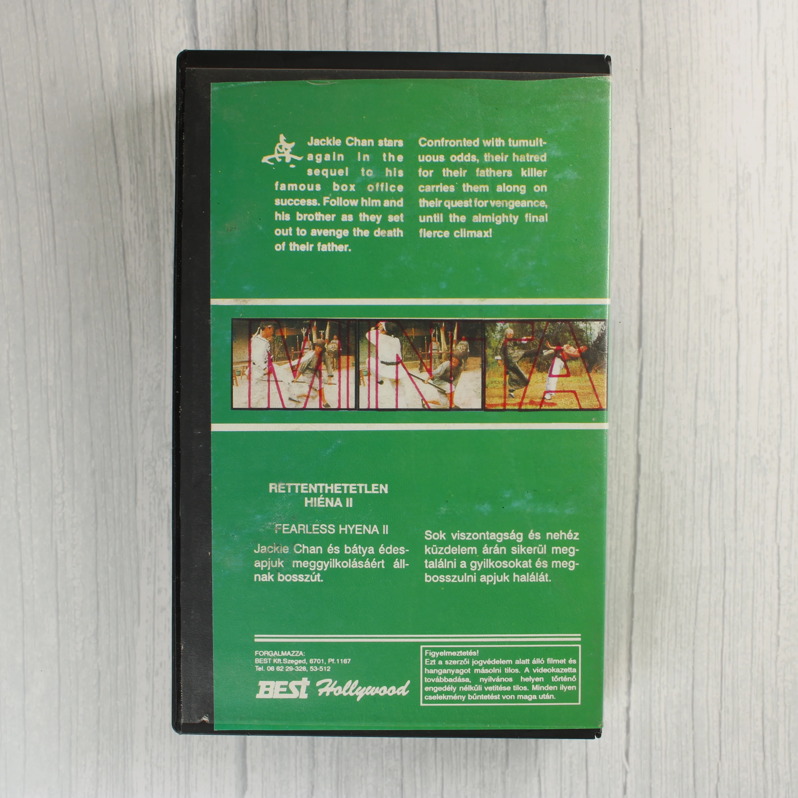 A Jackie Chan Collection sorozatba tartozó Rettenthetetlen hiéna II (Fearless Hyena II) című film VHS kiadása. A fekete műanyag tokban egy szabványos VHS videókazetta található. A borító zöld alapszínű, rajta Jackie Chan arcképe és egy filmjelenet látható. A borítón a BEST Hollywood forgalmazó logója és egy piros 18-as korhatárkarika szerepel. A papírborítón és a hátoldali képeken rózsaszín MINTA felirat látható. A hátoldalon magyar és angol nyelvű rövid tartalomismertető olvasható. A tok jobb alsó sarkában egy kisebb sérülés vagy matricaeltávolítás nyoma látszik.