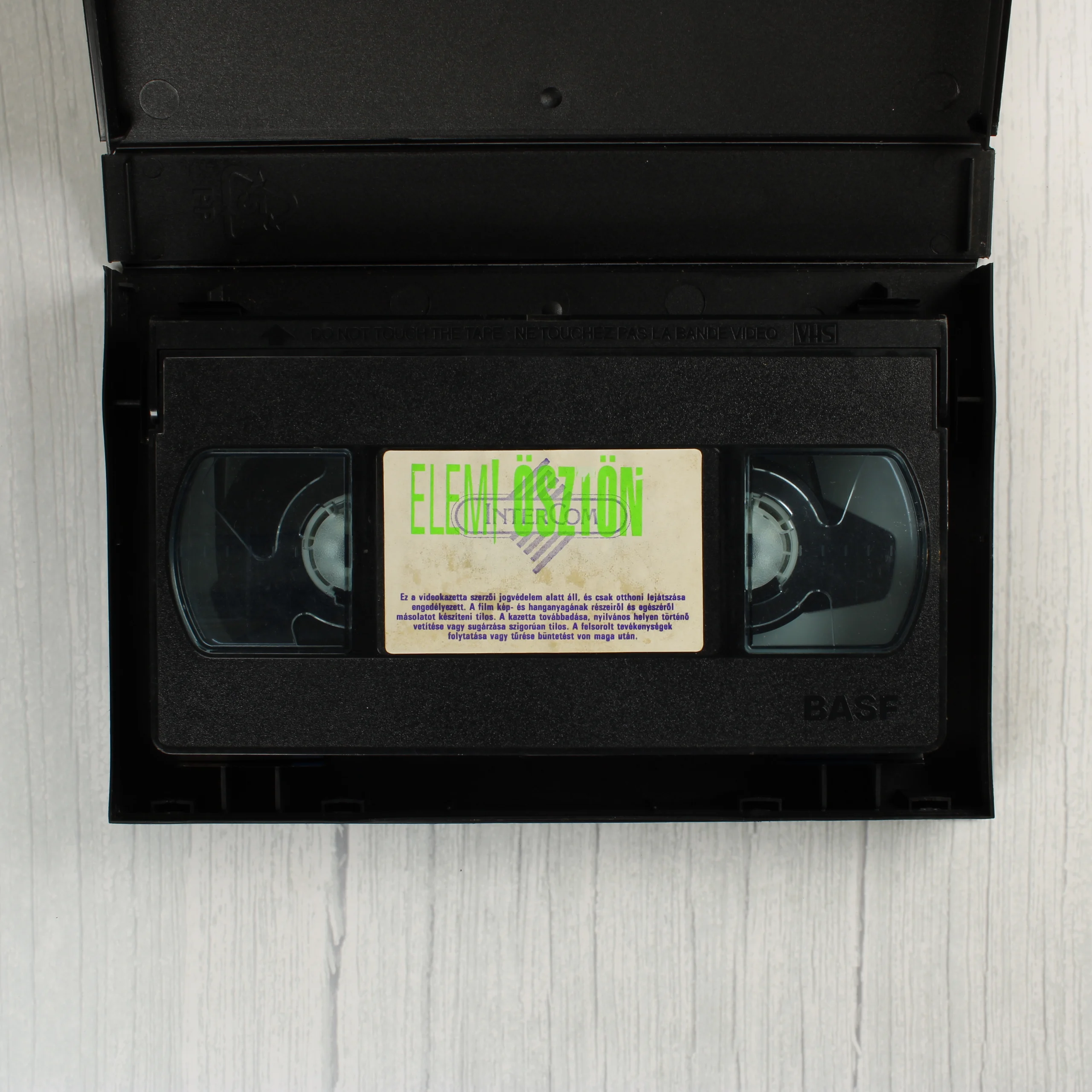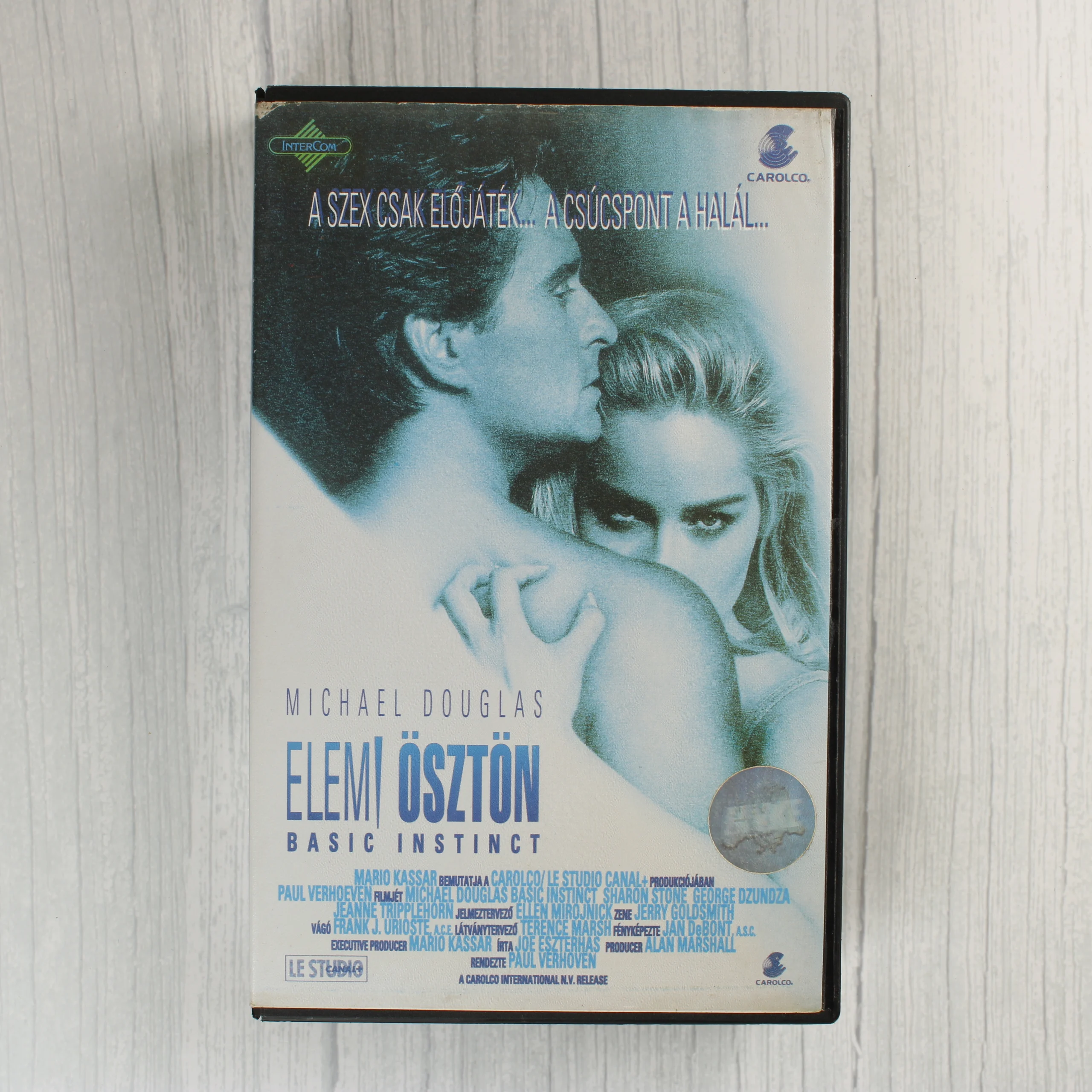 Az Elemi ösztön című amerikai krimi VHS kazettán, Michael Douglas és Sharon Stone főszereplésével. A fekete műanyag tokos kiadás borítóján a film ikonikus jelenete látható, felül az InterCom és a Carolco logóival. A hátoldalon a film rövid leírása, jelenetfotók és a technikai adatok szerepelnek, mint például a 127 perces játékidő és a magyar szinkron. A belső részben egy BASF gyártmányú fekete VHS kazetta található, amelyen egyedi, zöld feliratos címke jelzi a film címét és a forgalmazói információkat. A kiadvány az 1992-es szerzői jogi adatokkal van ellátva.