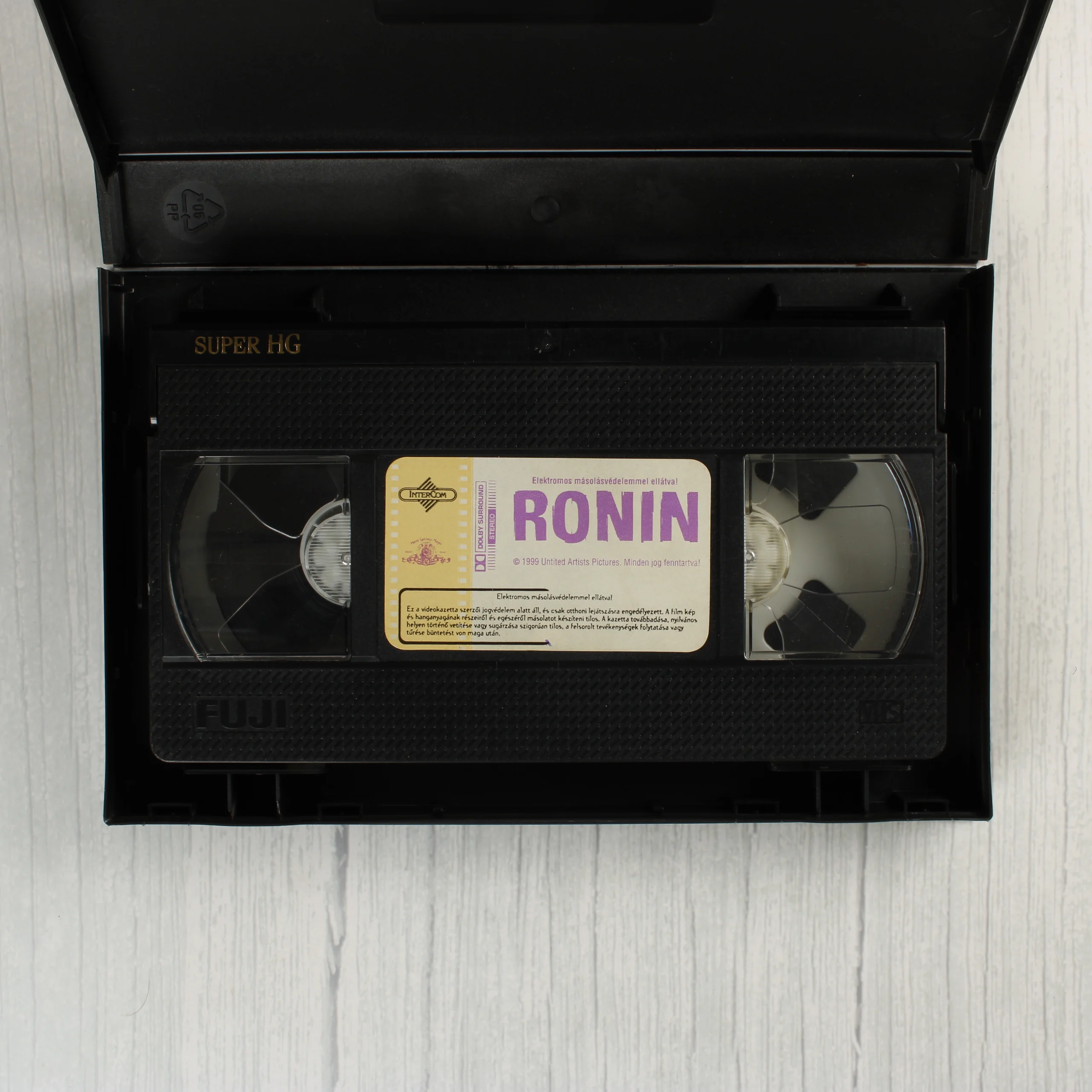 A Ronin című amerikai akciófilm magyarországi VHS kiadása. A fekete műanyag tokban egy Fuji márkájú, Super HG típusú videokazetta található. A borító előlapján a főszereplők, köztük Robert De Niro és Jean Reno láthatóak egy utcai jelenetben, a cím piros betűkkel olvasható. A hátoldalon a film rövid leírása, jelenetfotók, a stáblista és a technikai adatok szerepelnek. A kazetta címkéje sárga alapszínű, lila felirattal, rajta az InterCom forgalmazó logójával. A kiadvány szinkronizált, játékideje körülbelül 116 perc.