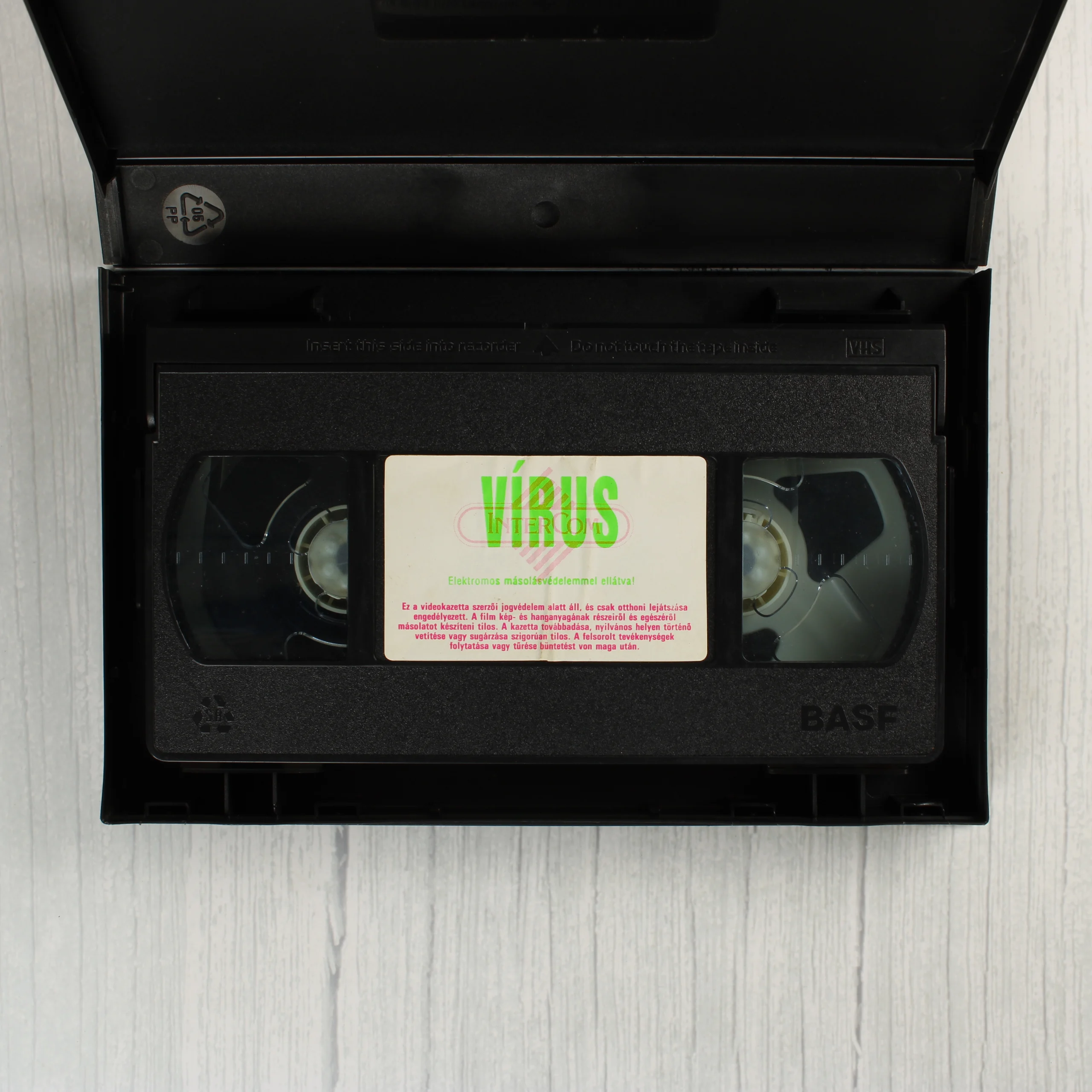 A Vírus (Outbreak) című 1995-ös amerikai thriller film magyar nyelvű VHS kiadása. A fekete műanyag tokos csomagolás elején a főszereplők, Dustin Hoffman, Rene Russo és Morgan Freeman arcképei láthatók, valamint egy majom illusztrációja. A hátoldalon a film rövid leírása, kritikai idézetek és jelenetfotók kaptak helyet. A belső részben egy eredeti BASF gyártmányú VHS kazetta található, amelyen fehér alapon zöld feliratos címke jelöli a filmet és a forgalmazót. A kiadvány az InterCom gondozásában jelent meg, a játékidő körülbelül 124 perc.