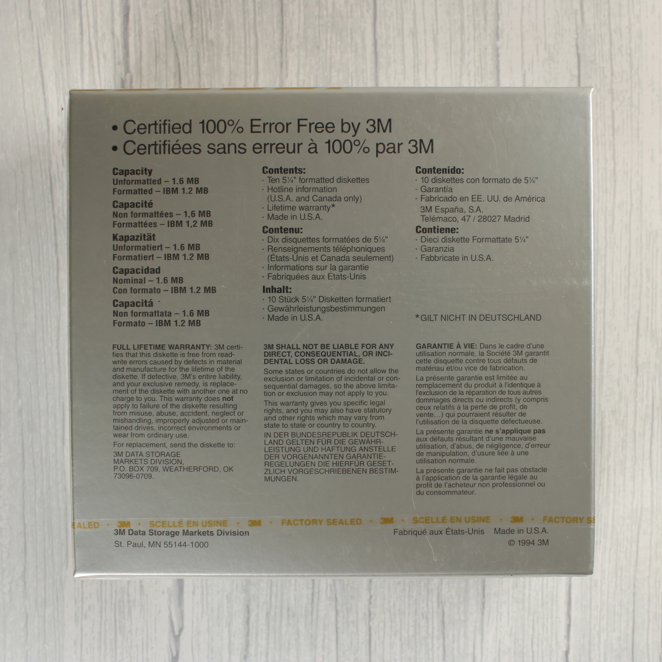 Egy bontatlan, gyári csomagolású 3M márkájú floppy lemez készlet. A doboz 10 darab 5 1/4 colos, nagy sűrűségű (High Density, DS, HD) lemezt tartalmaz, amelyek gyárilag IBM formázottak. A csomagolás ezüstszínű, piros 3M logóval és kék-sárga grafikai elemekkel díszített. A doboz hátoldalán részletes technikai adatok olvashatók több nyelven, többek között a 1,2 MB-os formázott kapacitásról. A termék eredeti celofán borítása ép, rajta a 'Factory Sealed' feliratú biztonsági szalag látható. A csomagolás 1994-es gyártású, az Amerikai Egyesült Államokban készült.