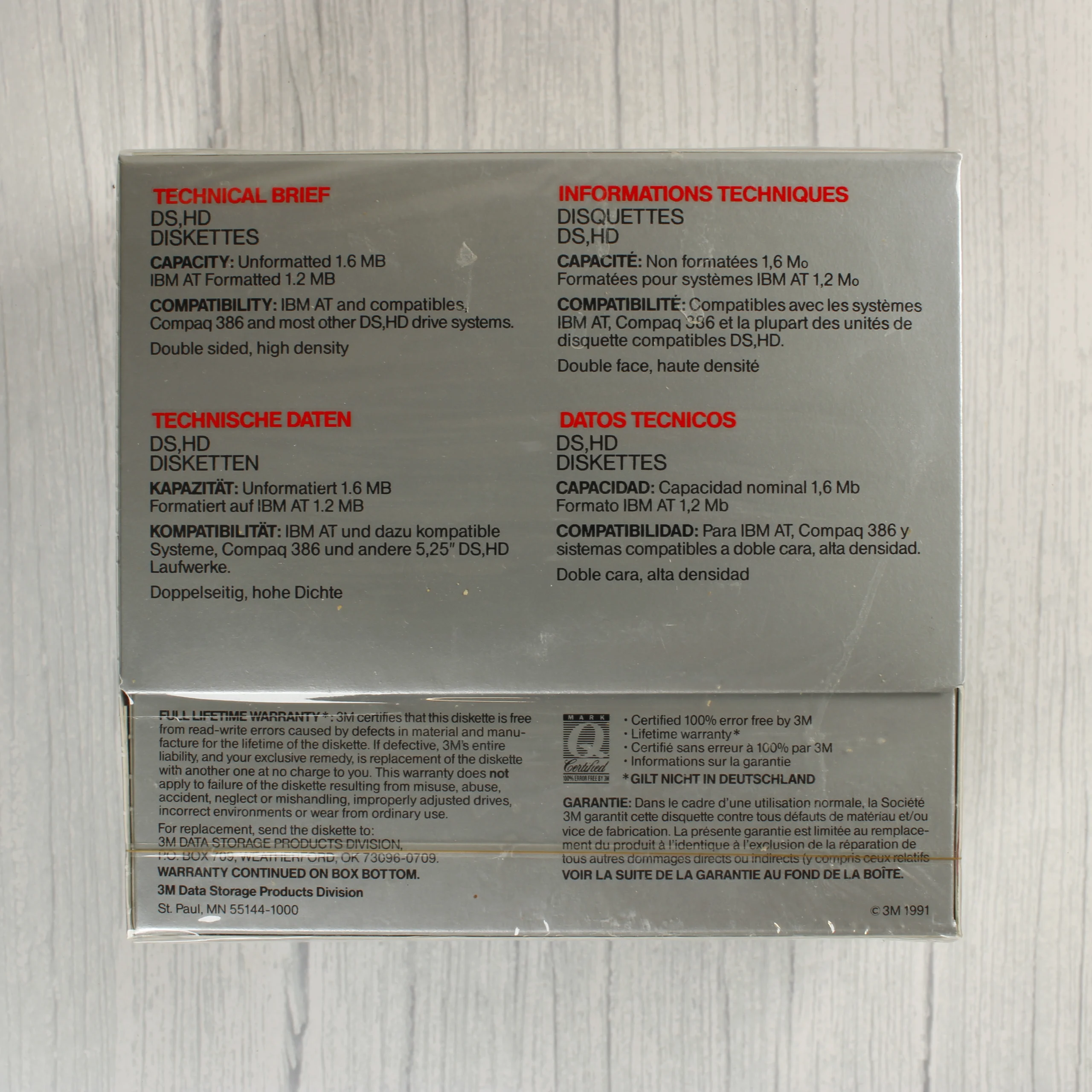 Egy bontatlan, gyári fóliás csomagolású 3M márkájú floppy lemez készlet. A doboz 10 darab 5,25 colos, nagy sűrűségű (HD), kétoldalas (DS) lemezt tartalmaz. A csomagolás ezüstszínű, piros 3M logóval és az olimpiai játékok támogatói emblémájával ellátva. A hátoldalon többnyelvű technikai adatok olvashatók, amelyek szerint a lemezek formázatlan kapacitása 1,6 MB, IBM AT formázással pedig 1,2 MB. A doboz és a fólia ép, tiszta állapotú, látható sérülés vagy jelentős kopás nélkül.