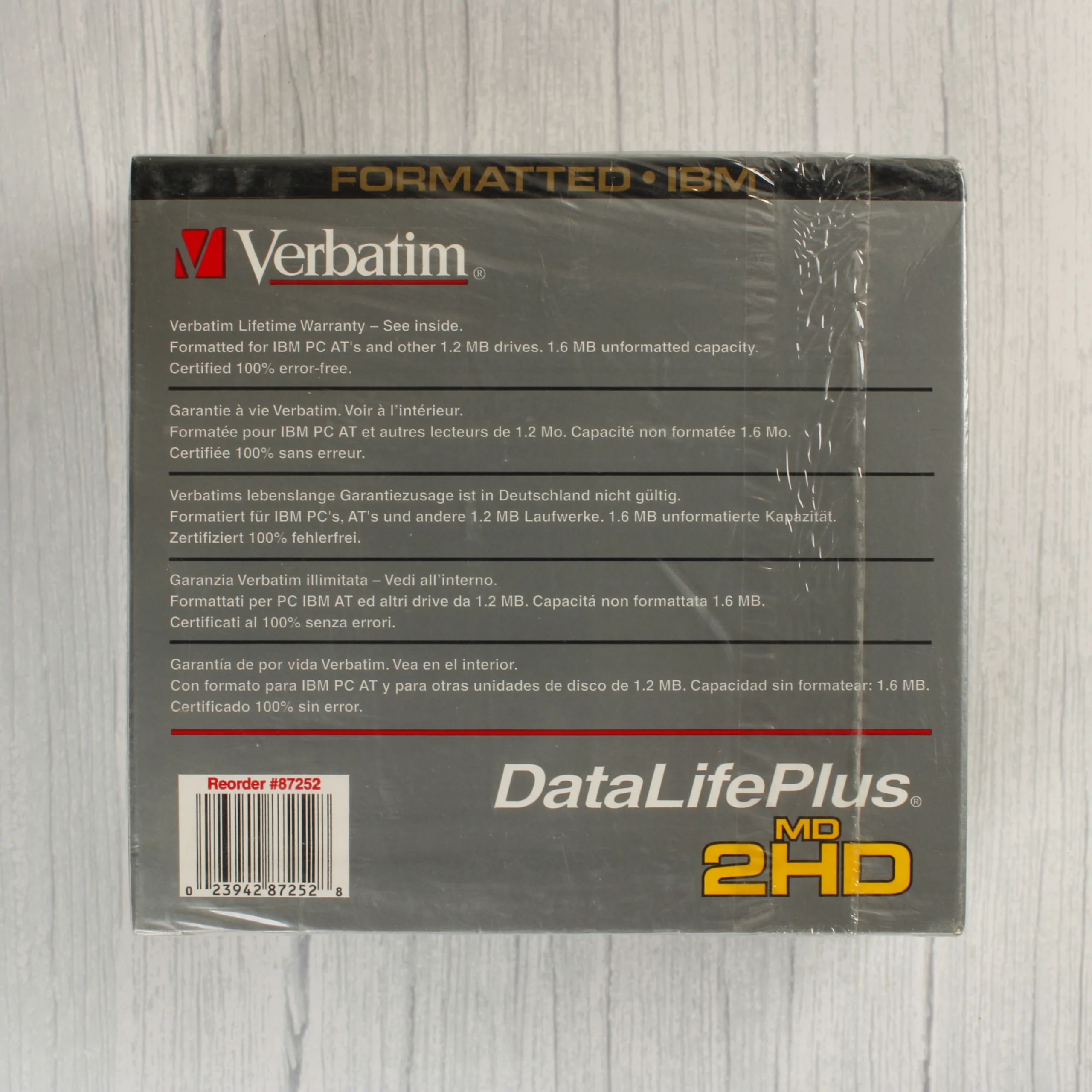 A Verbatim DataLifePlus MD 2HD típusú, 5,25 colos floppy lemez csomag tíz darab adathordozót tartalmaz. A termék gyári fóliázott csomagolásban látható, amely IBM formázott lemezeket rejt. A doboz szürke alapszínű, arany és fehér feliratokkal, valamint egy kiemelt Teflon védelmi jelzéssel. A csomagolás hátoldalán többnyelvű technikai leírás olvasható, amely szerint a lemezek nagy sűrűségűek (High Density) és kétoldalasak. A fólia ép, de a tárolásból adódóan apróbb gyűrődések láthatóak rajta. A termék 1,2 MB formázott kapacitással rendelkezik.