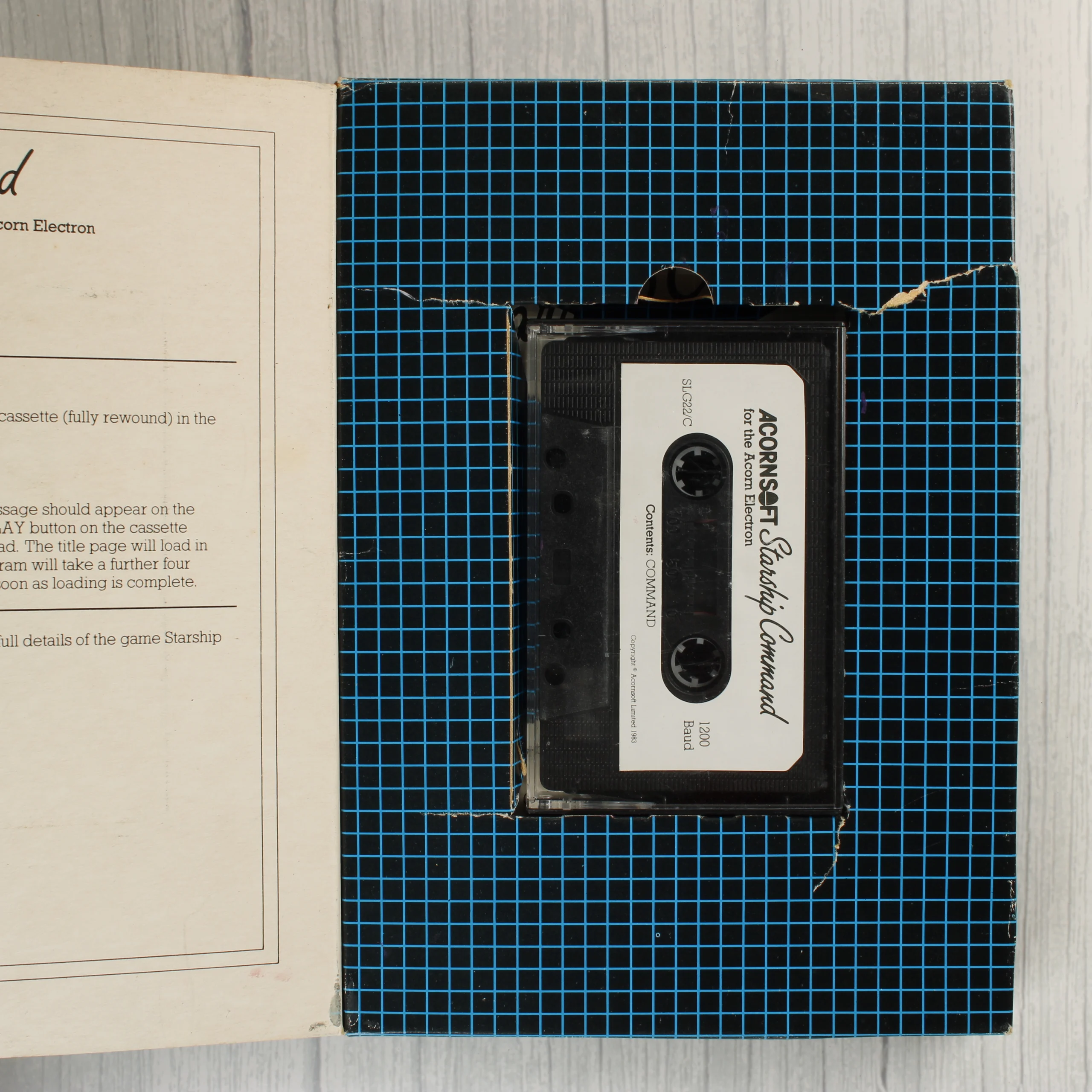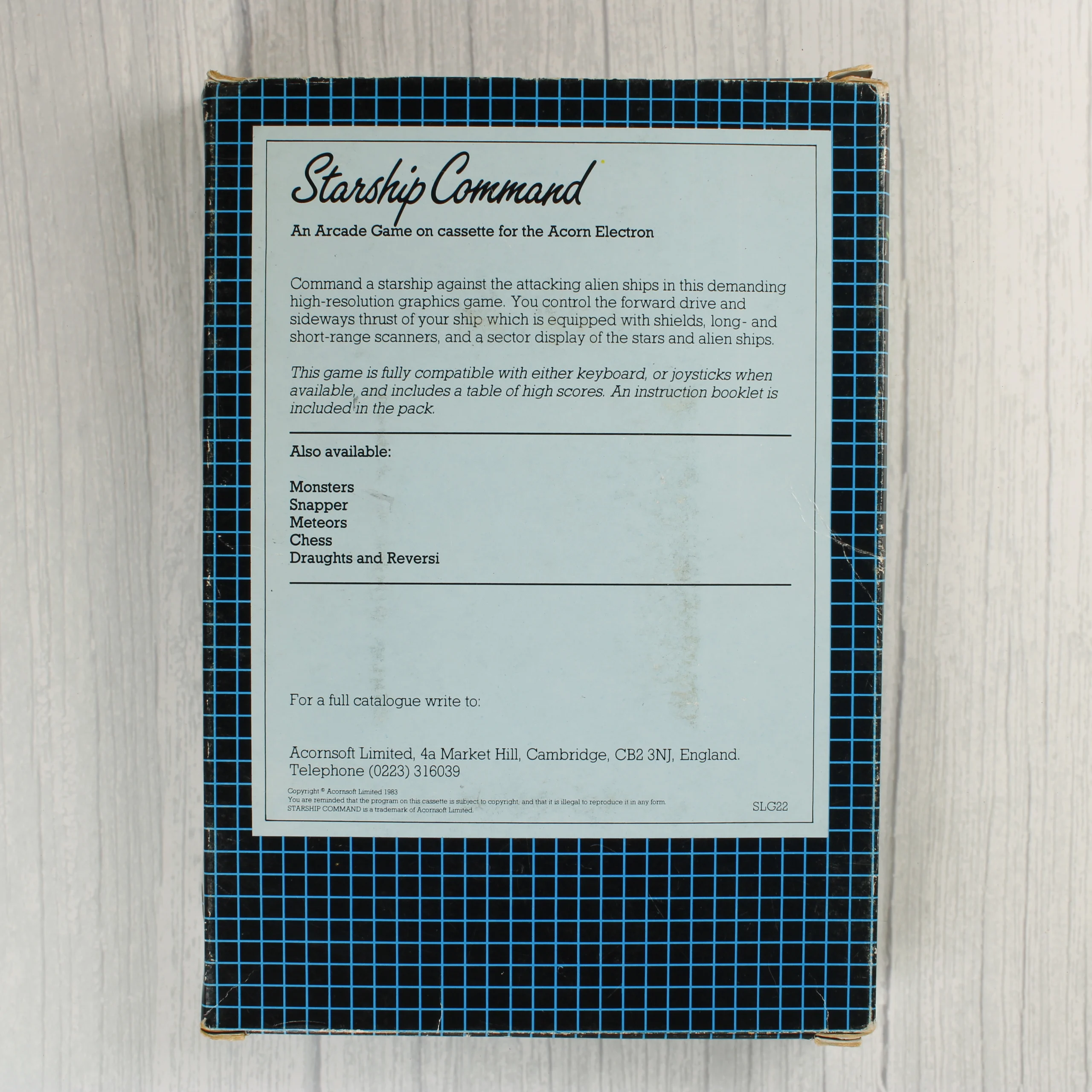 Az Acornsoft által kiadott Starship Command egy 1983-as arcade stílusú videójáték Acorn Electron számítógéphez. A termék egy kék négyzethálós mintázatú kartondobozban található, amelynek elején a játék címe zöld, kézírásos betűtípussal olvasható, alatta pedig egy kék tónusú képernyőkép látható a játékmenetről. A csomag tartalmazza az eredeti mágnesszalagos kazettát, amely egy belső kartonkivágásban helyezkedik el. A kazetta fekete műanyag házas, fehér címkével, amelyen a játék címe és a technikai adatok szerepelnek. A doboz hátoldalán a játék leírása és az Acornsoft elérhetőségei láthatóak. A csomagolás bal oldalán egy rögzített használati útmutató füzet is található.