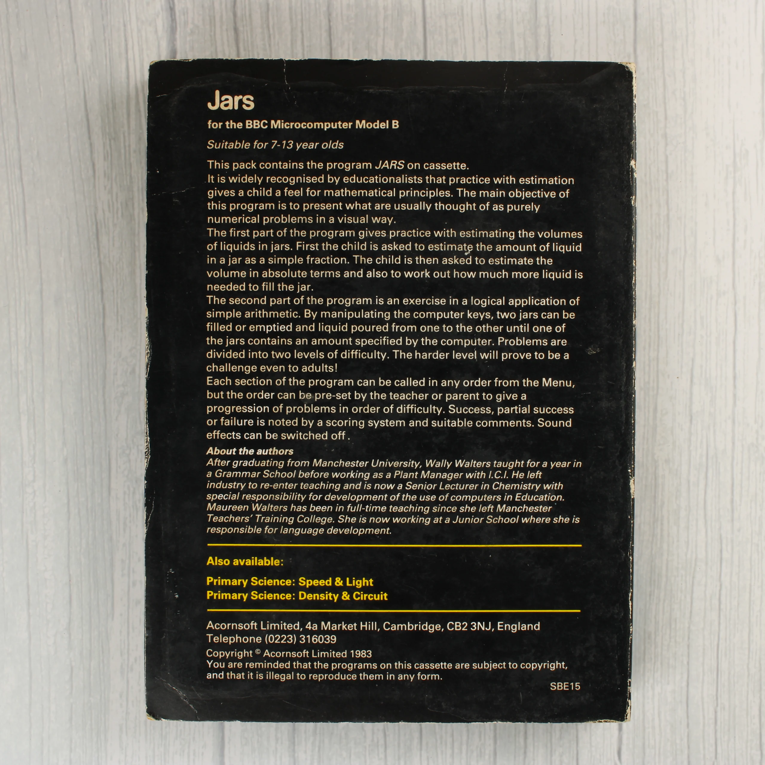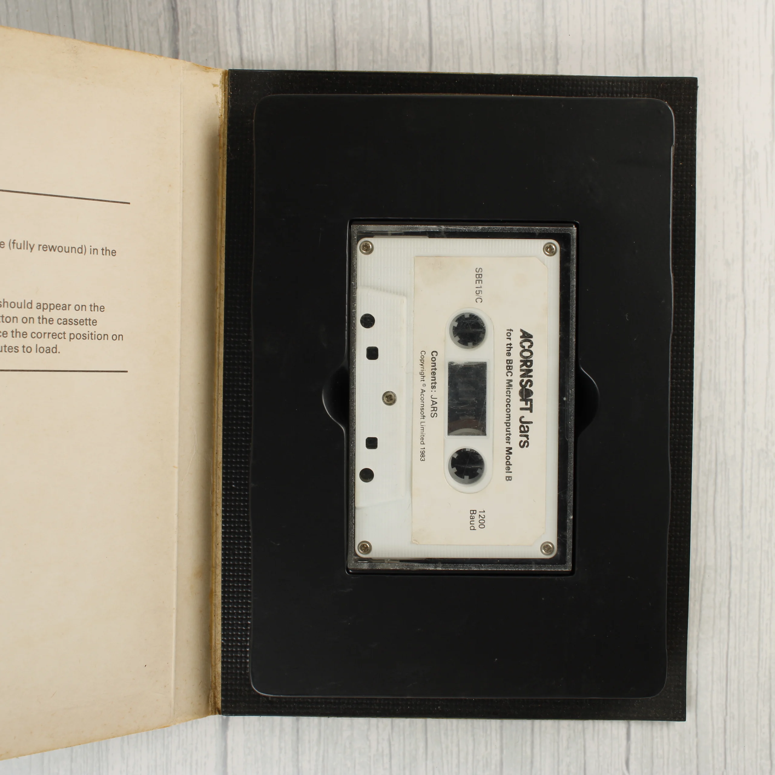 Az Acornsoft Education által kiadott Jars egy oktatóprogram BBC Microcomputer Model B számítógéphez. A csomag egy fekete alapszínű, kartonált tokot tartalmaz, amelynek elején sárga háttér előtt két korsó látható, amint folyadékot töltenek egyikből a másikba. A tok belsejében egy fekete műanyag tálcában helyezkedik el a fehér színű adathordozó kazetta. A külső borítón és a kazetta címkéjén is jól olvashatóak a termék adatai és a gyártói információk. A csomagolás szélei és sarkai láthatóan kopottak, a papír helyenként sárgult, ami a korából adódó természetes használati nyomokra utal. A belső oldalakon enyhe elszíneződés és foltok láthatóak.