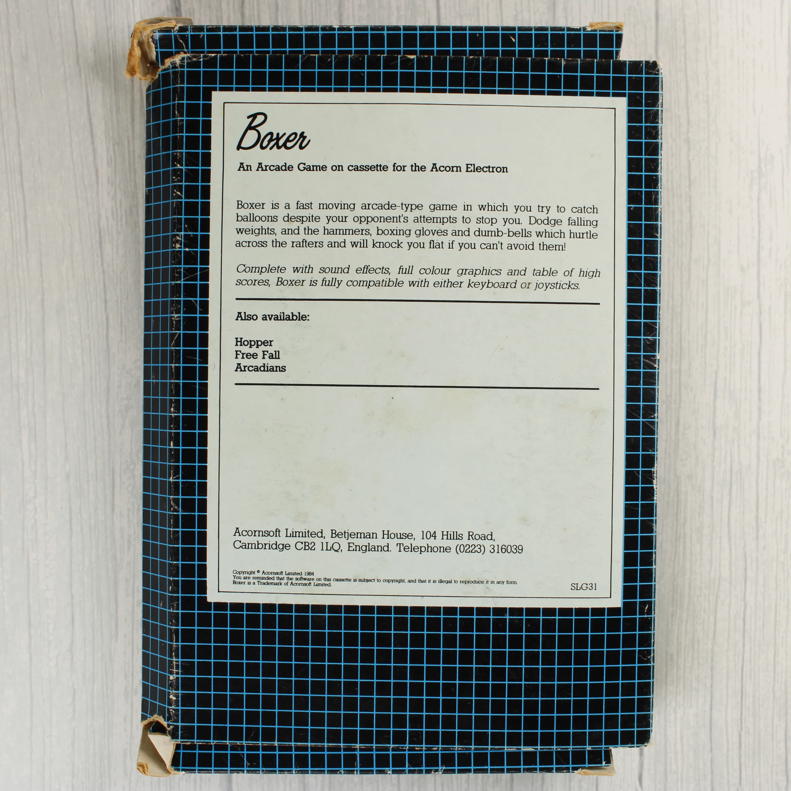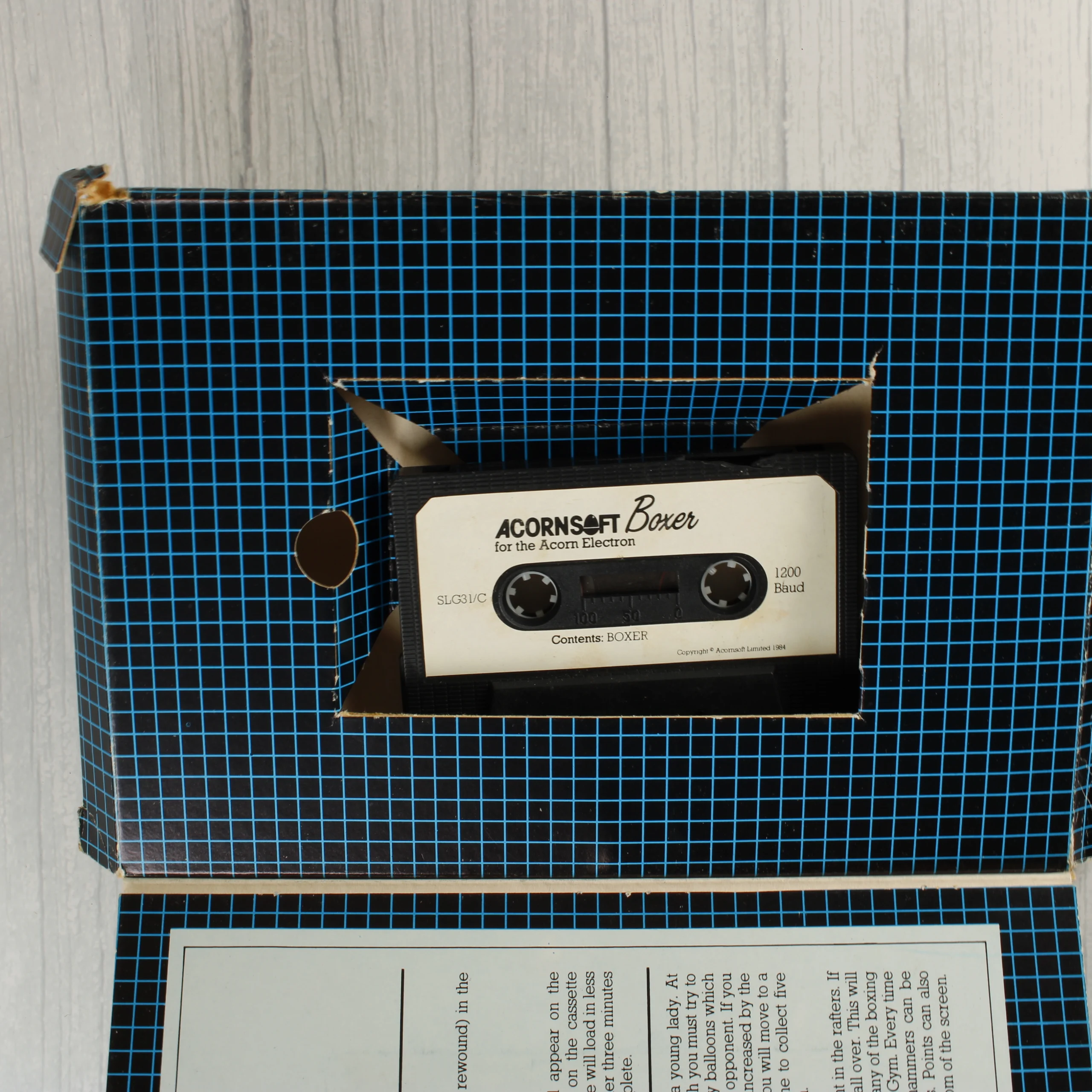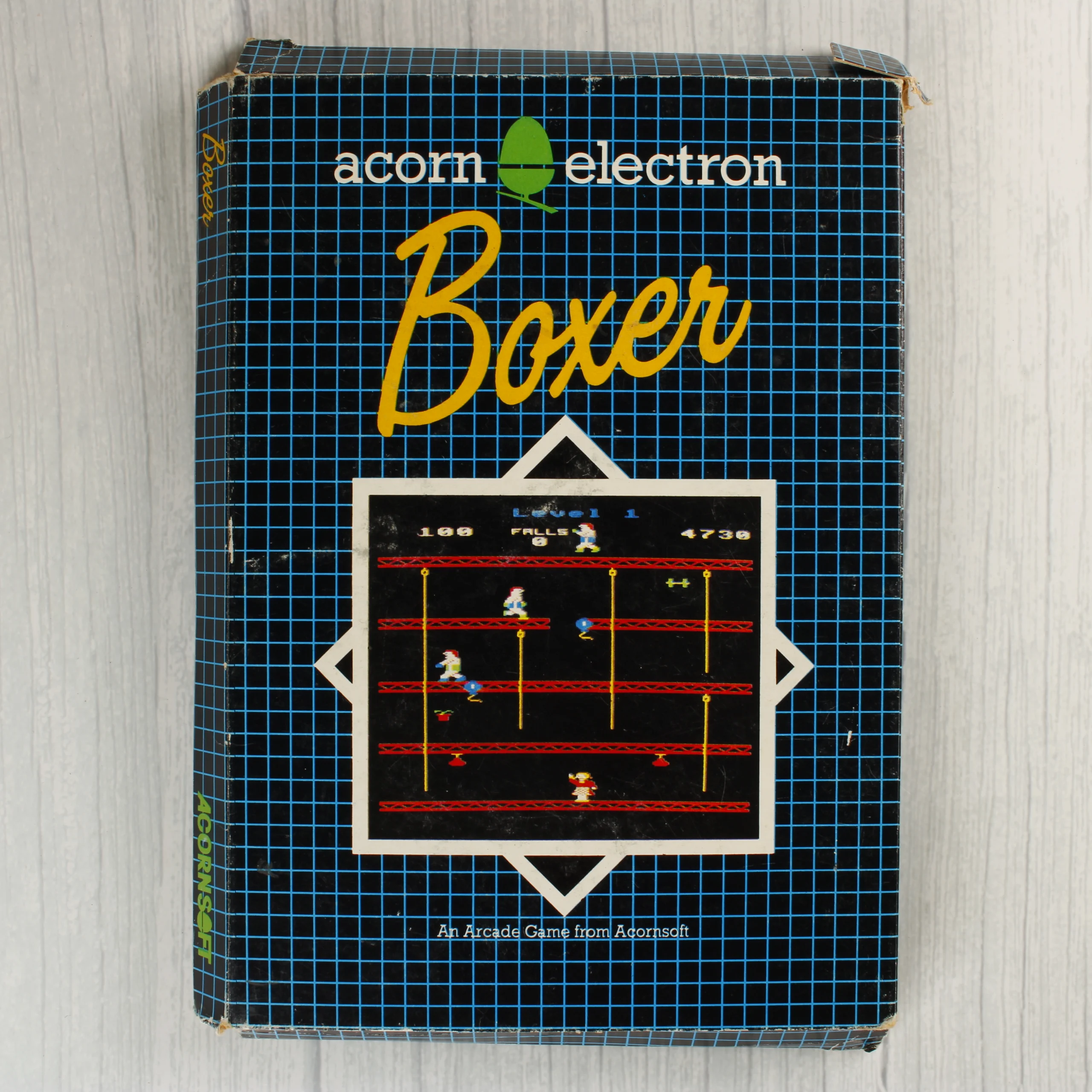 Az Acornsoft által kiadott Boxer egy klasszikus arcade stílusú videójáték Acorn Electron számítógéphez. A termék egy kék négyzethálós mintázatú kartondobozban található, amelynek elején a játék címe sárga betűkkel, alatta pedig egy illusztrált képernyőkép látható. A csomag tartalmazza az eredeti adathordozót, amely egy fekete színű kazetta, fehér címkével ellátva. A doboz hátoldalán angol nyelvű leírás olvasható a játékmenetről és a kompatibilitásról. A csomagolás anyaga papír és műanyag, a kazetta pedig mágnesszalagos technológiát használ.