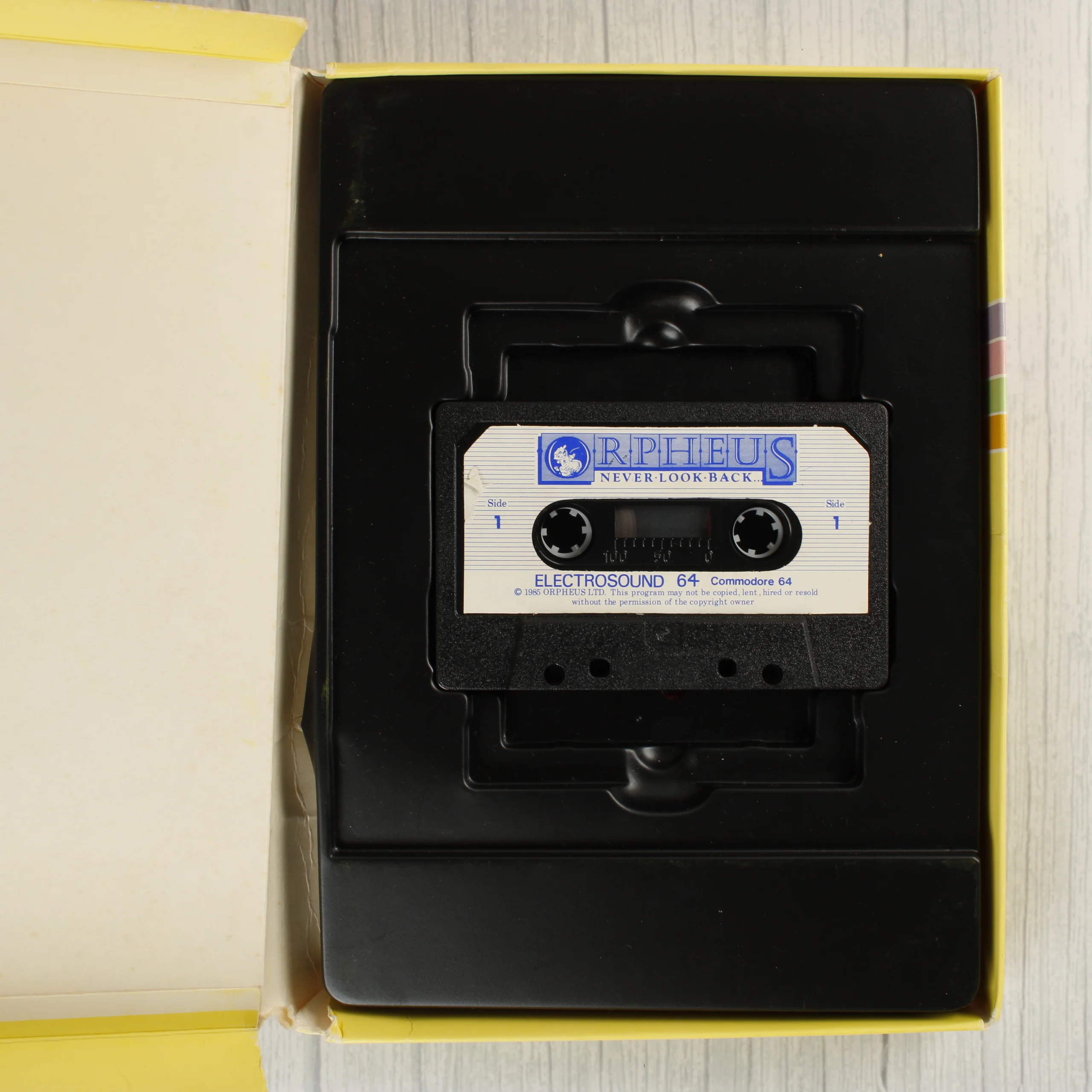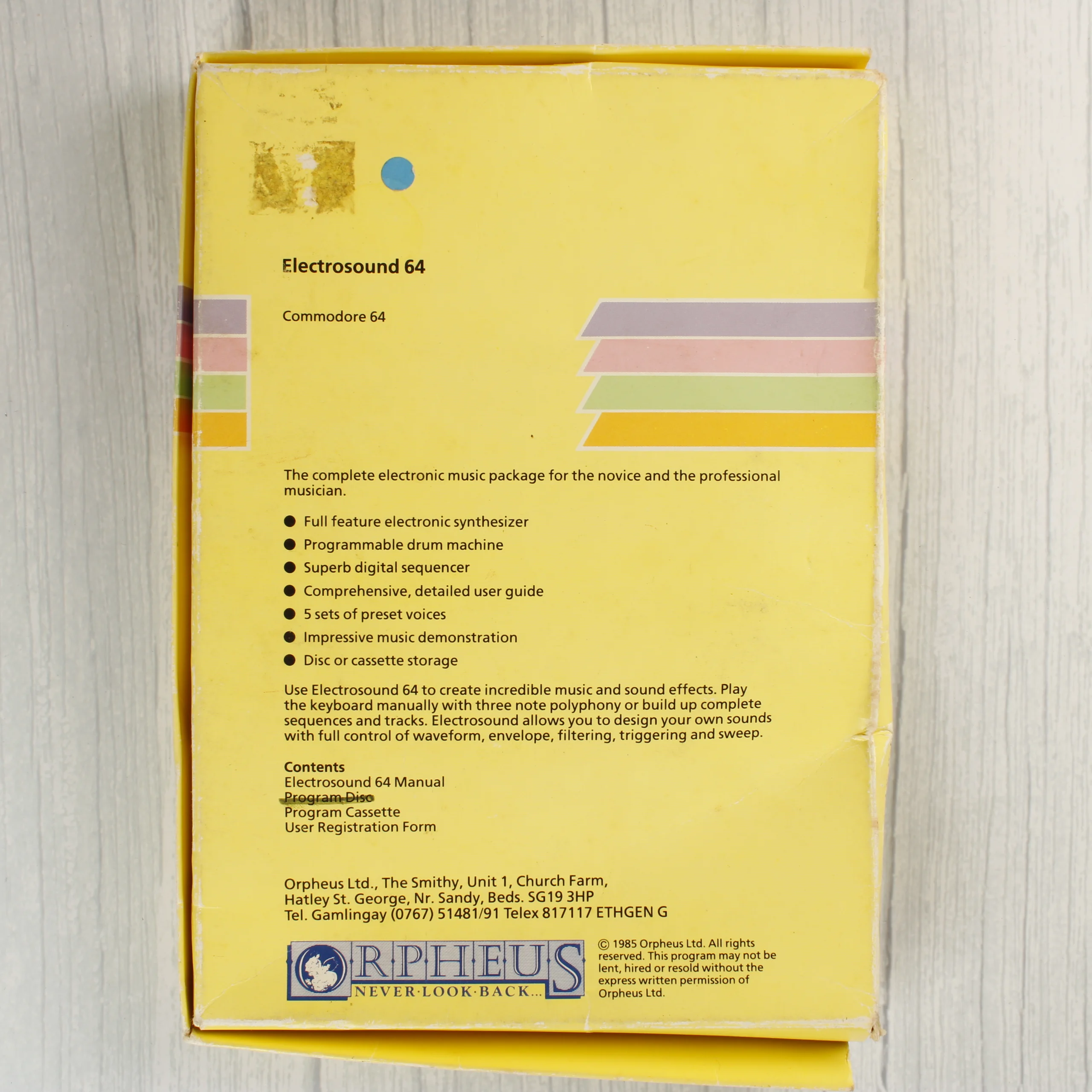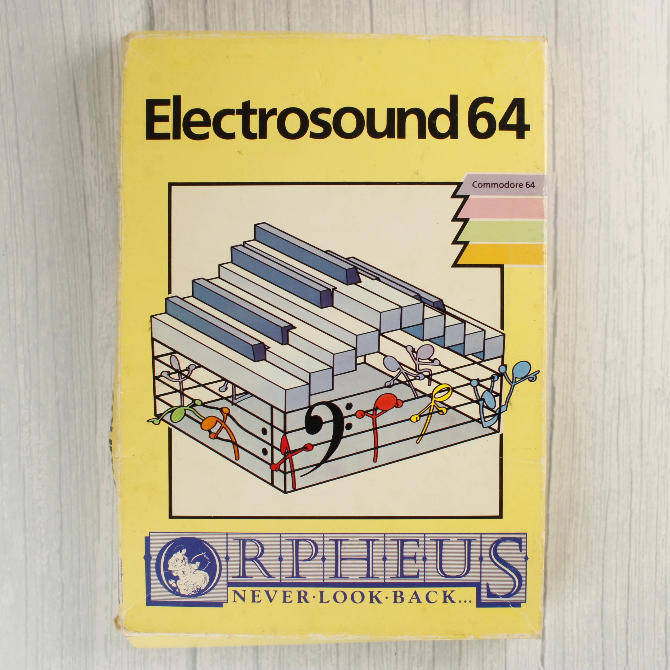 Az Electrosound 64 egy Commodore 64 számítógéphez készült zeneszerkesztő szoftver, amely sárga színű kartondobozban található. A csomag tartalmaz egy fekete műanyag tálcába helyezett magnetofonkazettát, amelyen a program adatai találhatók. A doboz elején egy stilizált zongorabillentyűzet és hangjegyek láthatók, valamint az Orpheus kiadó logója. A hátoldalon a szoftver funkcióinak leírása és a csomag tartalma olvasható angol nyelven. A doboz élei mentén kopások és kisebb benyomódások láthatók, a hátoldalon pedig egy régi árcímke vagy matrica eltávolításának nyoma és egy kék kör alakú jelölés észlelhető.