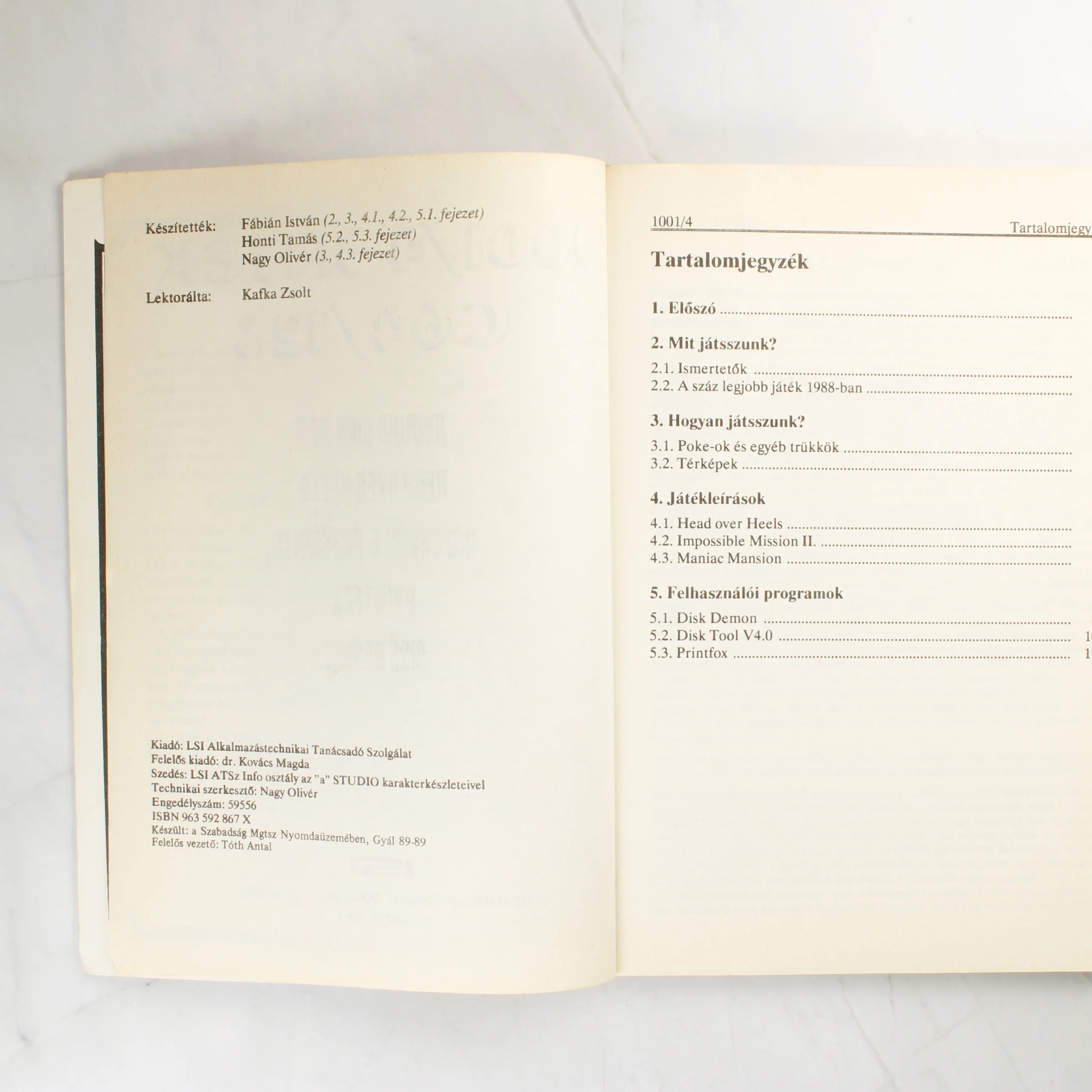 Ez a puhafedeles kiadvány az LSI Alkalmazástechnikai Tanácsadó Szolgálat gondozásában jelent meg, és a Commodore 64/128 számítógépek videójátékaihoz nyújt segítséget. A borítón színes, függőleges sávokból álló grafika látható, felette a 1001/4 Játék C64/128 felirat olvasható. A könyv olyan klasszikus címek leírásait és térképeit tartalmazza, mint a Maniac Mansion, a Head over Heels és az Impossible Mission II. A belső oldalakon részletes tartalomjegyzék található, amely kitér a játékismertetőkre, POKE-okra és felhasználói programokra is. A papír az idő múlásával enyhén sárgult, a borítón apróbb foltok és használati nyomok fedezhetők fel, de a kötés ép és a szöveg jól olvasható.