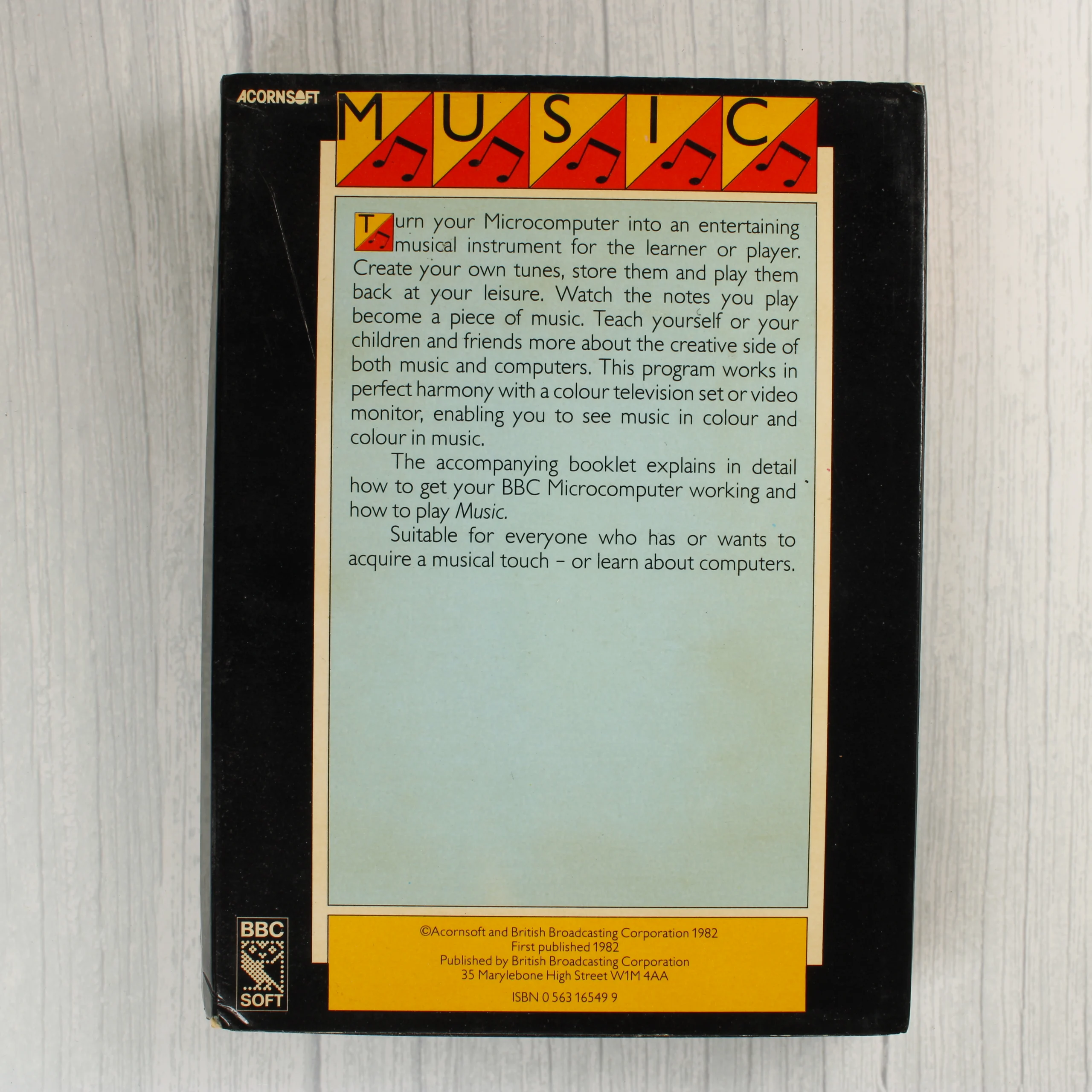 Az Acornsoft Music egy zeneszerkesztő szoftver BBC Microcomputer rendszerekhez, amely eredeti kartondobozos csomagolásban található. A fekete alapszínű dobozon színes, absztrakt grafika látható kottajegyekkel és hangjegyekkel. A csomag tartalmaz egy kék keretes, fekete házas magnókazettát, amelyen fehér címke található a szoftver nevével és a BBC Soft logójával. A doboz hátoldalán részletes angol nyelvű leírás olvasható a program funkcióiról, valamint a kiadási adatokról. A termék 1982-es kiadású, és a BBC Micro A és B modelljeivel kompatibilis.