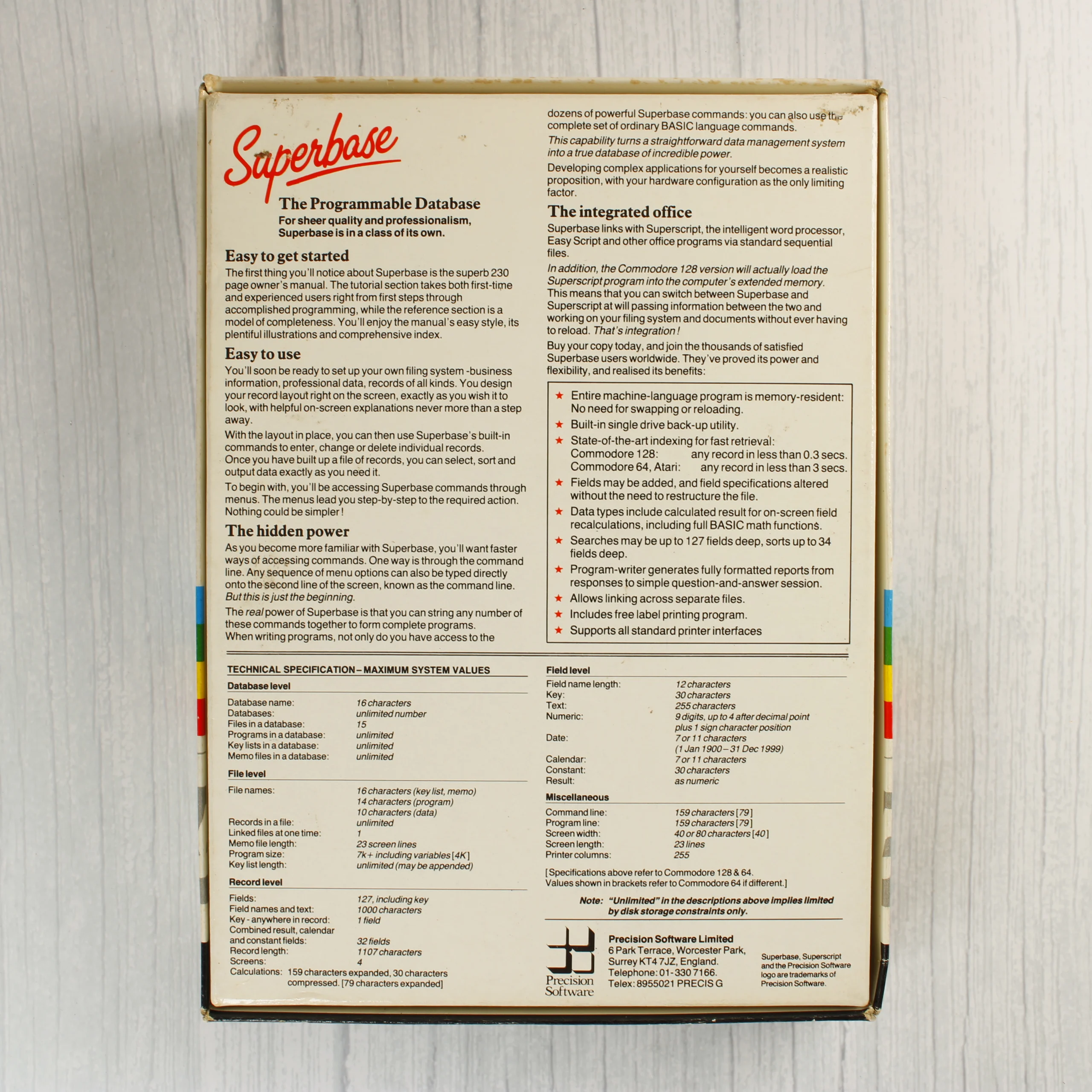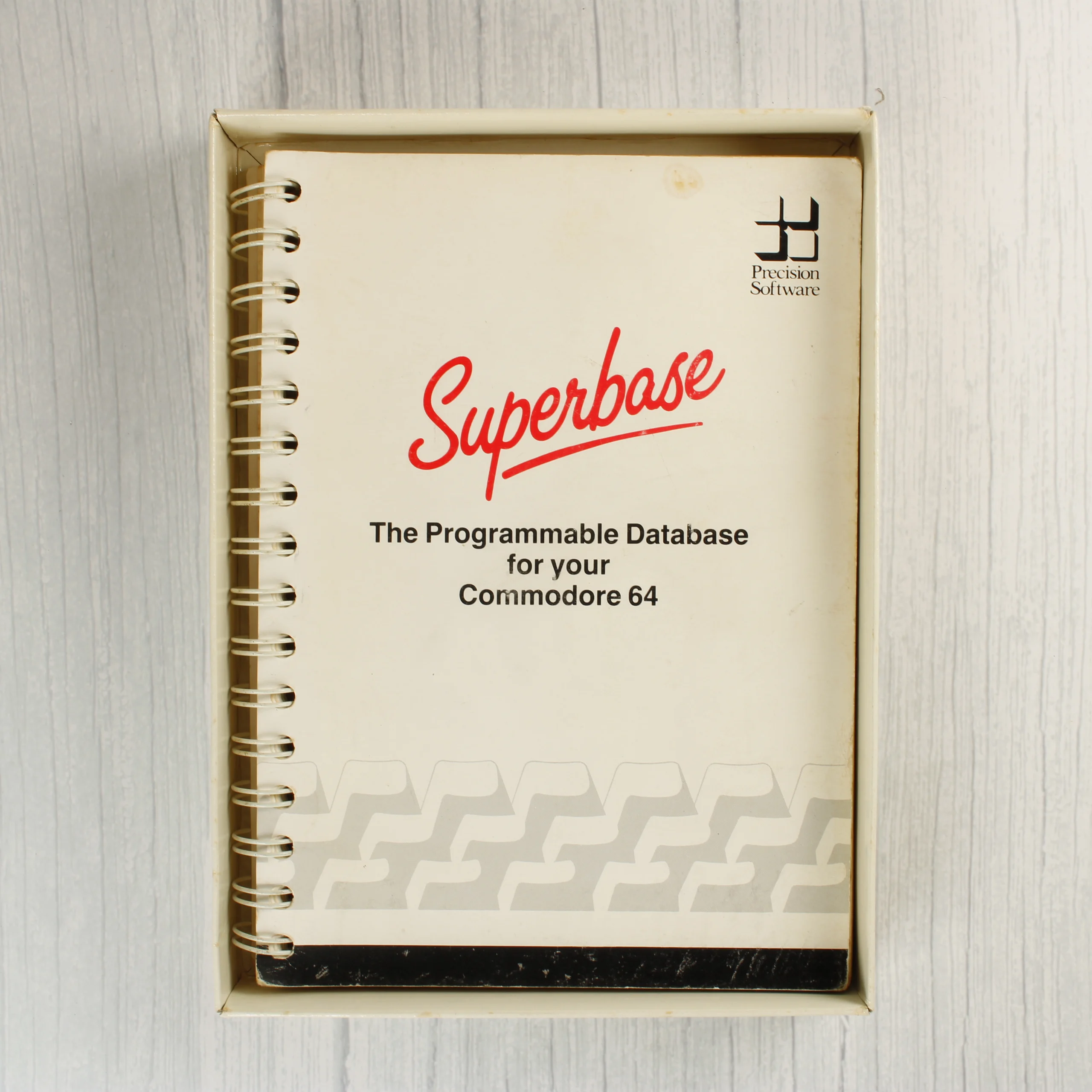 A Precision Software által kiadott Superbase egy programozható adatbázis-kezelő szoftver Commodore 64 és Plus/4 számítógépekhez. A csomag egy fehér alapszínű, színes sávokkal és grafikai elemekkel díszített kartondobozban található. A készlet tartalma egy 5,25 colos floppy lemez fekete védőtokban, egy spirálkötésű felhasználói kézikönyv, valamint egy Audio Learning Cassette feliratú magnókazetta, amely az oktatóanyagot tartalmazza. A doboz elején a Superbase logó piros dőlt betűkkel látható, alatta a funkciók rövid leírásával. A hátoldalon részletes technikai specifikációk és a szoftver képességeinek ismertetése olvasható. A termék korának megfelelő állapotban van, a papír alapú részeken enyhe sárgulás és használati nyomok fedezhetők fel.