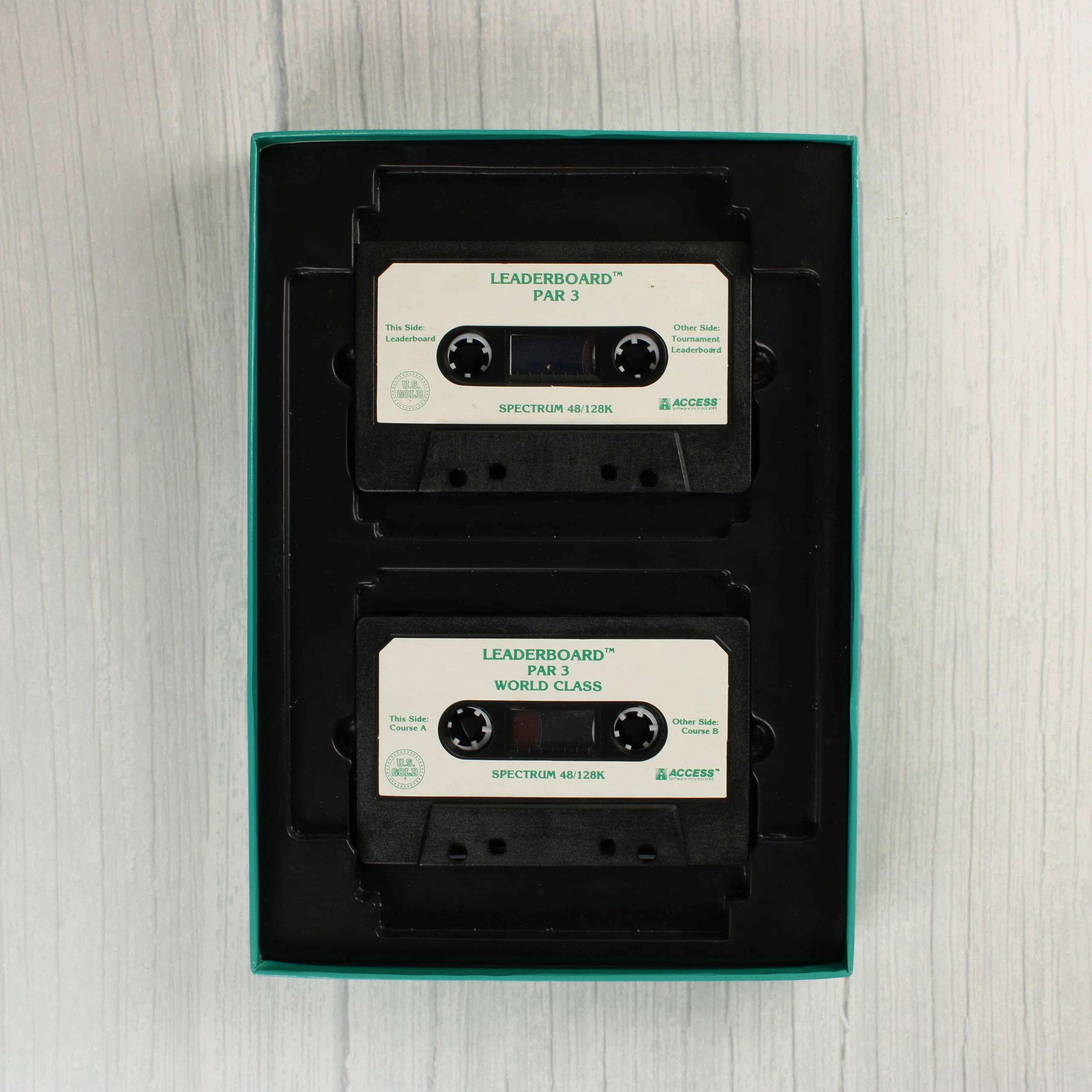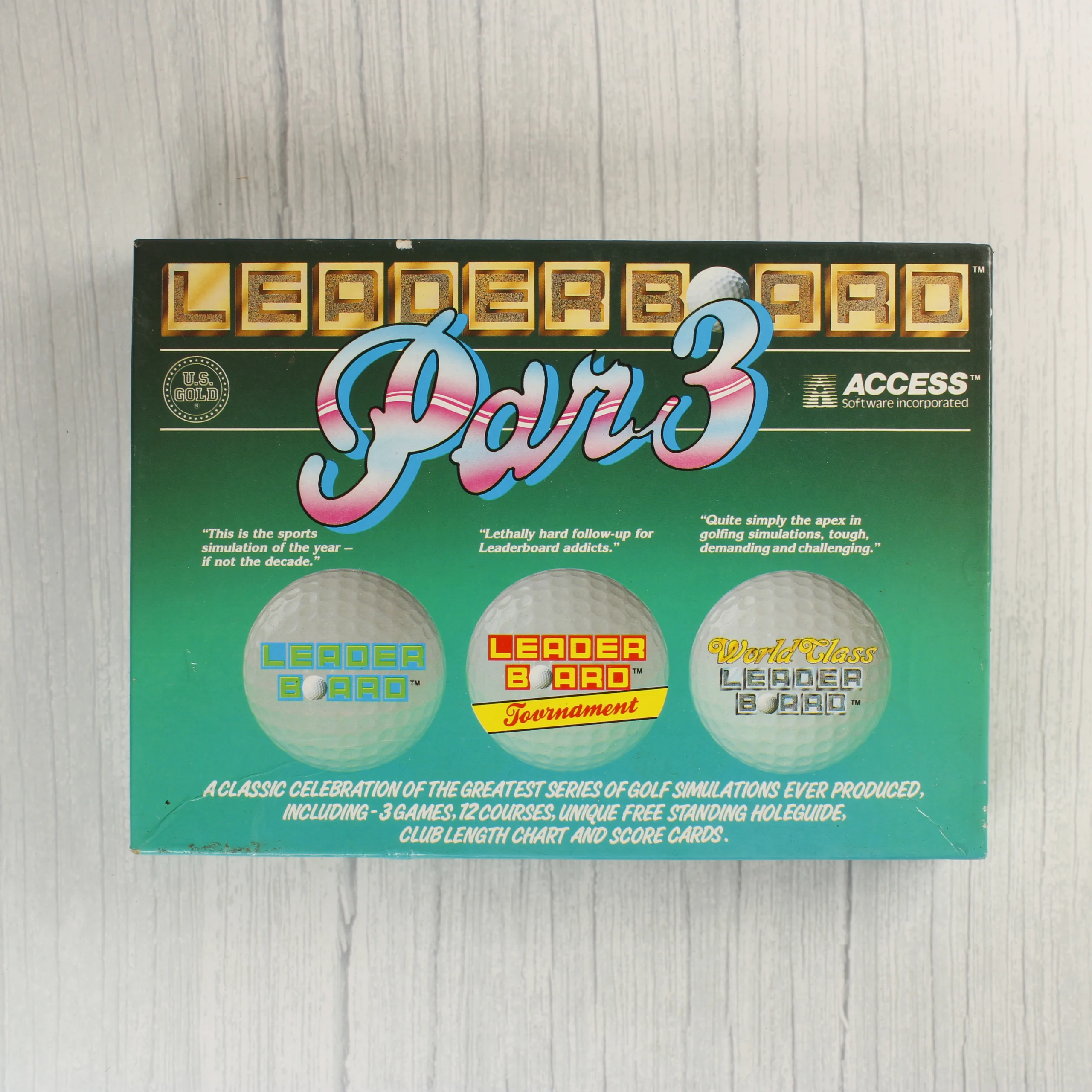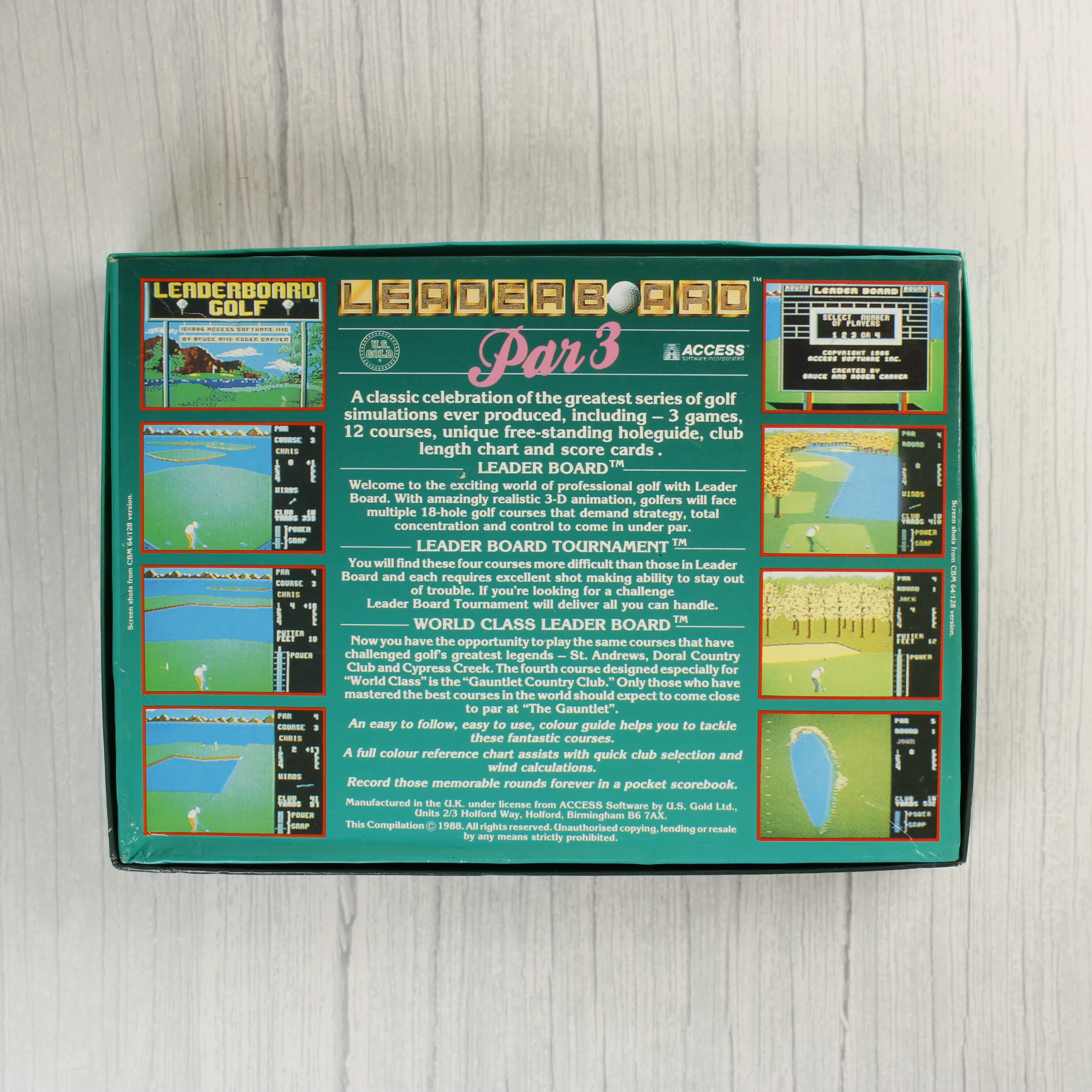 A Leader Board Par 3 című videójáték-gyűjtemény dobozos kiadása ZX Spectrum 48/128K platformra. A csomag három golfszimulációs játékot tartalmaz: Leader Board, Leader Board Tournament és World Class Leader Board. A zöld alapszínű kartondoboz elején három golflabda látható a játékok logóival, a hátoldalon pedig színes képernyőmentések és angol nyelvű leírás olvasható. A készlet tartalmaz egy színes, illusztrált segédletet a golfütők és az erőnléti mutatók használatához. A szoftverek két darab fekete műanyag kazettán kaptak helyet, amelyek egy fekete műanyag tálcában fekszenek a dobozon belül. A kiadvány az U.S. Gold és az Access Software gondozásában jelent meg 1988-ban.