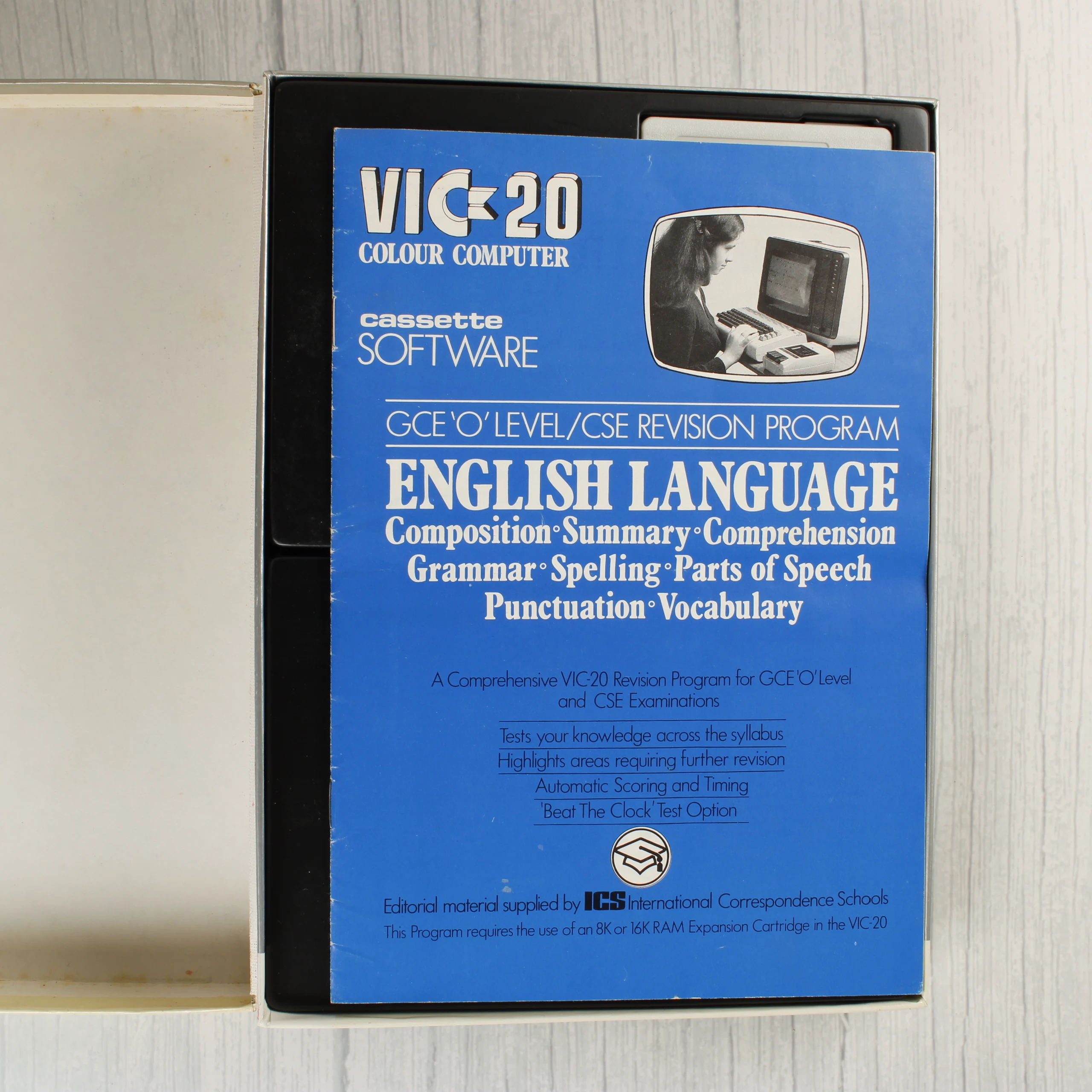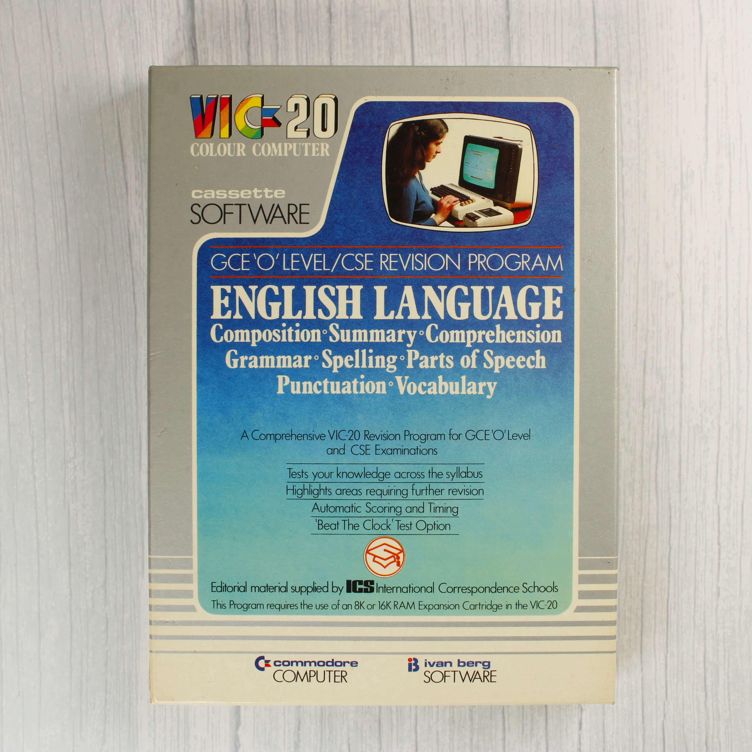 Egy Commodore VIC-20 számítógéphez készült oktatószoftver csomag, amely az angol nyelvvizsgára való felkészítést segíti. A készlet egy nagyméretű, szürke alapszínű kartondobozban található, amelyen kék és fehér feliratok, valamint egy számítógép előtt ülő nőt ábrázoló illusztráció látható. A csomag két darab magnókazettát tartalmaz: az egyik az operációs szoftvert, a másik az adatokat hordozza. A kazetták fehér műanyag házasok, fekete feliratokkal. A készlethez tartozik egy kék borítójú használati útmutató vagy füzet is. A doboz és a belső tartalom korának megfelelő, megkímélt állapotban van, a papír részeken minimális sárgulás és élkopás figyelhető meg.