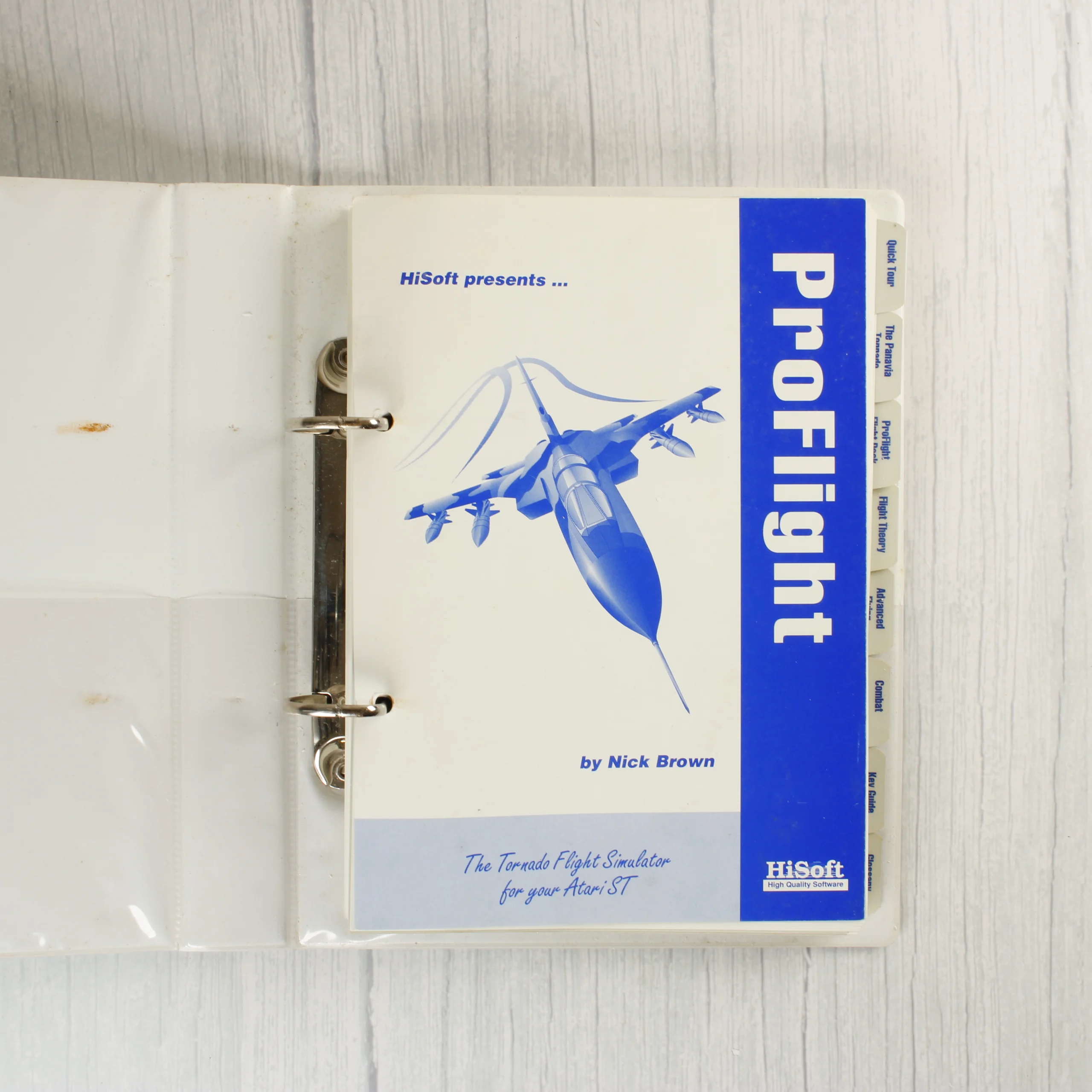 A HiSoft által kiadott ProFlight egy Panavia Tornado repülőgép-szimulátor Atari ST számítógépekre. A csomag tartalmazza az eredeti kartondobozt, amelyen egy vadászgép látható akció közben, egy kék színű 3,5 colos floppy lemezt, valamint egy gyűrűs mappába rendezett, több fejezetre osztott felhasználói kézikönyvet. A doboz hátoldala részletes műszaki leírást és képernyőképet tartalmaz a játékról. A szoftver Nick Brown munkája. A fizikai hordozón kézzel írt sorozatszám látható. A dokumentáció tiszta, fehér lapokon, kék feliratozással készült, és rendszerező fülekkel van ellátva a könnyebb kezelhetőség érdekében.