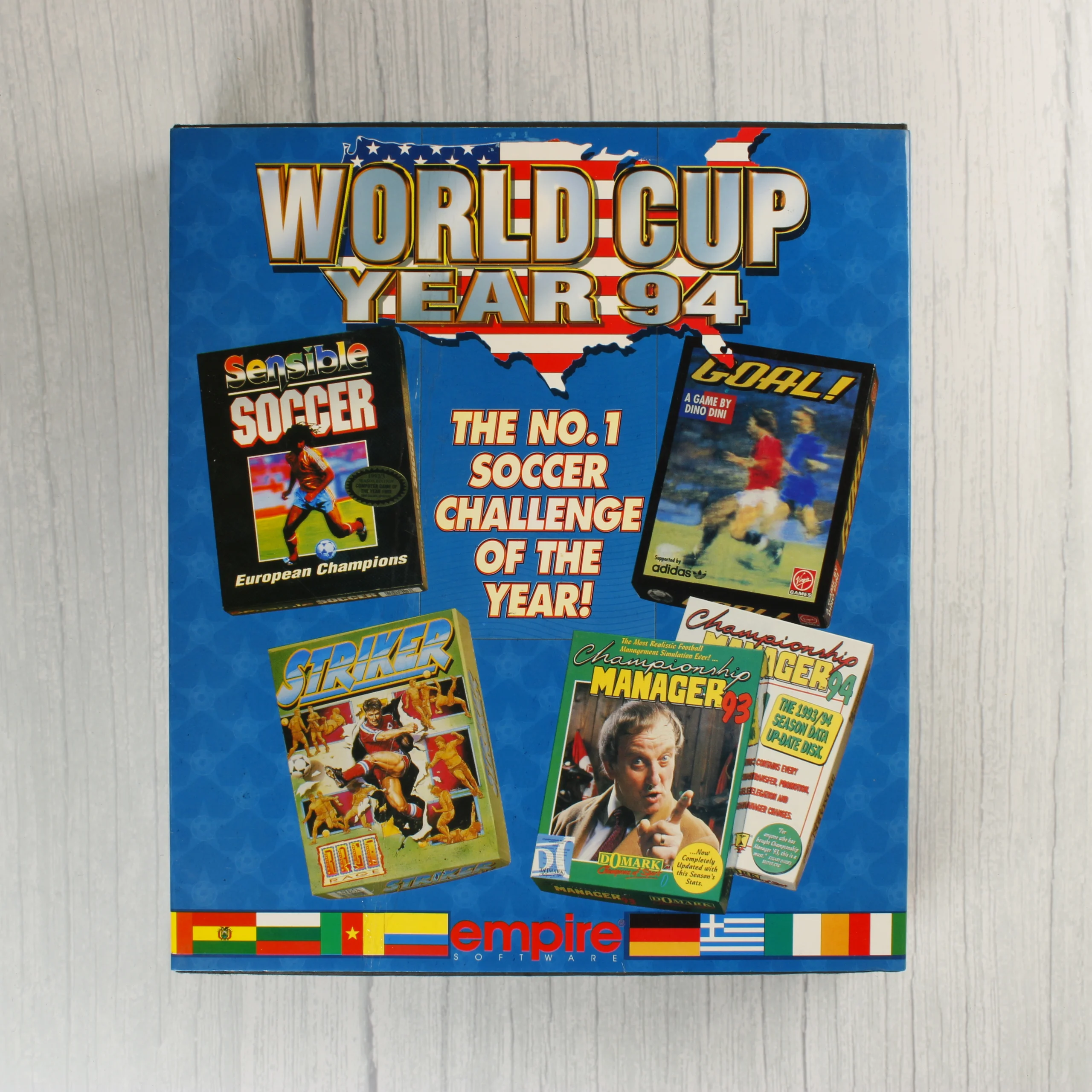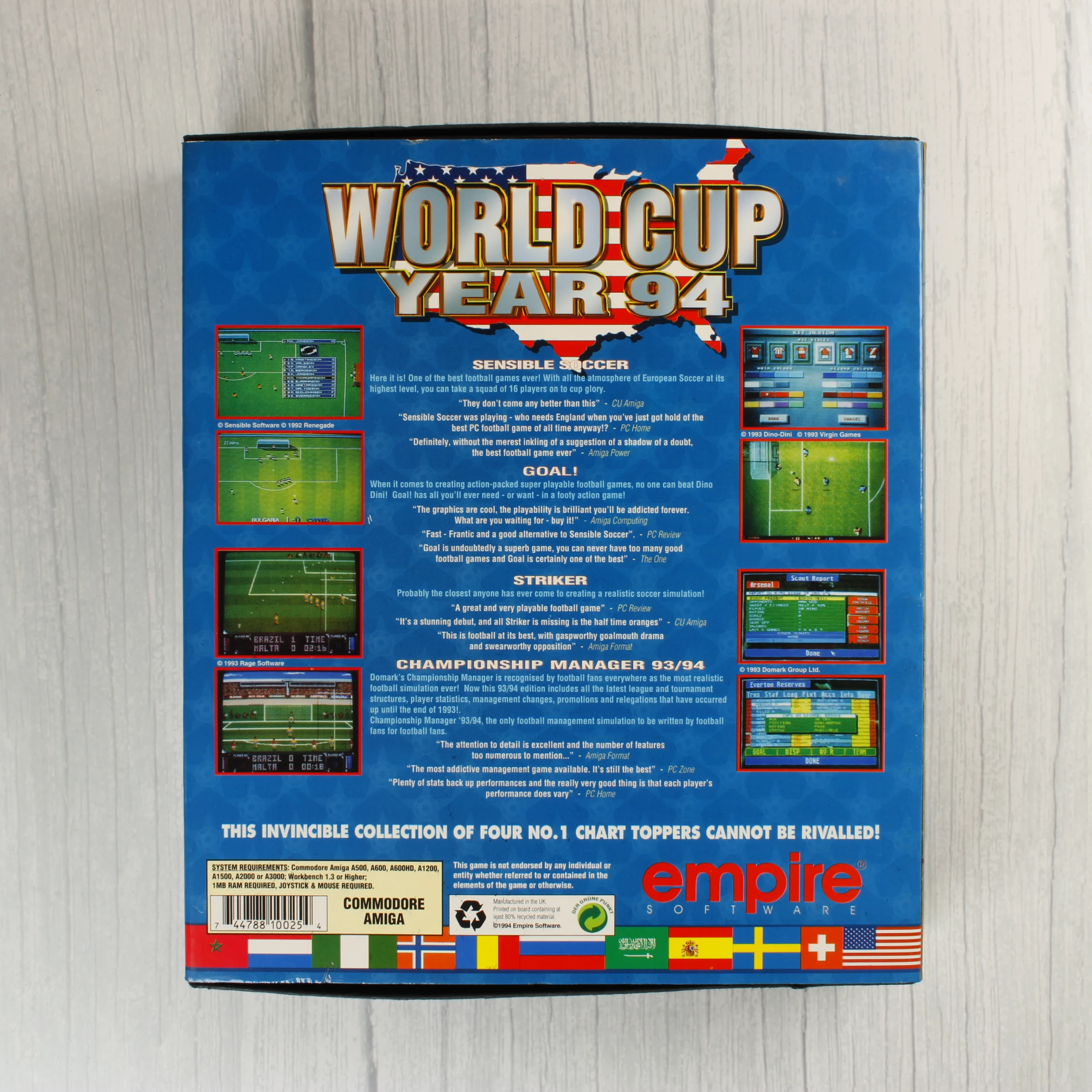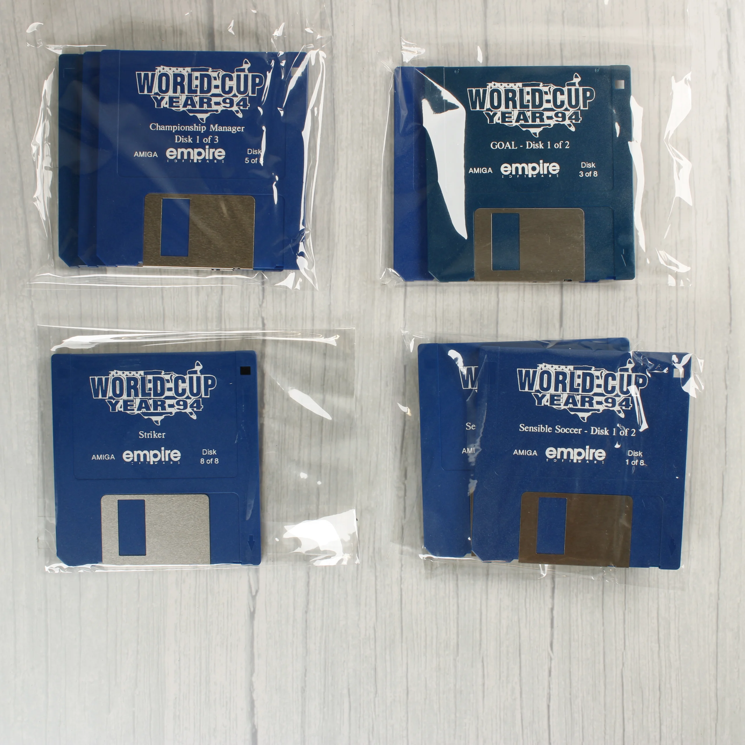 World Cup Year 94 válogatás Commodore Amiga platformra. Tartalmazza a Sensible Soccer, Goal!, Striker és Championship Manager játékokat floppy lemezen.