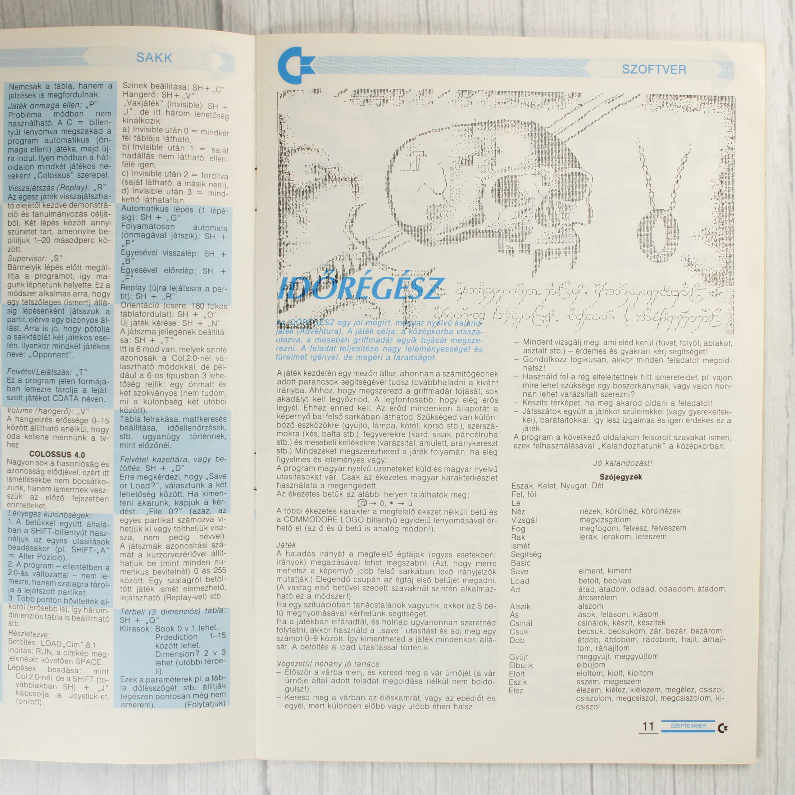 A Commodore újság 1988. szeptemberi száma (1988/9). A borítón kék és fekete négyzethálós háttér előtt szürreális grafikai elemek láthatók, többek között egy Commodore 64 számítógép, egy cilinderes figura, egy floppy lemezből készült óra és egy monitor. A címlapon olyan témák szerepelnek, mint a számítógépes sakk, programok és pályázatok. A belső oldalakon szoftverismertetők és technikai leírások olvashatók, például az Időregész című játékról. A kiadvány az Országos Commodore Egyesület lapja. A papír a korának megfelelő állapotú, a széleken enyhe kopás és sárgulás tapasztalható.