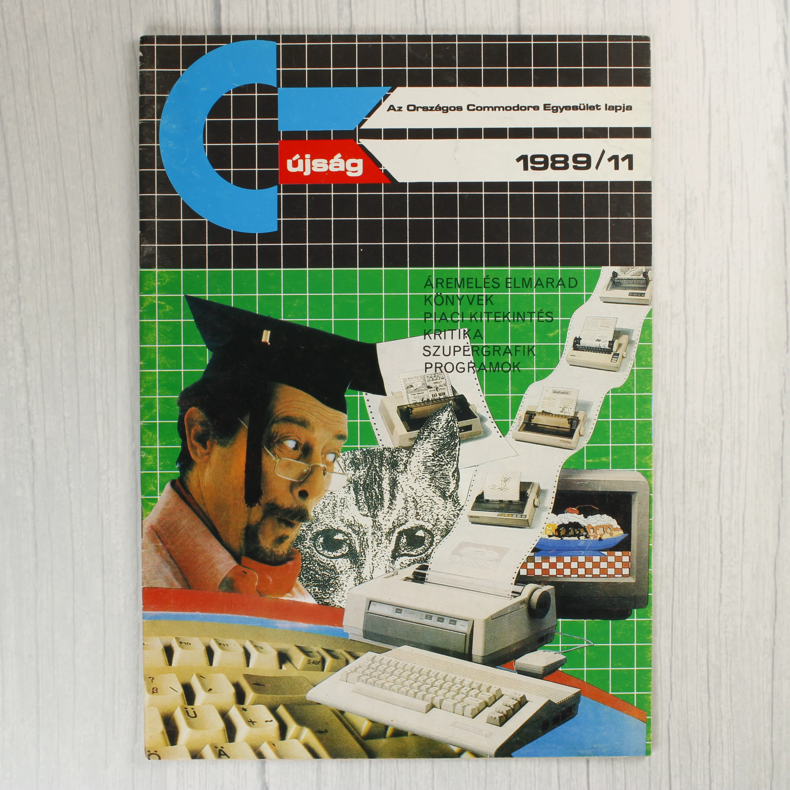 A Commodore újság 1989. novemberi száma (1989/11), amely az Országos Commodore Egyesület lapja. A borítón egy szemüveges, diplomás kalapot viselő férfi látható, mellette egy macska grafikája és egy Commodore számítógép billentyűzete, valamint egy nyomtatóból kijövő papírszalag. A háttér fekete és zöld négyzethálós mintázatú. A belső oldalakon könyvismertetők, hirdetések és technikai leírások találhatók, többek között a Commodore PLUS/4-es géppel kapcsolatban. A papír az idő múlásával enyhén sárgult, de a szövegek és az illusztrációk tisztán kivehetőek.