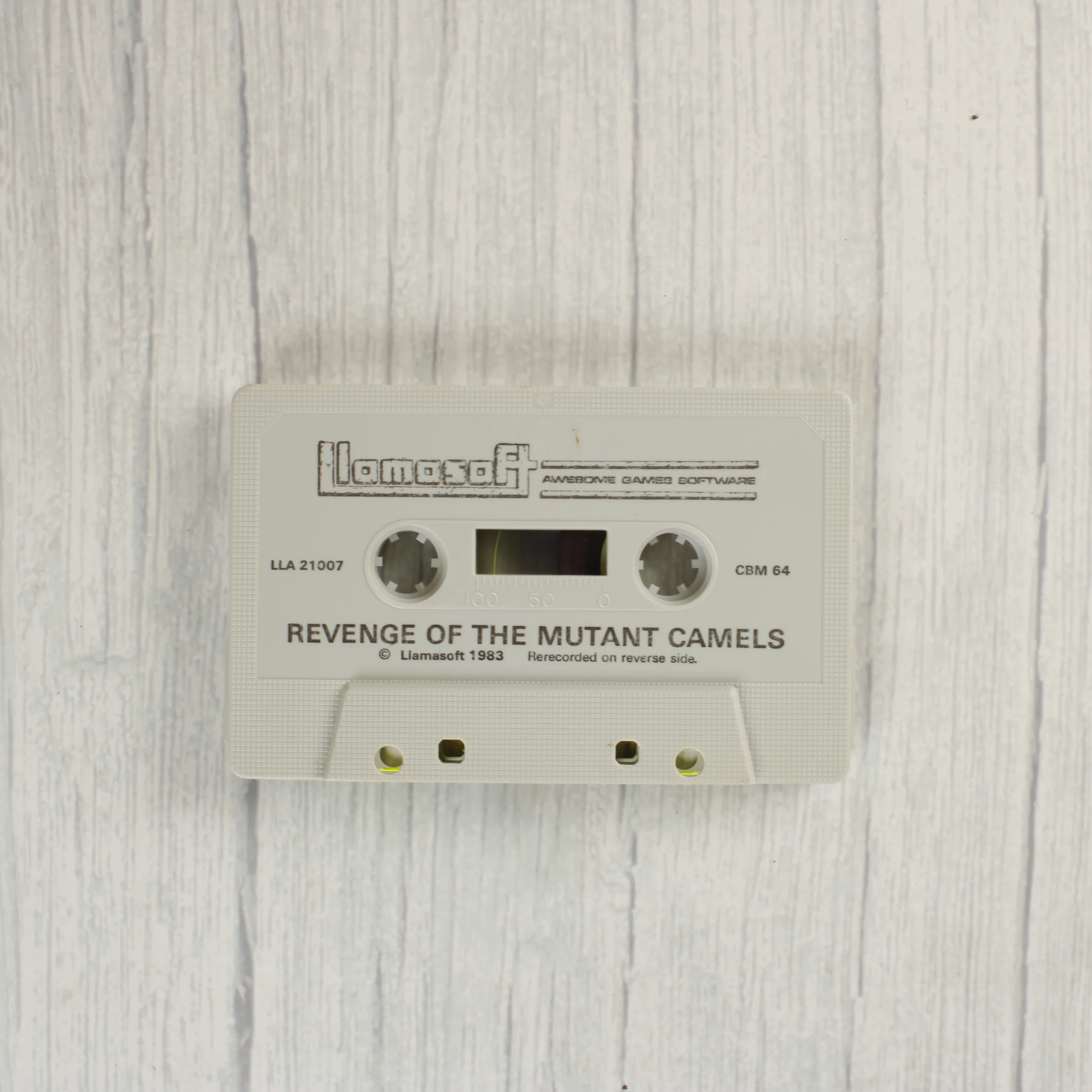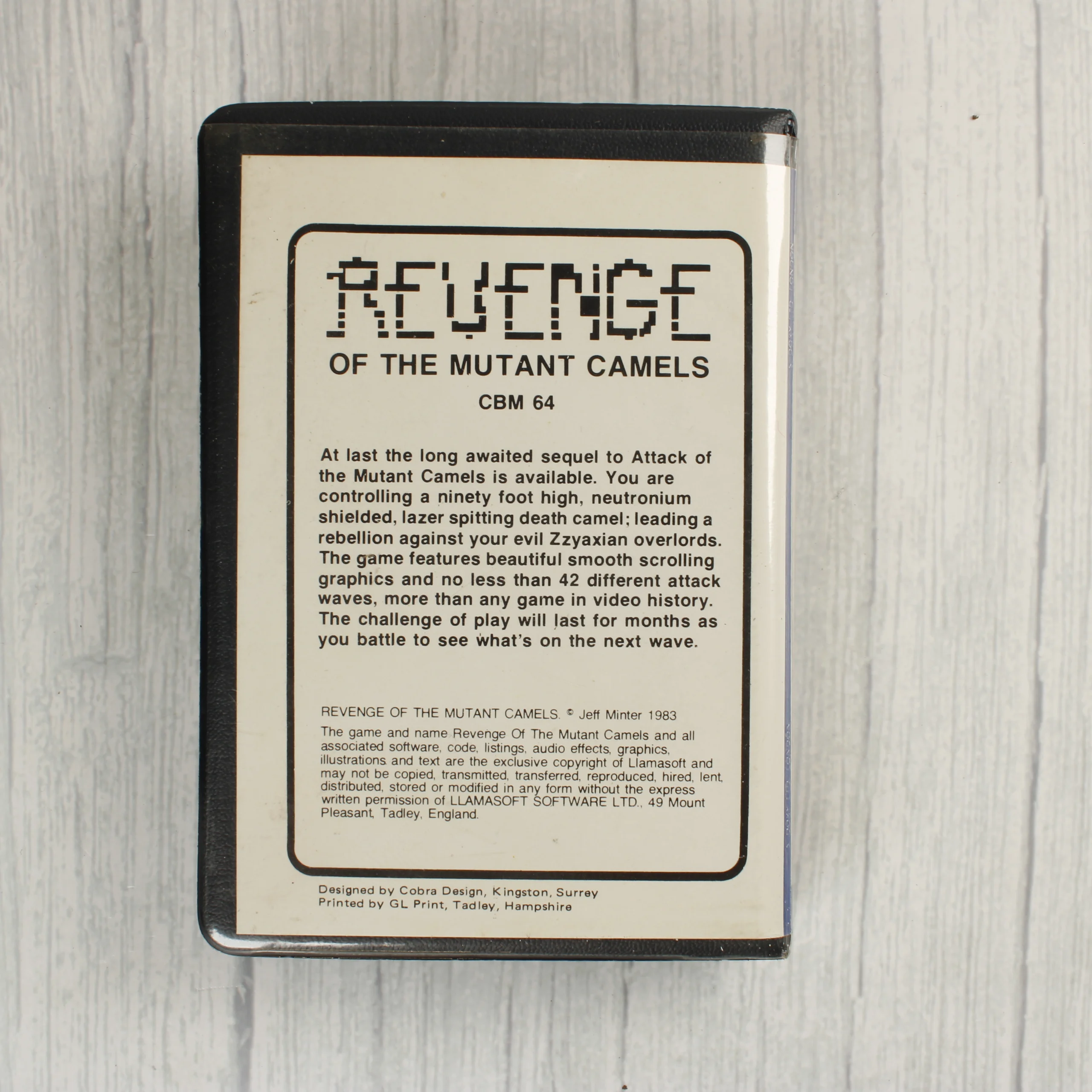 A Revenge of the Mutant Camels című videójáték Commodore 64 platformra készült kiadása. A csomag egy fekete műanyag tokot tartalmaz, amelyben egy színes, illusztrált borító található. A borítón szürreális sivatagi jelenet látható piramisokkal és egy központi teve figurával. A hátoldalon a játék leírása és a Llamasoft kiadói adatai olvashatóak. A készlet része egy világosszürke színű adathordozó kazetta, amelyen fekete feliratok jelzik a címet, a kiadót és a CBM 64 kompatibilitást. A kazetta felülete texturált, a szalag láthatóan ép a betekintő ablakon keresztül.