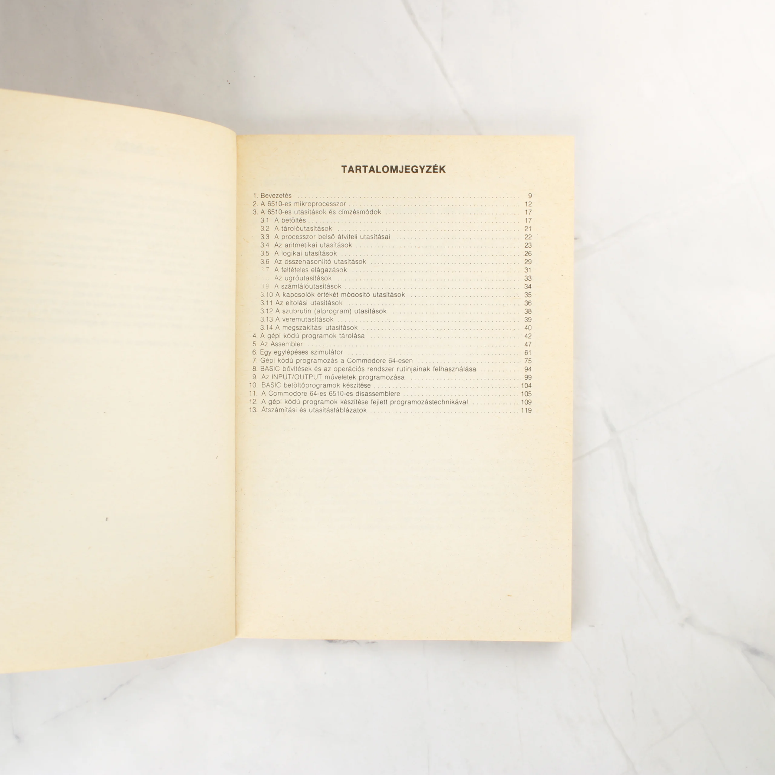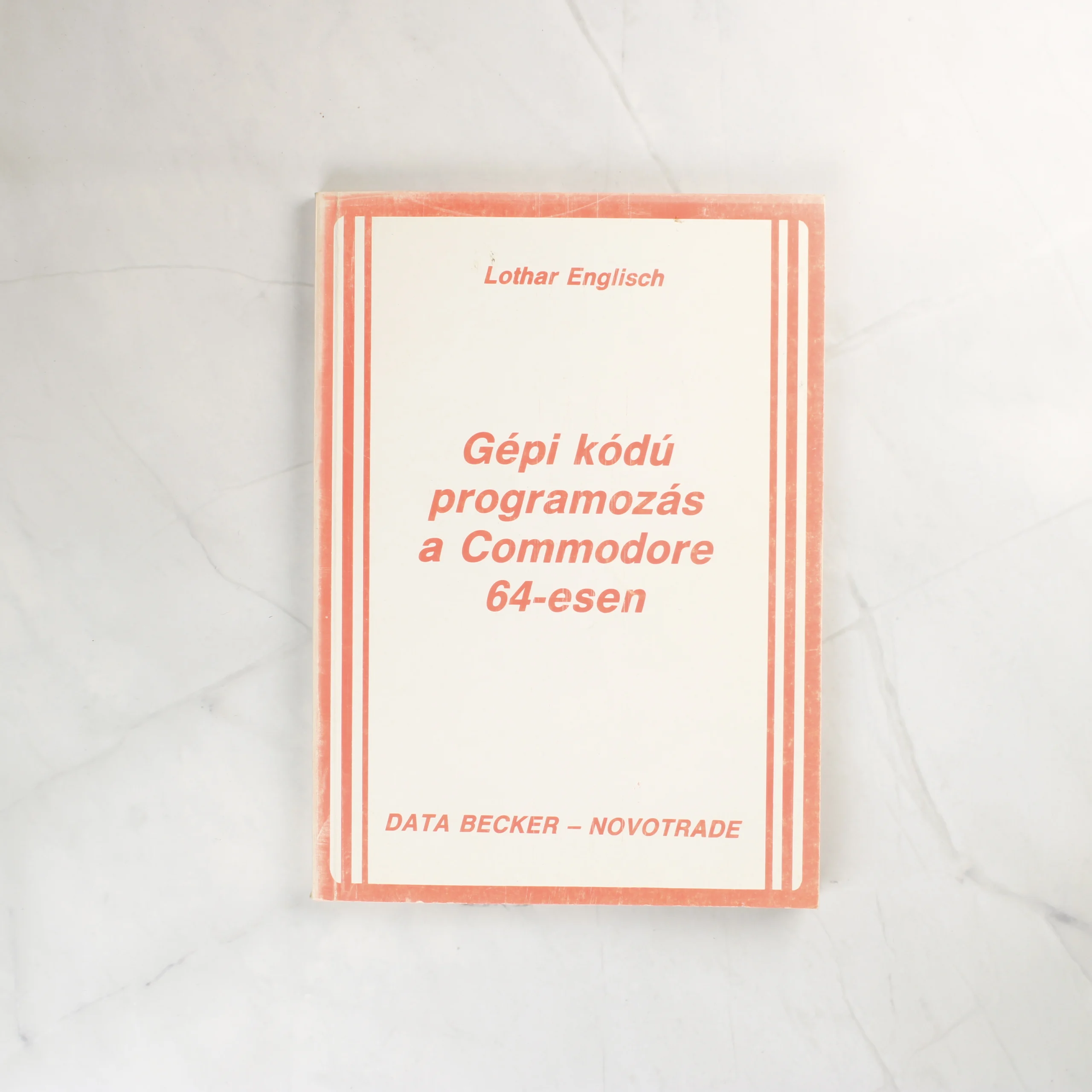 Lothar Englisch Gépi kódú programozás a Commodore 64-esen című szakkönyve a Data Becker és a Novotrade gondozásában jelent meg. A puhafedeles kiadvány borítója fehér alapszínű, narancssárga kerettel és feliratokkal. A borítón látható függőleges sávok és a tipográfia a korszak technikai könyveire jellemző stílust tükrözik. A belső oldalakon a tartalomjegyzék olvasható, amely részletesen tárgyalja a 6510-es mikroprocesszor utasításkészletét, az assemblert és a különböző programozási technikákat. A papír az idő múlásával enyhén sárgult, ami a korának megfelelő természetes állapot. A könyv élei és sarkai minimális kopást mutatnak, de a kötés épnek tűnik.