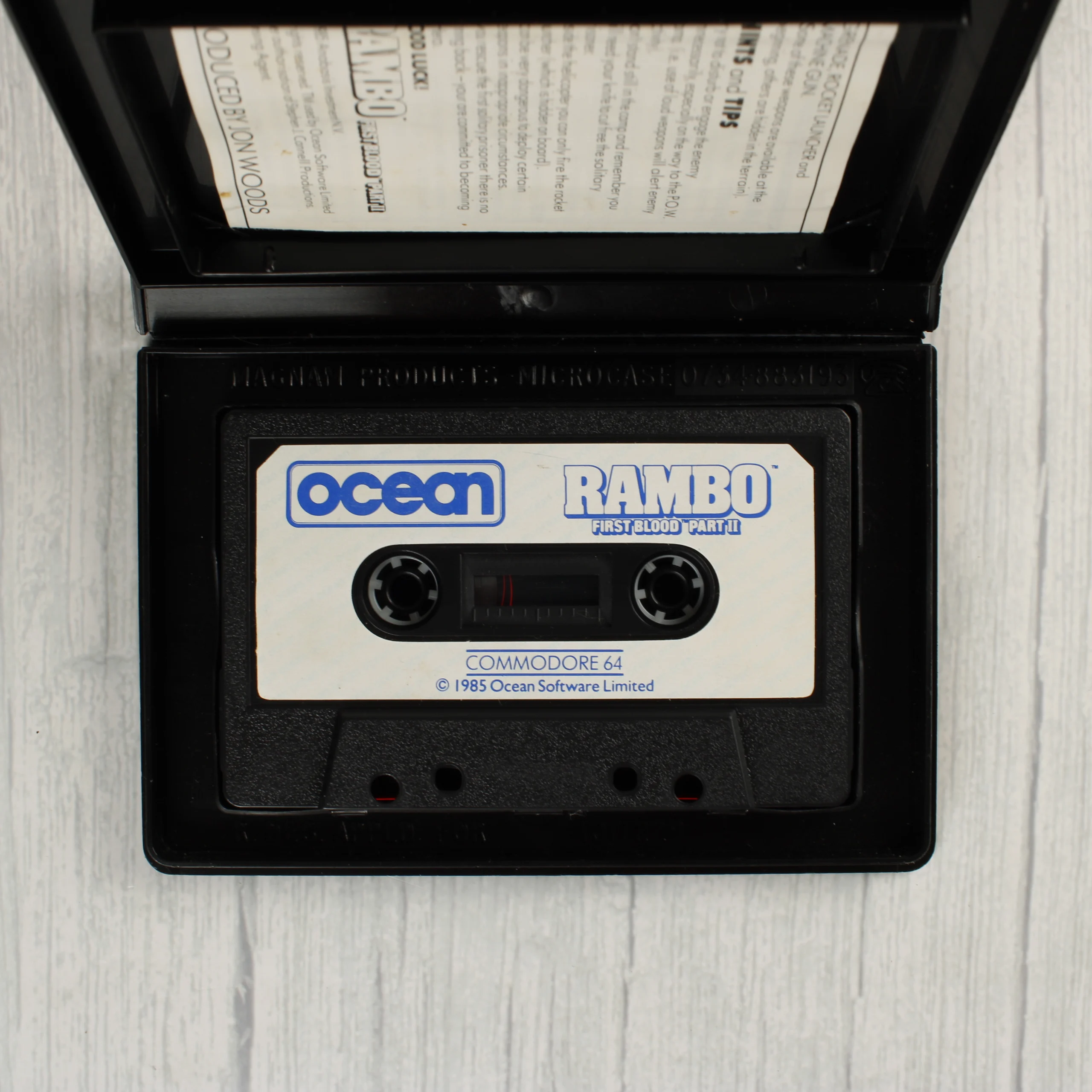 A Rambo: First Blood Part II című videójáték Commodore 64 platformra készült kiadása. A csomag egy fekete műanyag tokot tartalmaz, amelyben egy mágnesszalagos kazetta és egy nyomtatott használati útmutató található. A borítón Sylvester Stallone látható Rambo szerepében, amint egy rakétavetőt tart. A grafika élénk narancssárga és vörös színeket használ a háttérben. A kazetta fehér címkével rendelkezik, amelyen kék színnel szerepel az Ocean logó és a játék címe. A tok hátoldalán a játék rövid leírása és egy vonalkód látható. A termék az 1985-ös évből származik, az Ocean Software Limited gondozásában jelent meg.